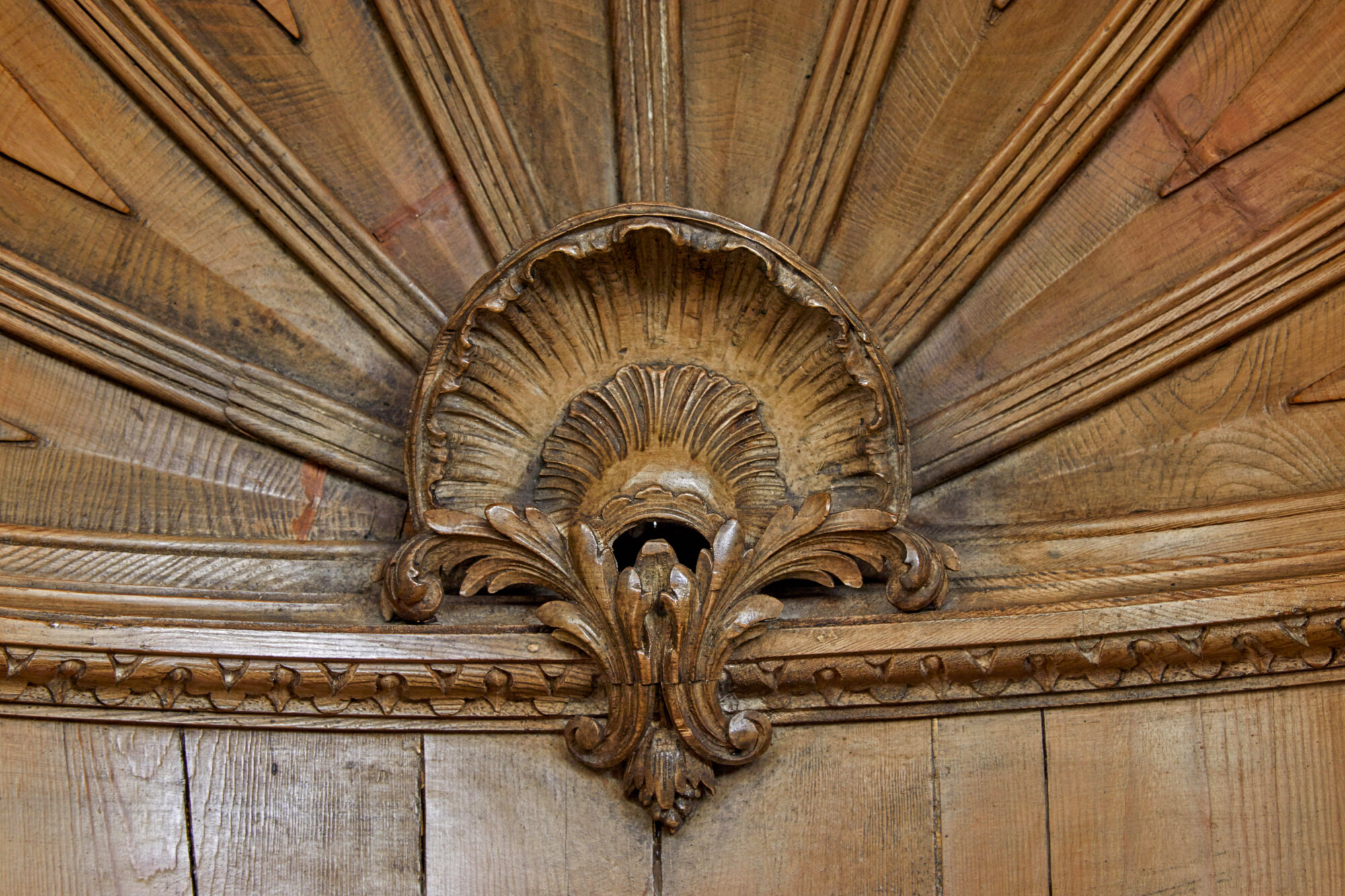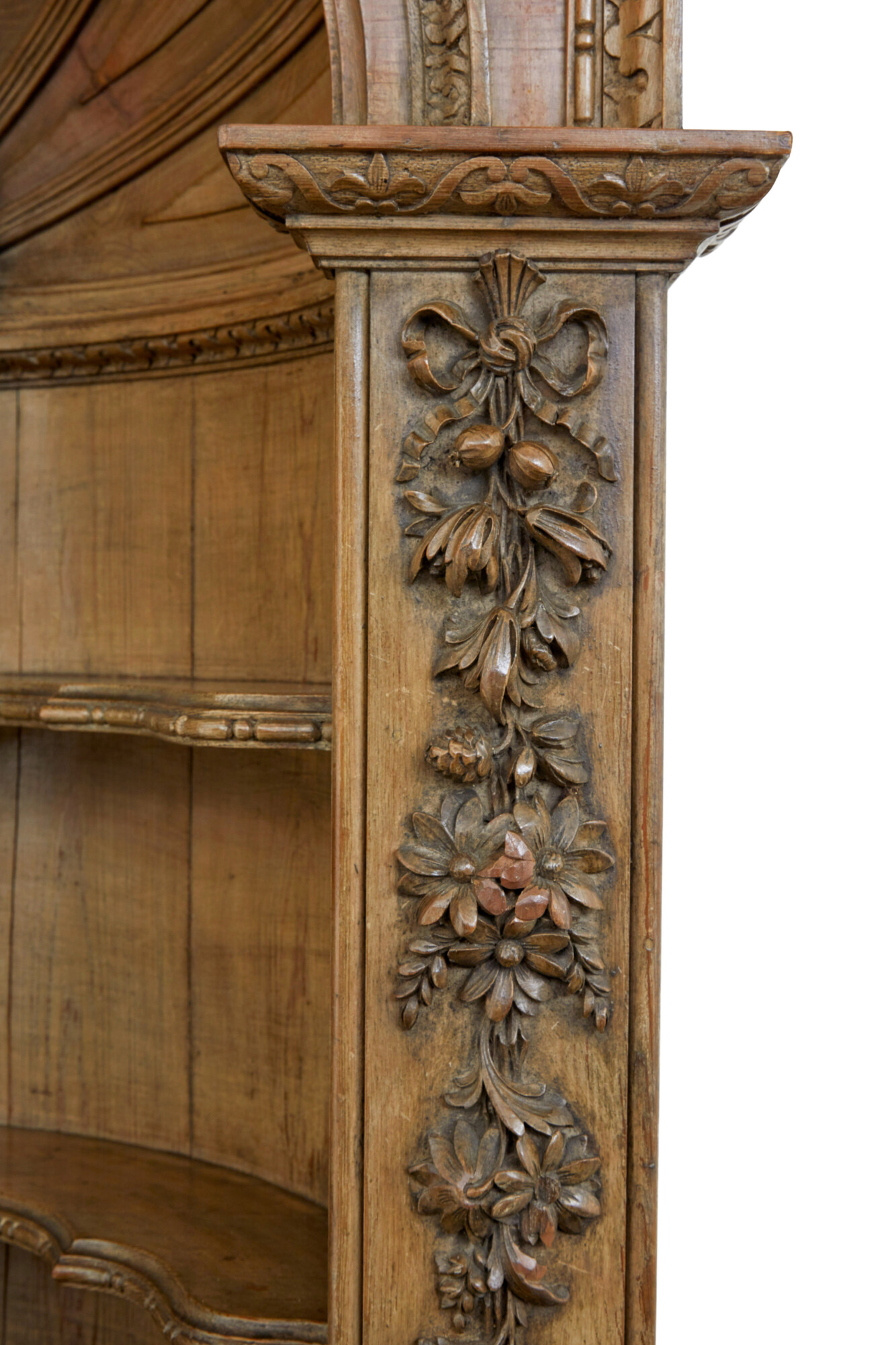 ARCHITECTURAL CARVED CORNICE, DECORATED WITH APPLIED CARVED FLORALS AND SWAGS. INTERIOR OF A STUNNING DOME WITH CENTRAL CARVED SHELL, A FURTHER 3 SHAPED SHELVES, WITH A DOUBLE DOOR CUPBOARD BELOW.