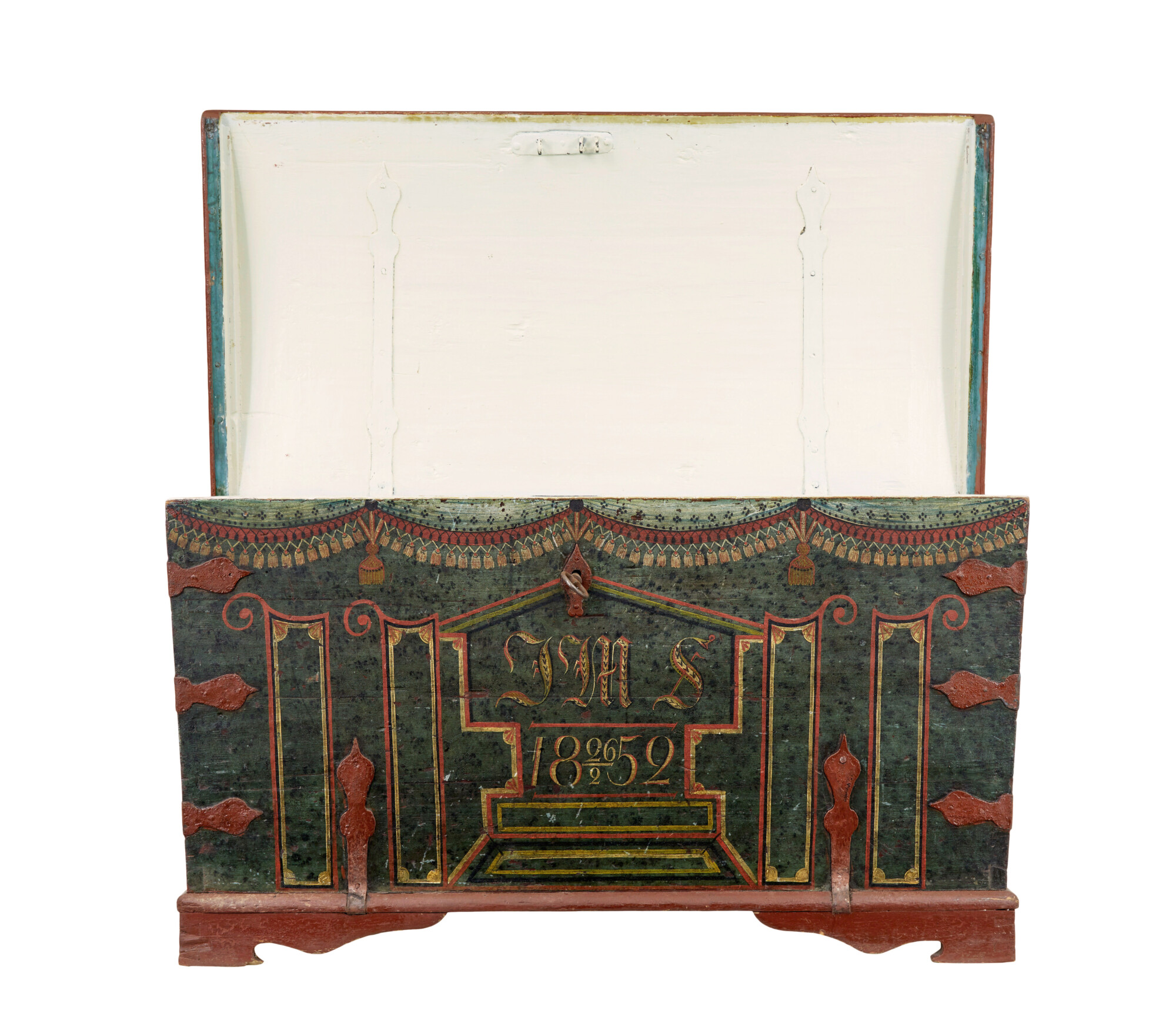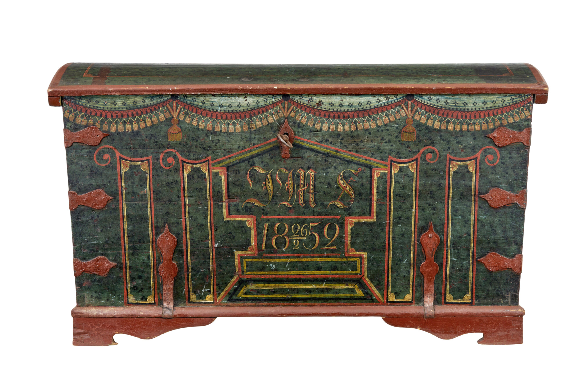 PROFUSELY HAND PAINTED FRONT WITH TASSELS AND BORDERS, INITIALED ON THE FRONT JMS AND DATED 1852 26TH OF FEBRUARY. BROWN PAINTED STRAP WORK, LID EDGE AND FEET. LID OPENS WITH WORKING LOCK AND KEY TO REVEAL A LATER PAINTED INTERIOR, WHICH IS MISSING IT’S USUAL CANDLE BOX.