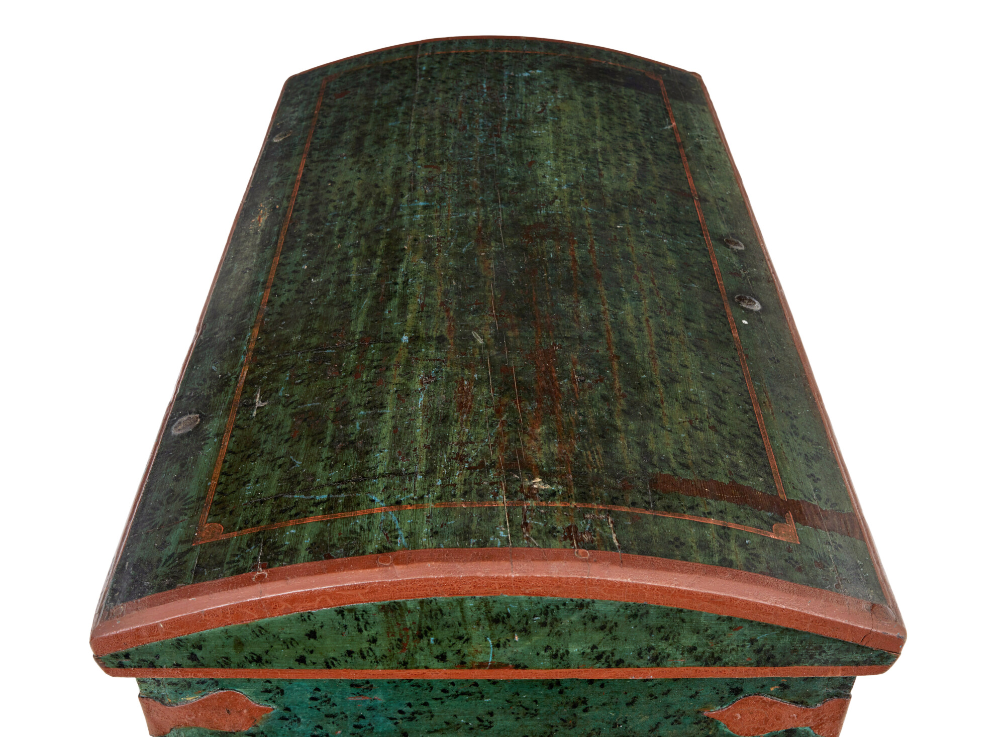 BEAUTIFUL DOME TOP COFFER MADE FROM SOLID OAK. HAND PAINTED USING TRADITIONAL METHODS IN A GREEN, BROWN AND YELLOW SCHEME.