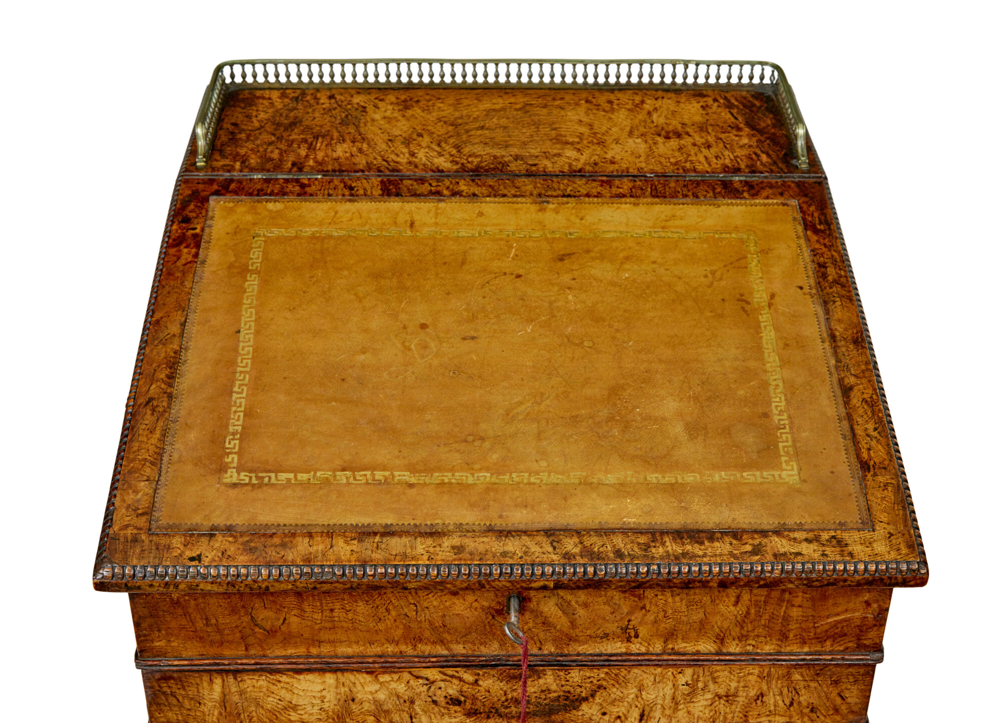 TOP SURFACE WITH ORIGINAL BRASS GALLERY, LEADING DOWN TO THE BROWN LEATHER WRITING SURFACE WITH GOLD TOOLING. WRITING SECTION PULLS FORWARD TO ALLOW A GENEROUS KNEE HEIGHT OF 25 INCHES. HINGED LID OPENS TO REVEAL AN OPEN STORAGE WELL AND 4 DRAWERS, 2 OF WHICH ARE DUMMY DRAWERS, 1 HANDLE PULLS OUT TO ALLOW A SECRET PEN TRAY TO BE PULLED OUT FROM THE SIDE. WORKING LOCK AND KEY.