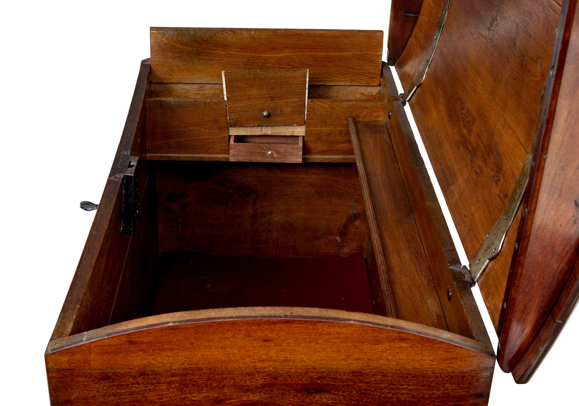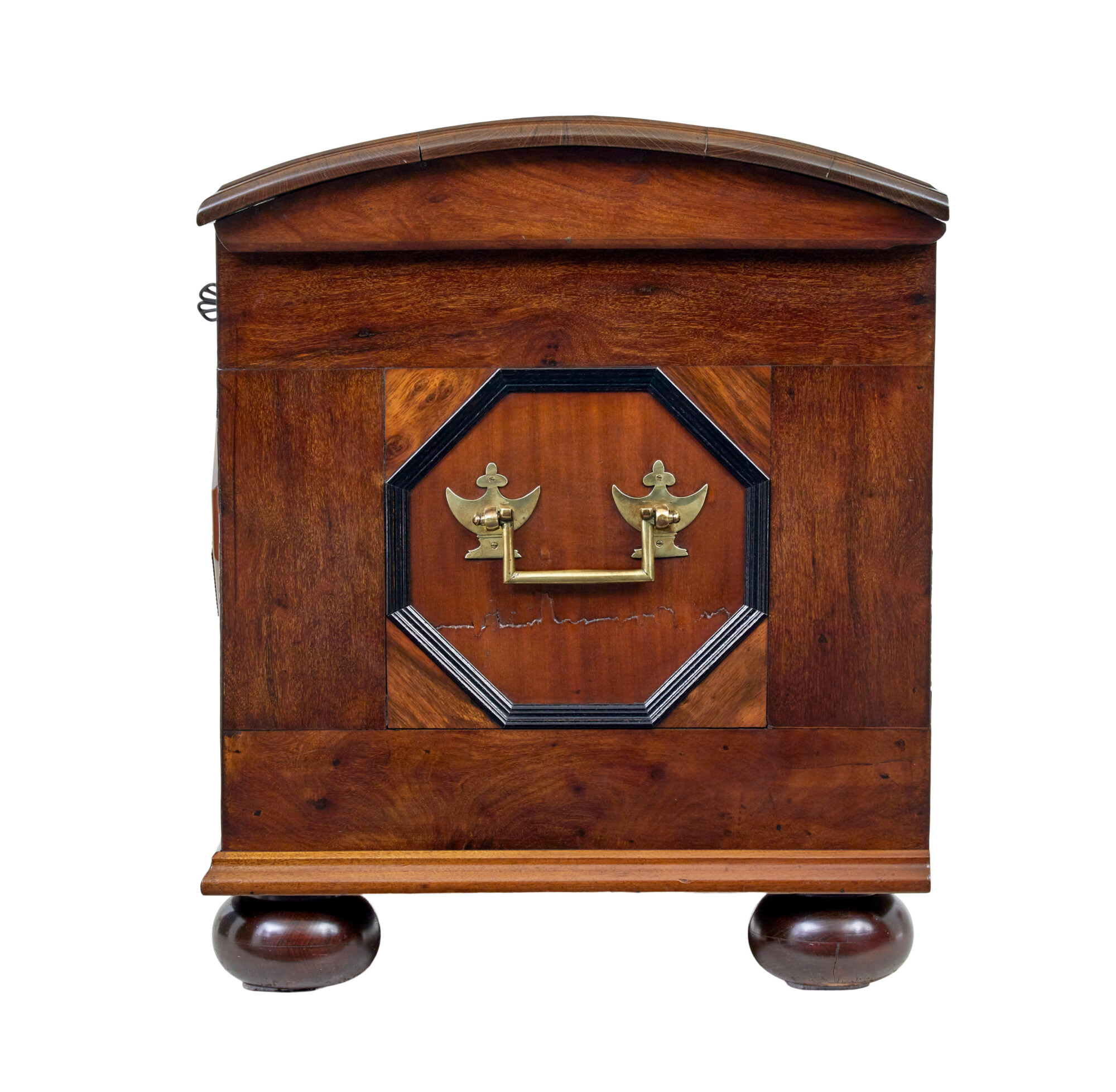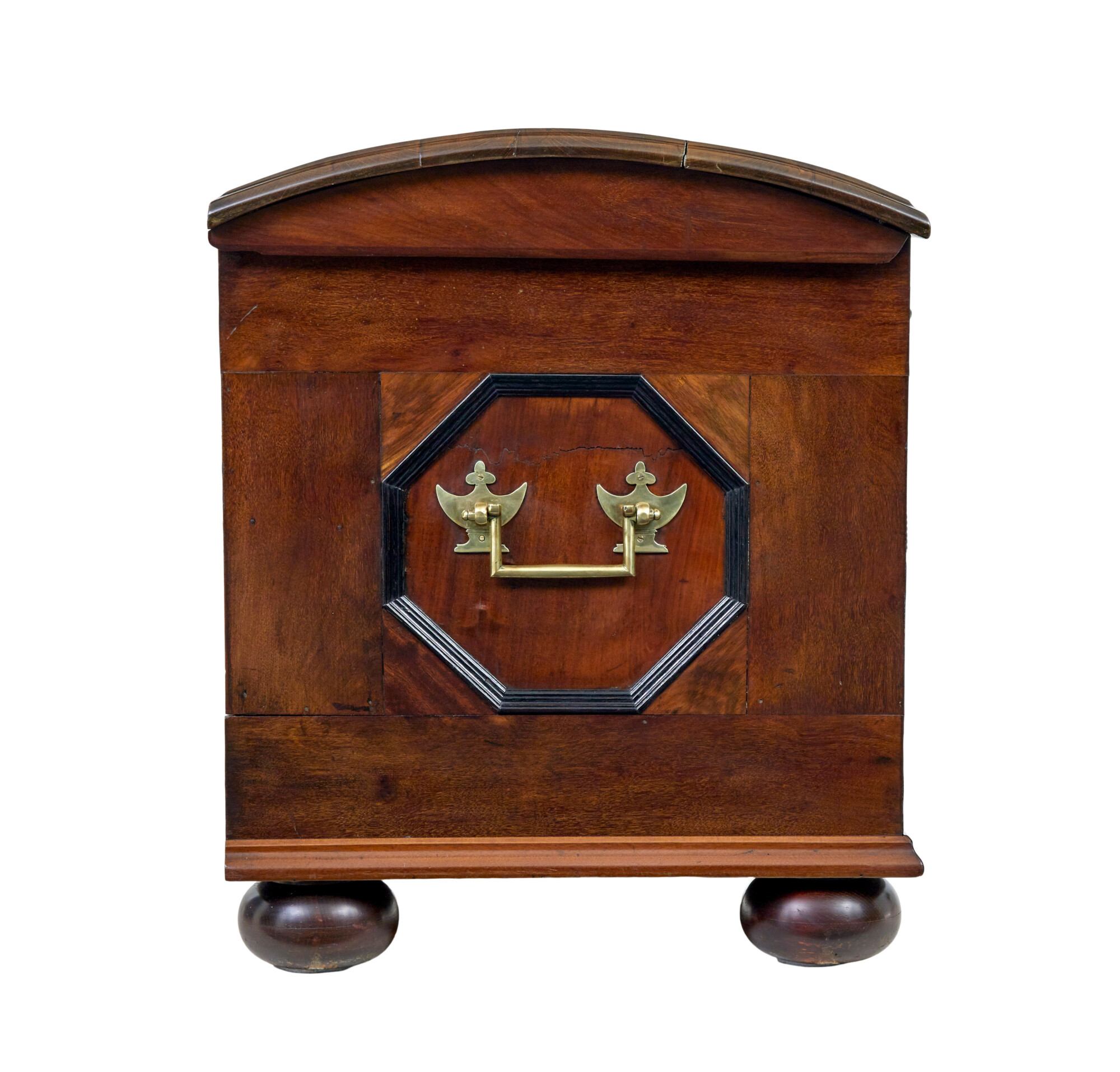 OCTAGONAL DETAIL TO THE SIDES WITH POLISHED BRASS CARRYING HANDLES.  DOMED TOP WITH FURTHER INLAY OPENS TO REVEAL AND PARTIALLY FITTED OAK INTERIOR.  INTERIOR WITH SHELF AND CANDLE BOX, COMPLETE WITH SECRET DRAWERS.