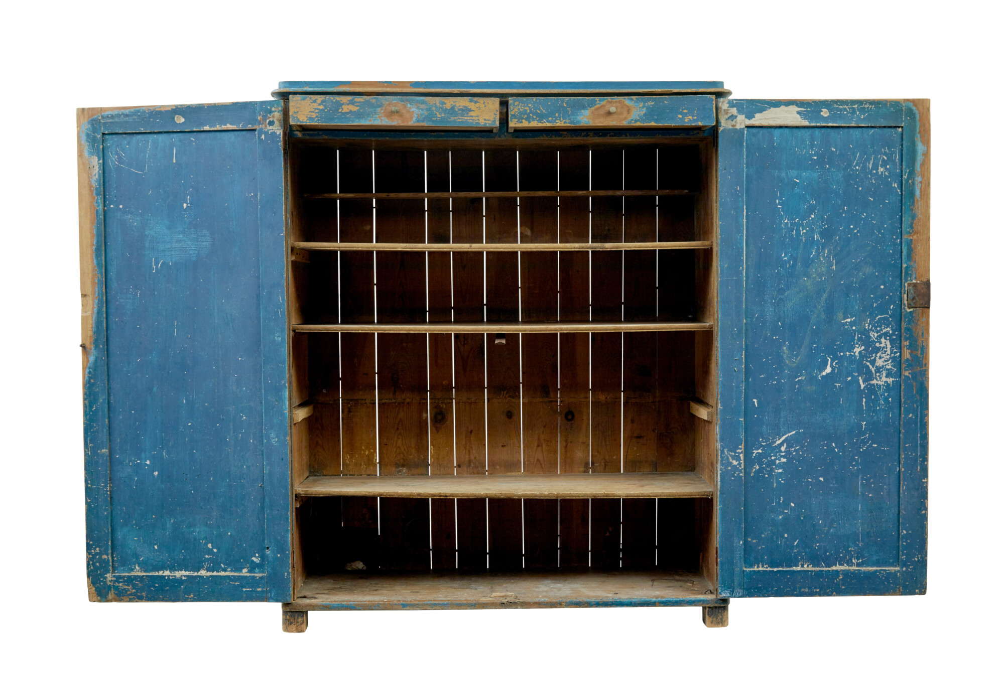 TRADITIONAL ORIGINAL SWEDISH BLUE PAINT, EMBELLISHED WITH HAND PAINTED FLORALS TO EACH DOOR FRONT.  RECTANGULAR TOP WITH MOULDED EDGE.  DOUBLE DOOR CUPBOARD WITH WORKING LOCK AND KEY, OPENS TO REVEAL 3 FIXED SHELVES AND 1 SHALLOW ONE, ALSO A SPACE WHERE ONE HAS BEEN BEFORE.  STANDING ON BLOCK FEET.