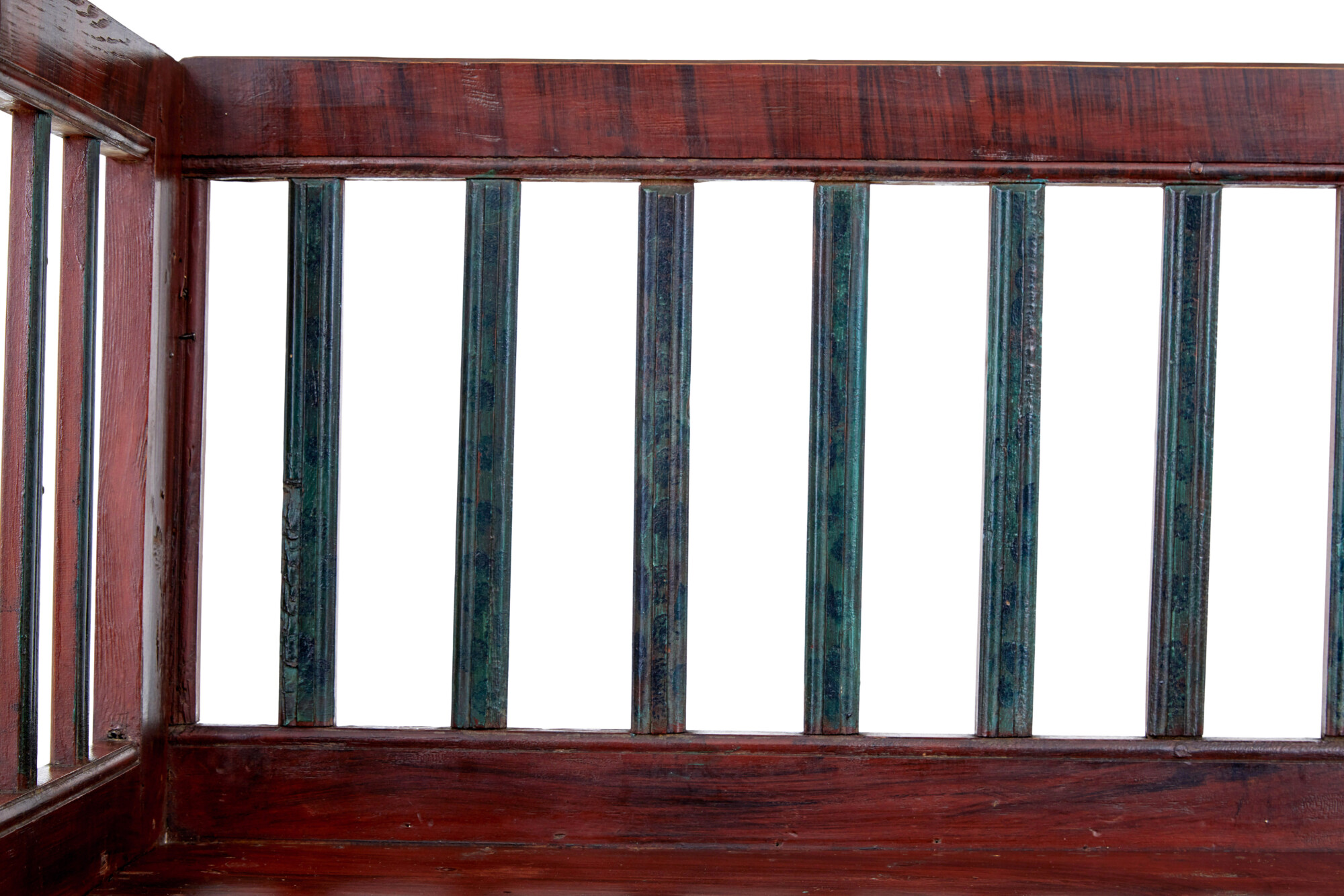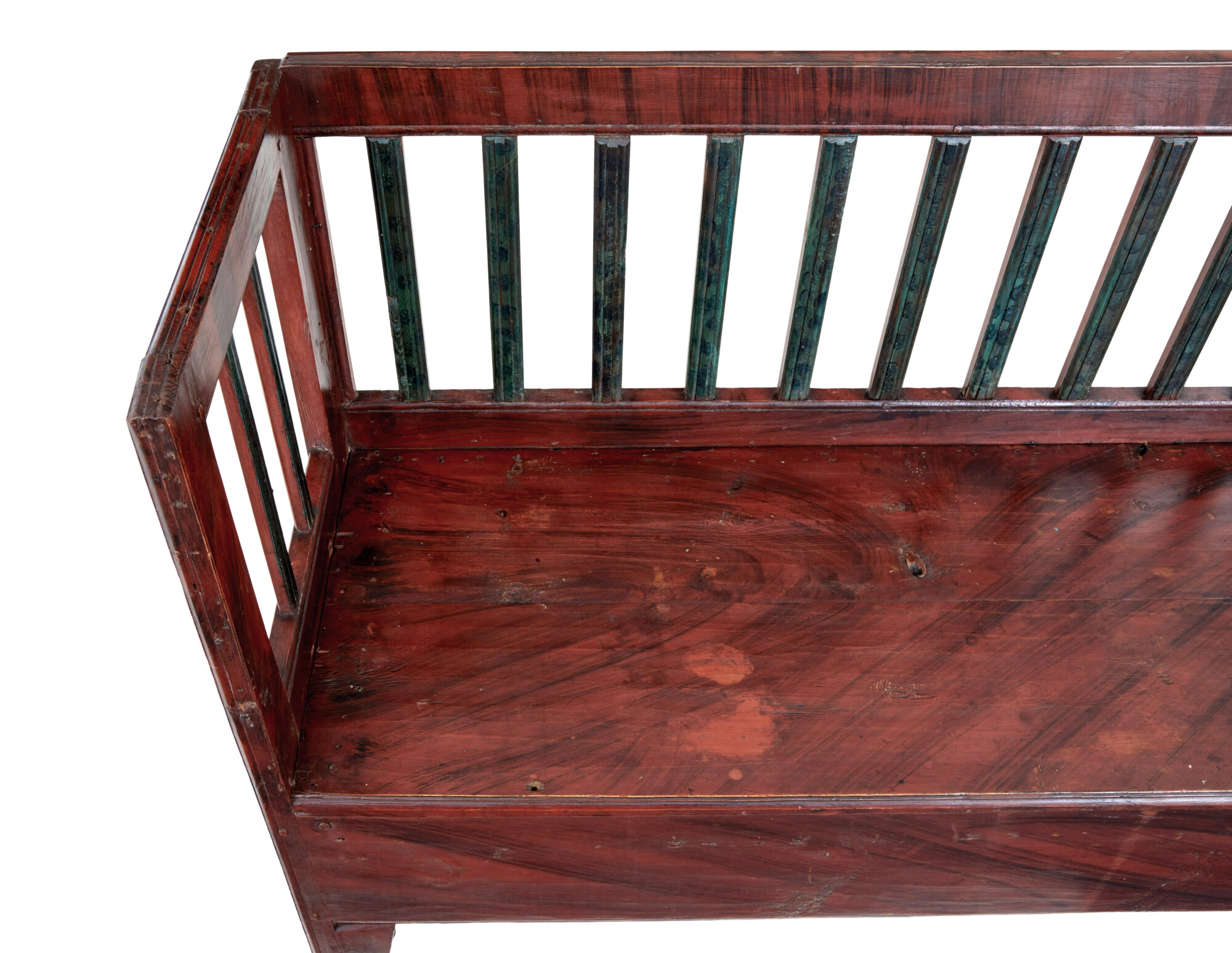 HERE WE PRESENT A TRADITIONAL SWEDISH BENCH, COMPLETE IN IT’S ORIGINAL HAND PAINTED DEEP RED AND GREEN COLOUR SCHEME.