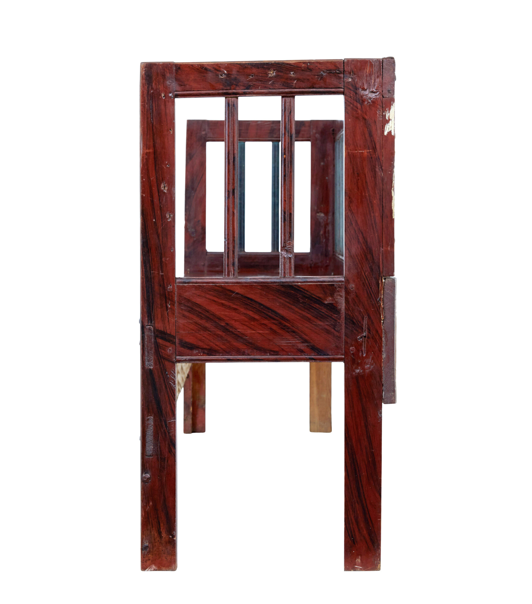 UPRIGHT BACK WHICH LENDS ITSELF PERFECTLY TO BEING USED IN A HALLWAY OR CLOAKROOM, OR AROUND THE KITCHEN DINING TABLE. PLUM COLOURED BASE PAINT WITH HAND PAINTED DARKER COLOURS TO SIMULATE A GRAIN EFFECT, BACK SUPPORTS PAINTED IN A CONTRASTING GREEN.