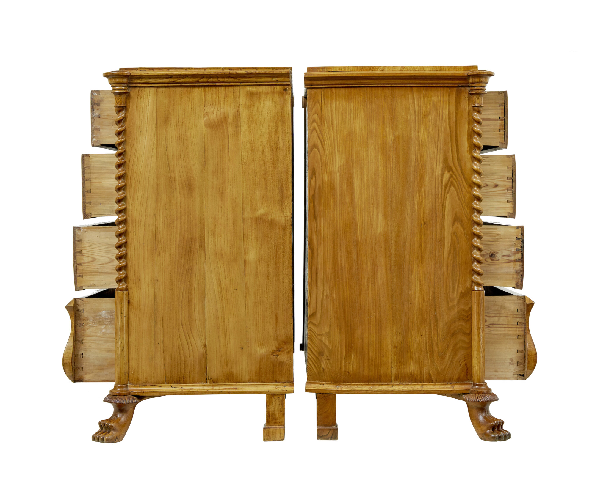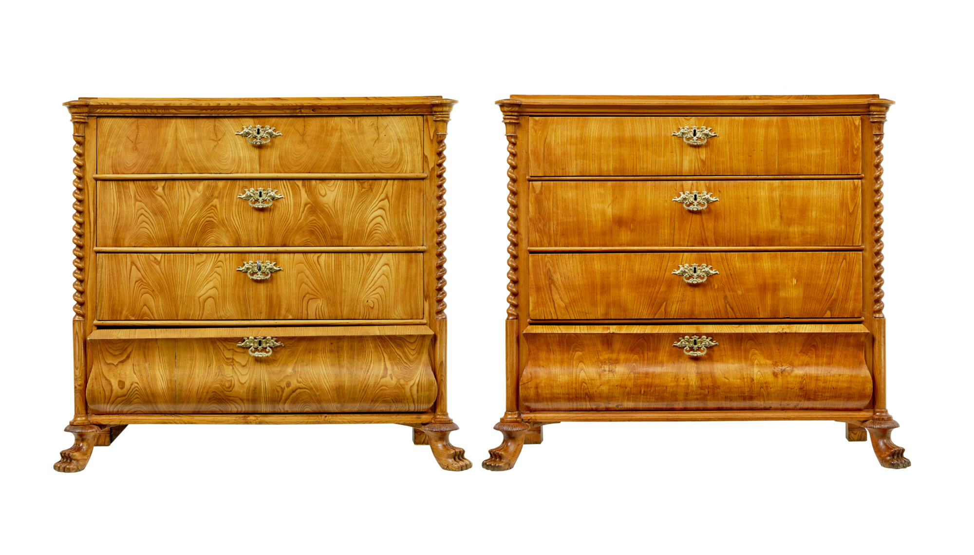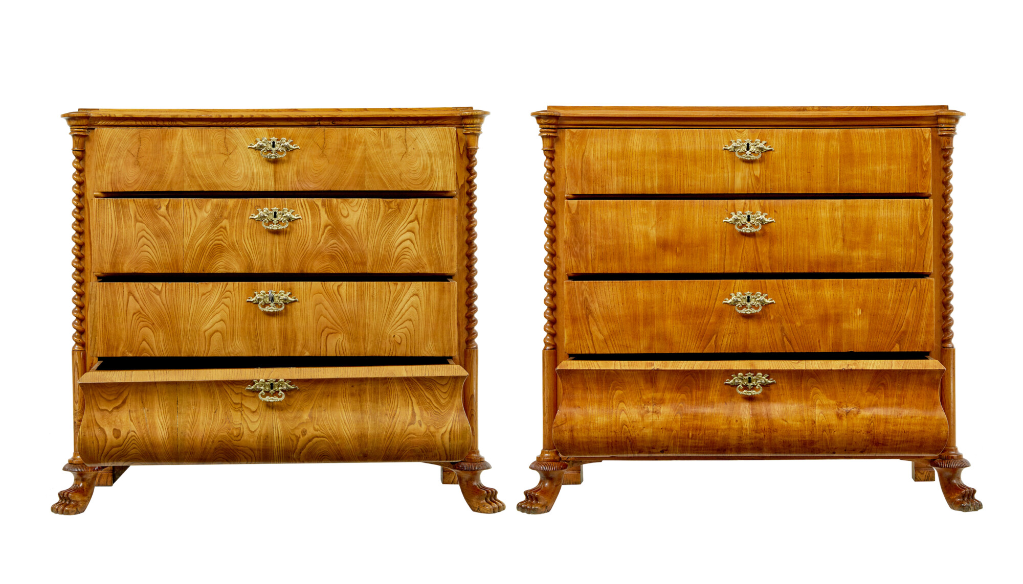 RECTANGULAR TOPS IN BOOK MARKED VENEERED ELM, SOLID MOULDED EDGES AND ROUNDED CORNERS WHICH FORM THE TOP OF THE CANDY TWIST HAND CARVED COLUMNS WHICH RUN DOWN EACH SIDE OF THE FRONTS OF THESE CHESTS. EACH FITTED WITH 3 DRAWERS OF EQUAL PROPORTIONS AND A FURTHER SHAPED DRAWER ON THE BOTTOM. EACH DRAWER IS FITTED WITH AN ORNATE ORMOLU HANDLE WHICH HOUSES THE KEYHOLE AS WELL. WORKING LOCKS AND KEY. EACH STANDING ON CARVED PAW FRONT FEET AND A BLOCK FOOT TO THE REAR.