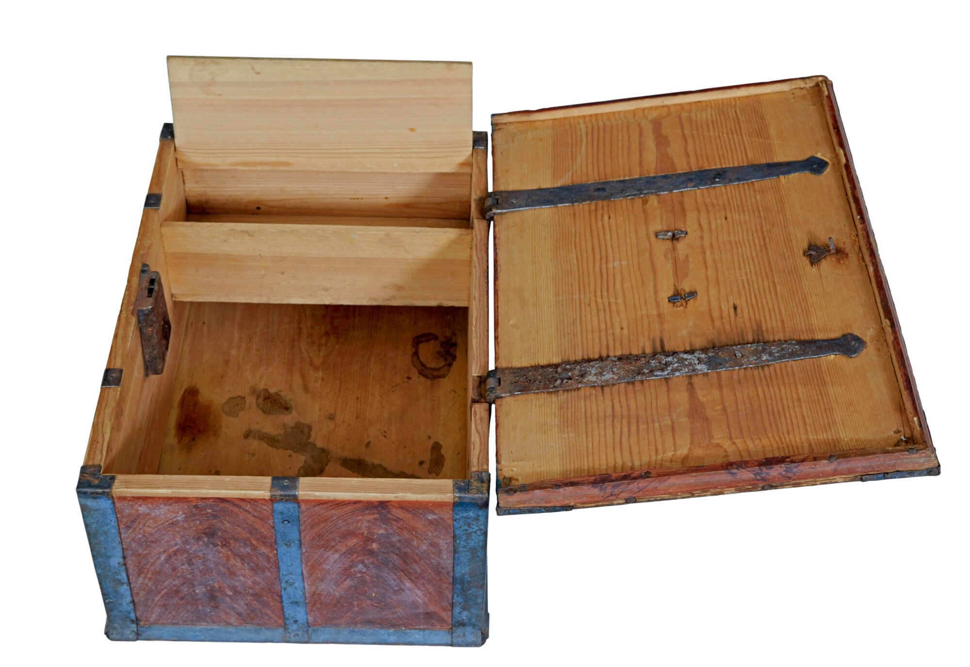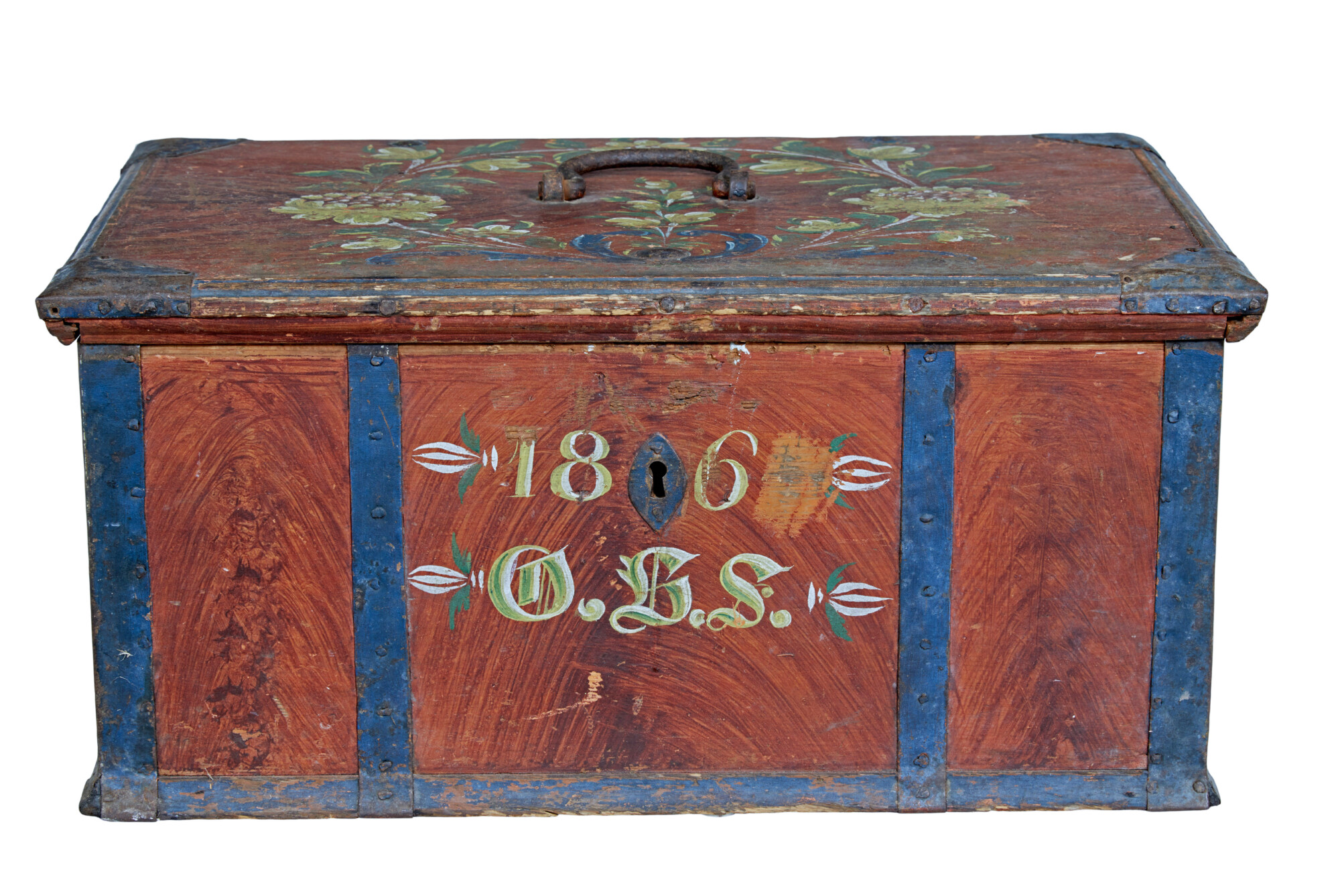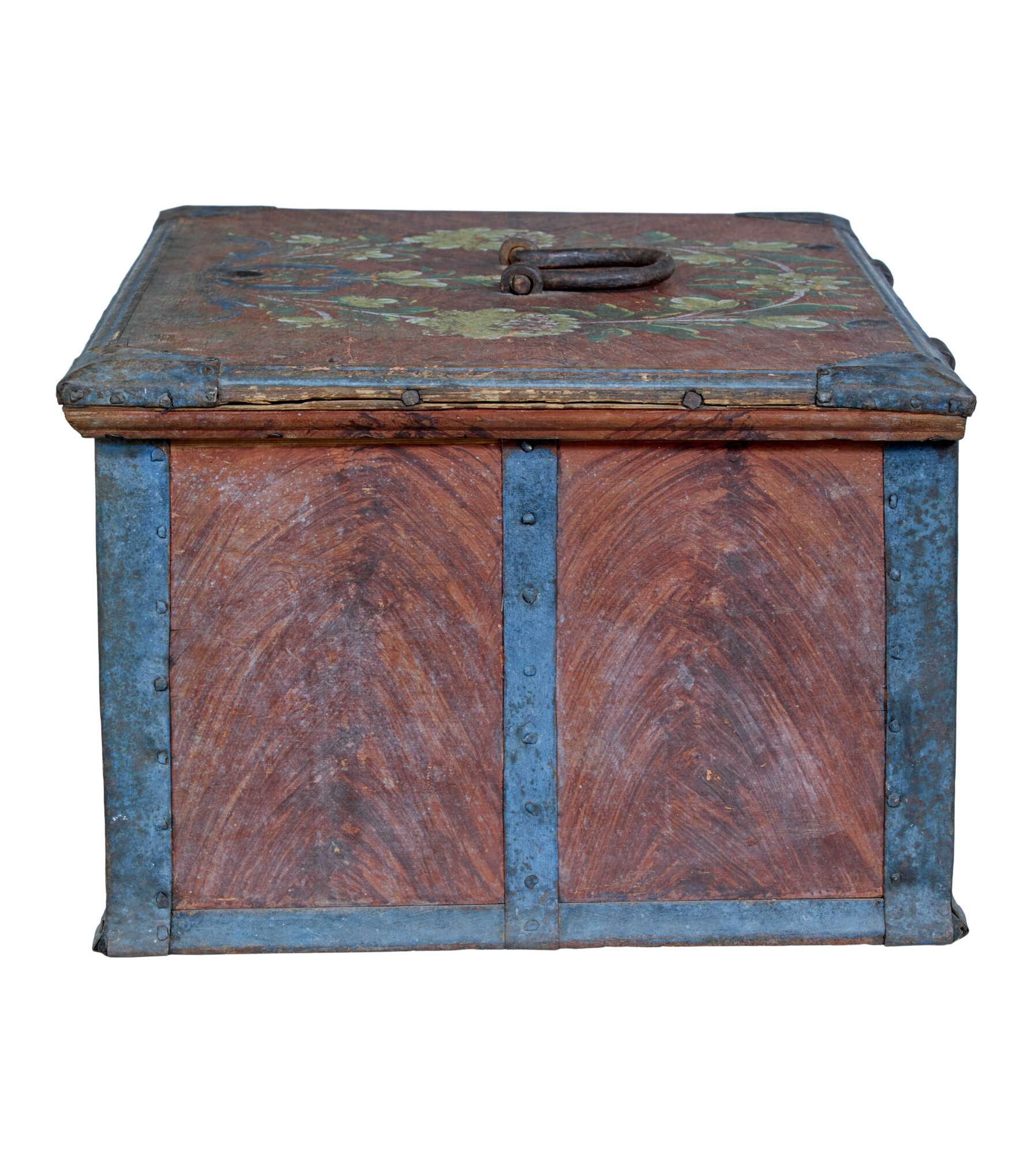 GOOD QUALITY SWEDISH PINE METAL BOUND BOX. DECORATED WITH ORIGINAL RAGWORK PAINT AND BLUE PAINTED STRAP WORK. HAND PAINTED FLORAL WREATH TO THE LID, INITIALED AND DATED TO THE FRONT, ALTHOUGH THE LAST DIGIT ON DATE HAS BEEN SCRUBBED OUT.