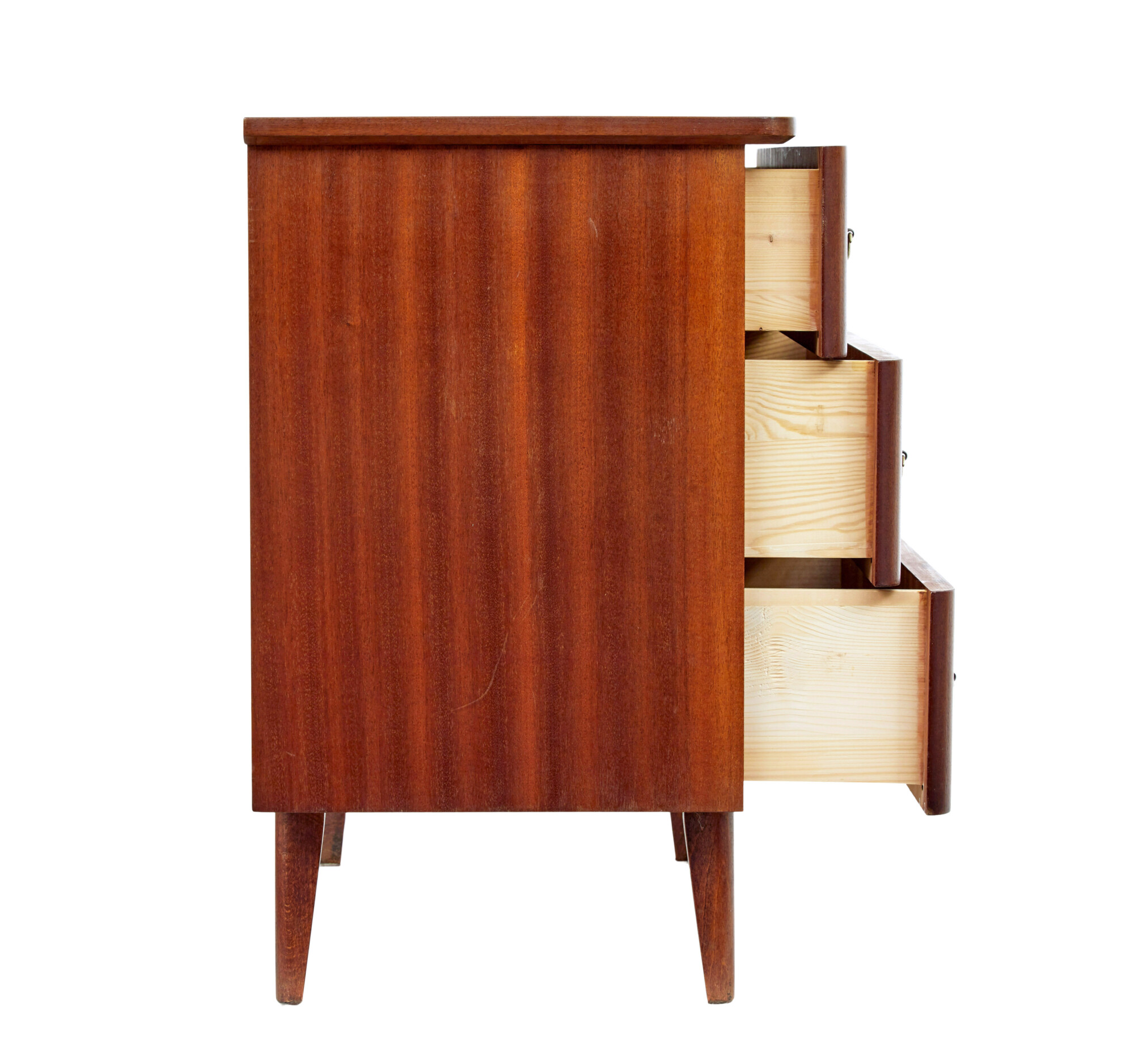 3 DRAWER SCANDINAVIAN DESIGN CHEST OF DRAWERS FROM THE 1960S. VENEERED IN TEAK AND FITTED WITH SHAPED BRASS HANDLES. TOP DRAWER WITH WORKING LOCK AND KEY FOR SECURE STORAGE. STANDING ON 4 TAPERED LEGS.