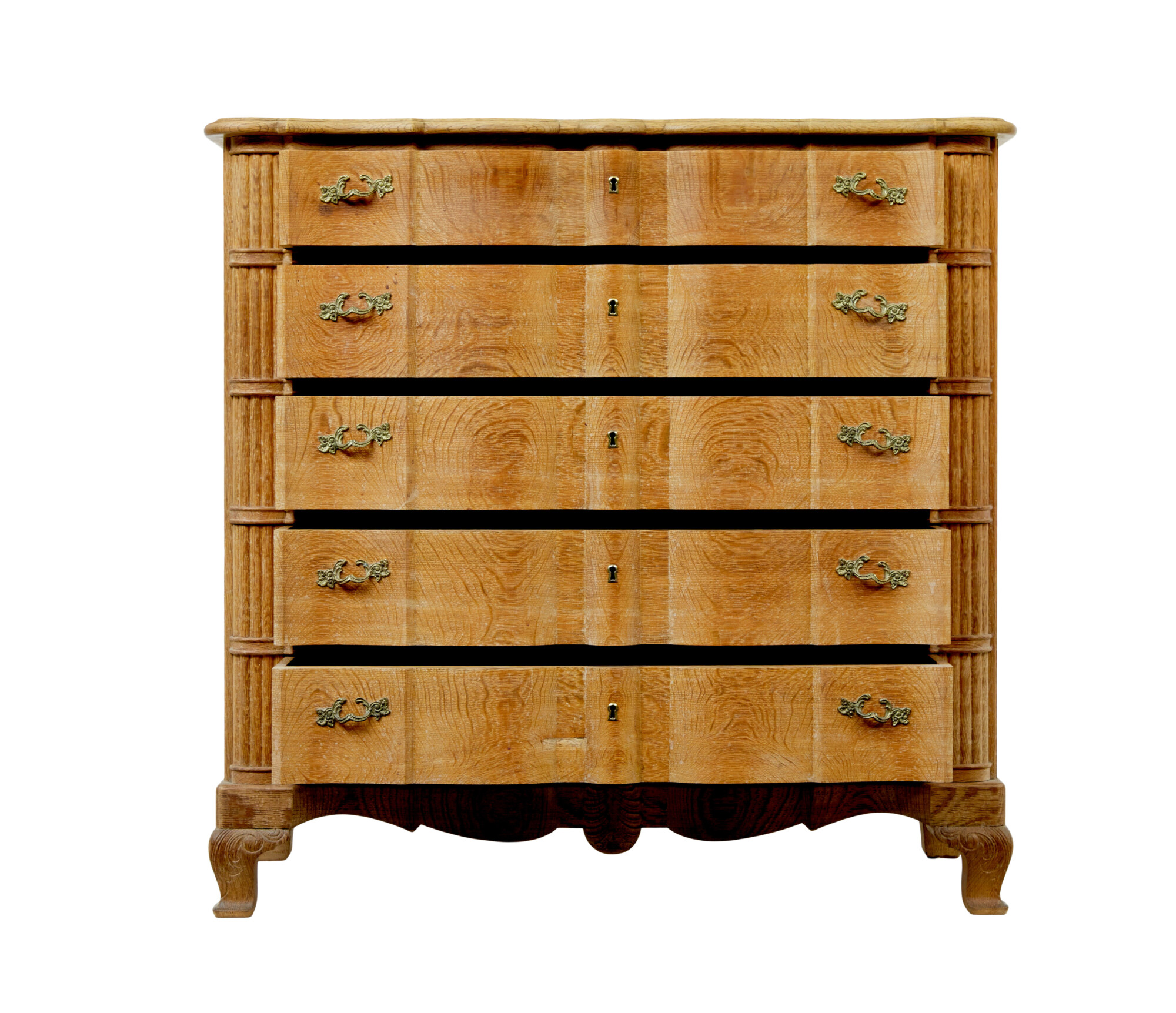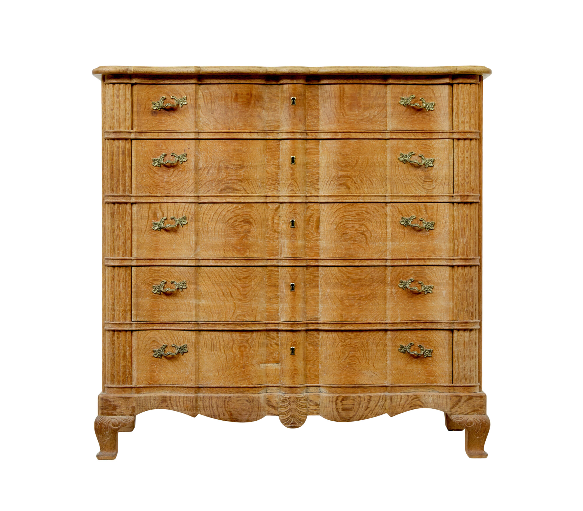 RECTANGULAR TOP WITH SHAPED FRONT, WHICH ECHOES THE BLOCK FRONTED SHAPED DRAWER FRONTS. FITTED WITH 5 GRADUATING DRAWERS, ORNATE HANDLES AND BRASS KEYHOLE. MOULDED DETAIL BETWEEN EACH DRAWER AND FURTHER CARVED DETAILING EITHER SIDE. SHAPED FREIZE TO FRONT WITH FURTHER CARVING TO THE CENTRE. STANDING ON 4 SHORT CABRIOLE LEGS.
