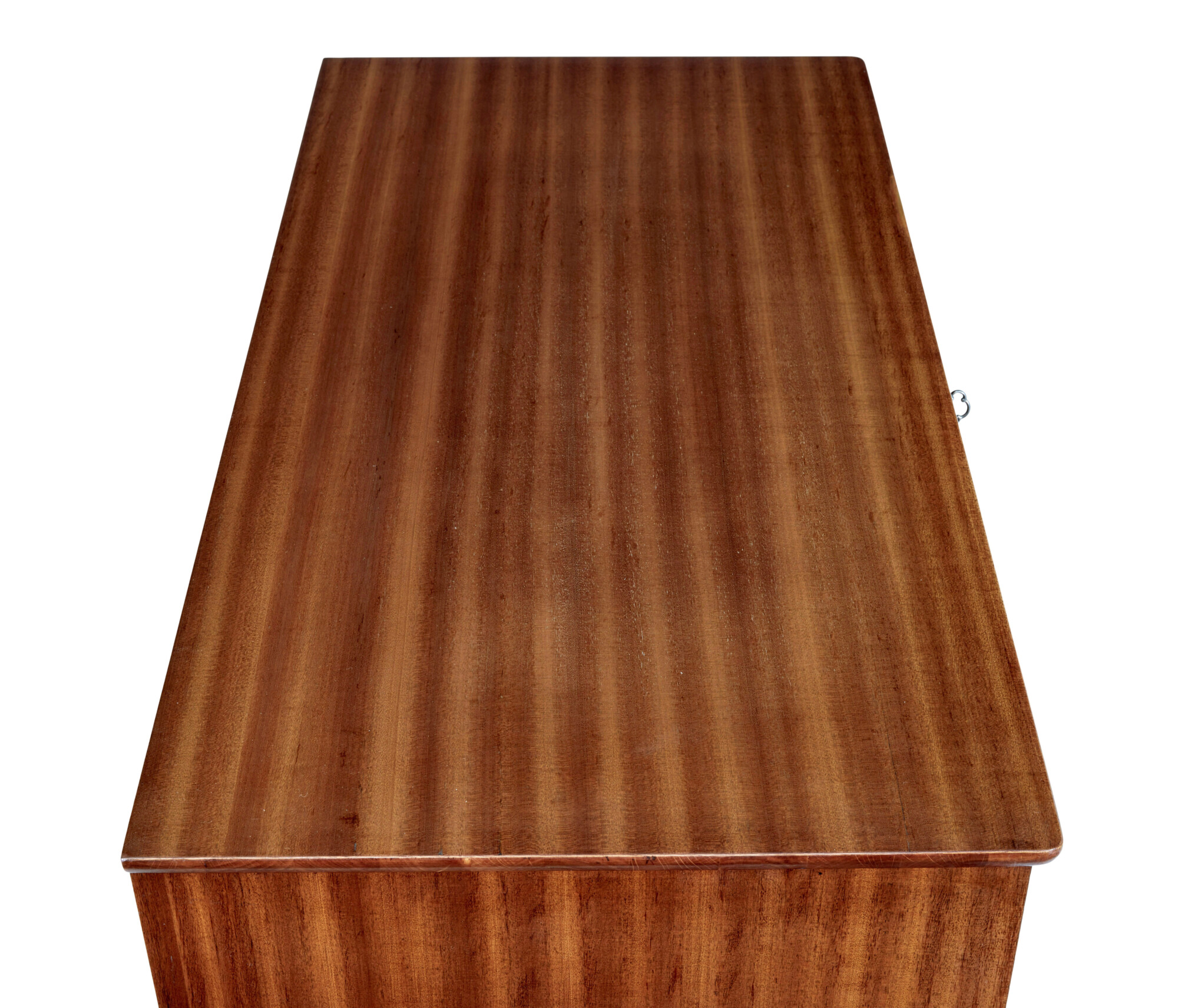 GOOD QUALITY PIECE OF MID CENTURY SWEDISH DESIGN. SLIGHTLY OVER SAILING TOP SURFACE, WITH 3 EQUAL PROPORTIONED DRAWERS BELOW, EACH FITTED WITH CARVED SHELL HANDLES.