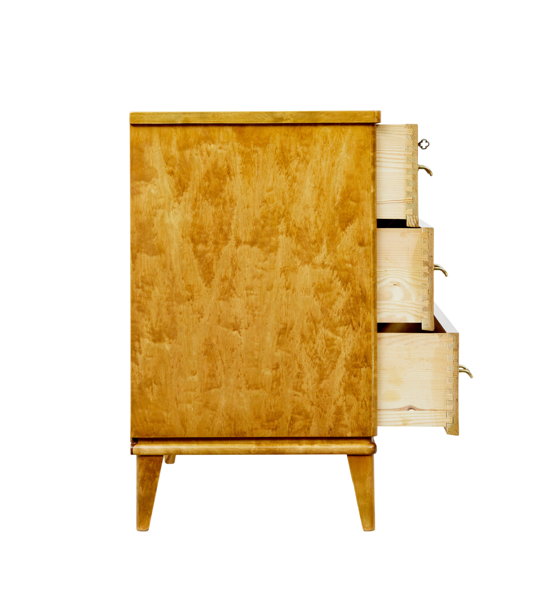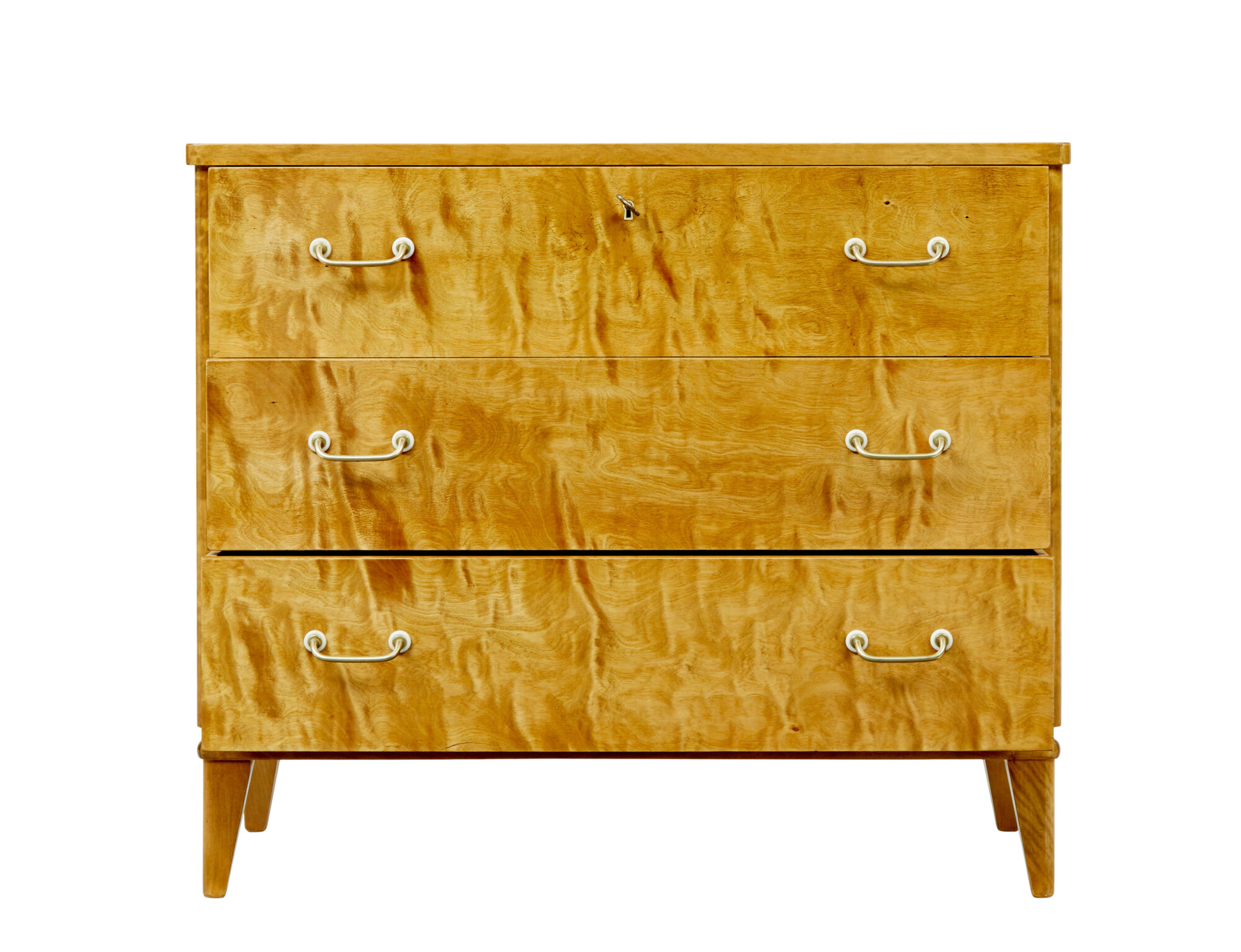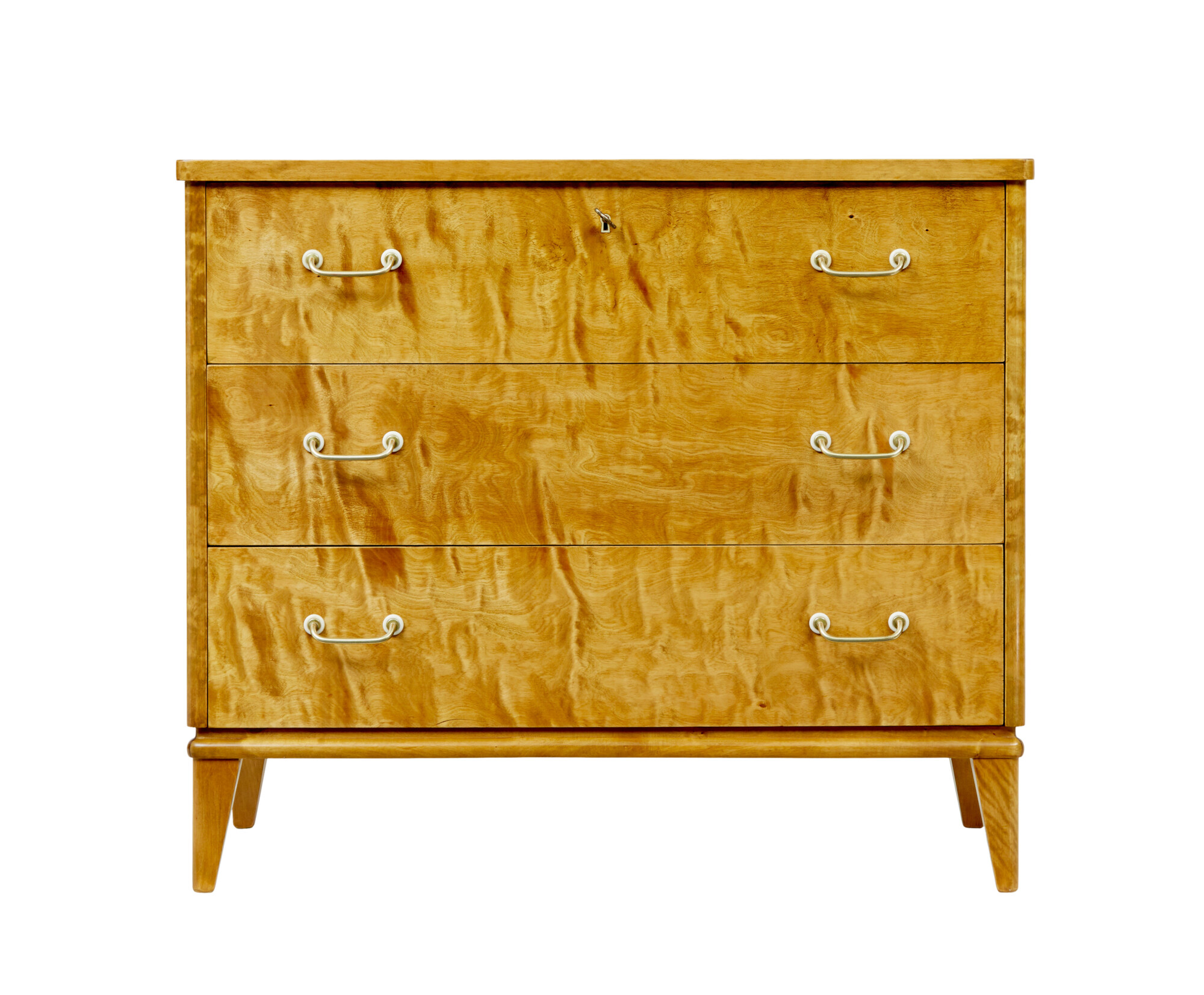 COMPLETELY VENEERED ALLOVER IN A STUNNING CUT OF BIRCH, WHICH GIVES IT A TIGER LIKE APPEARANCE. RECTANGULAR TOP WITH ROUNDED FRONT CORNERS, FITTED WITH 3 DRAWERS OF EQUAL PROPORTION, ORIGINAL BRASS HANDLES. TOP DRAWER WITH WORKING LOCK AND KEY. MOULDED EDGE ABOVE THE FOUR TAPERING FEET.