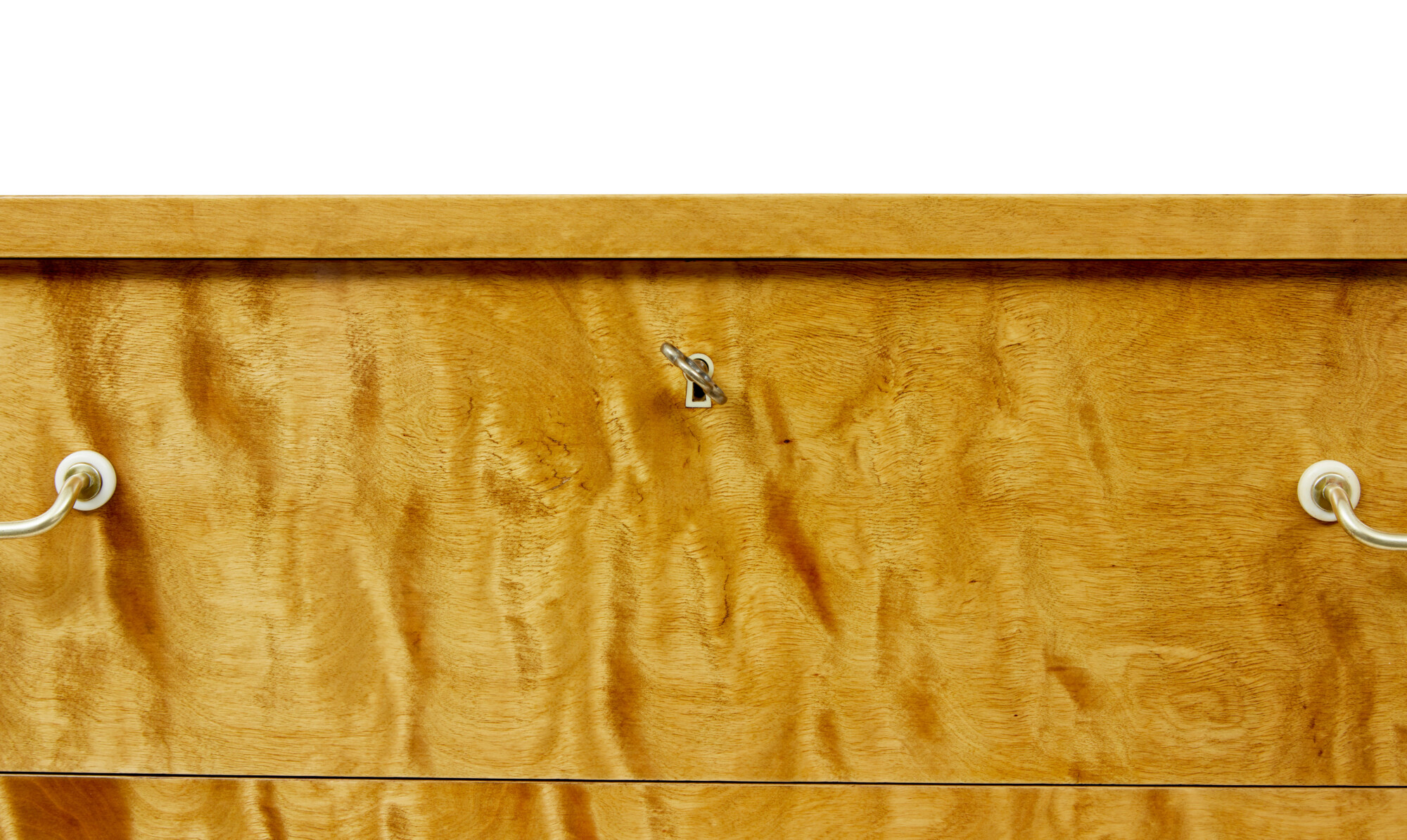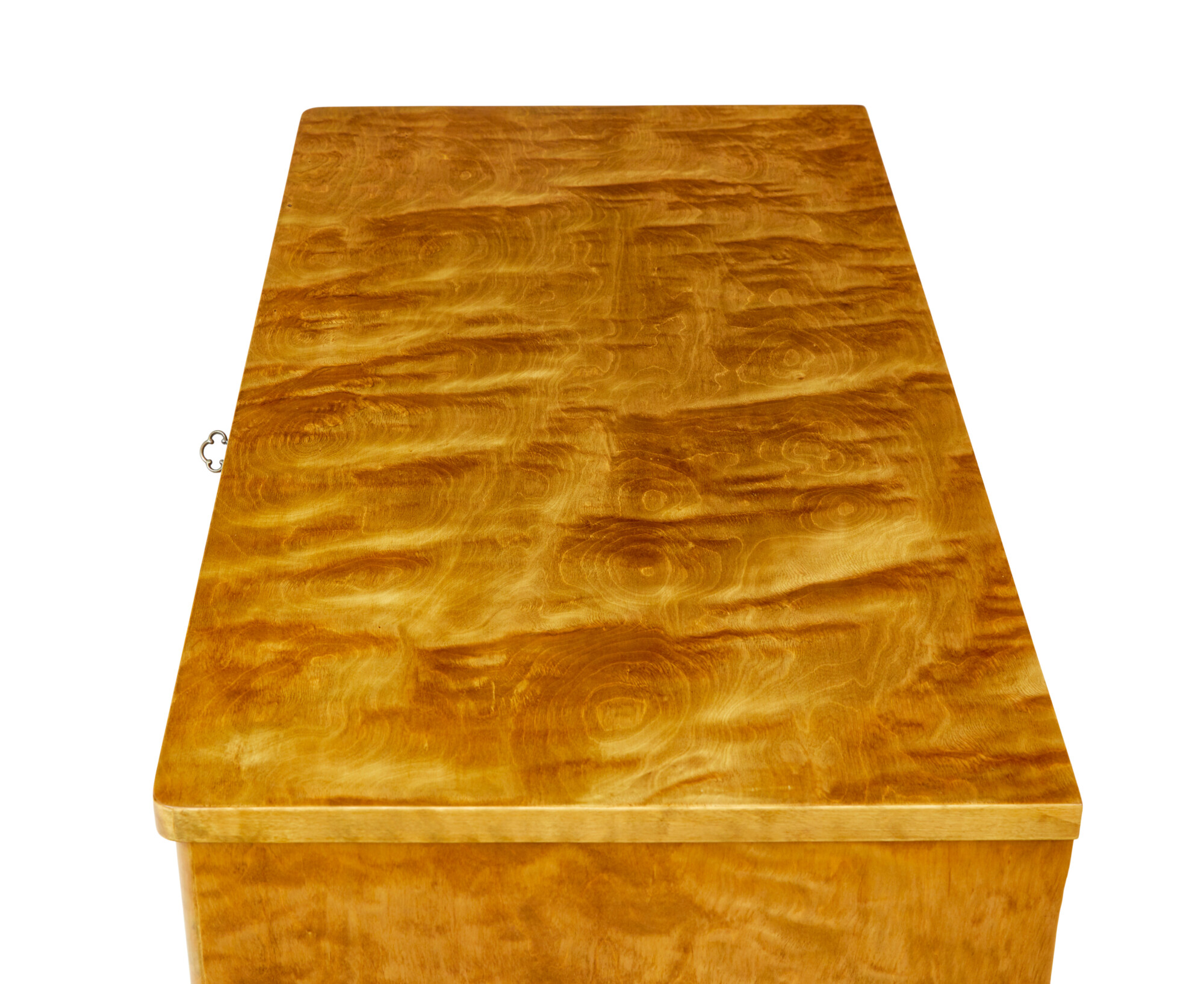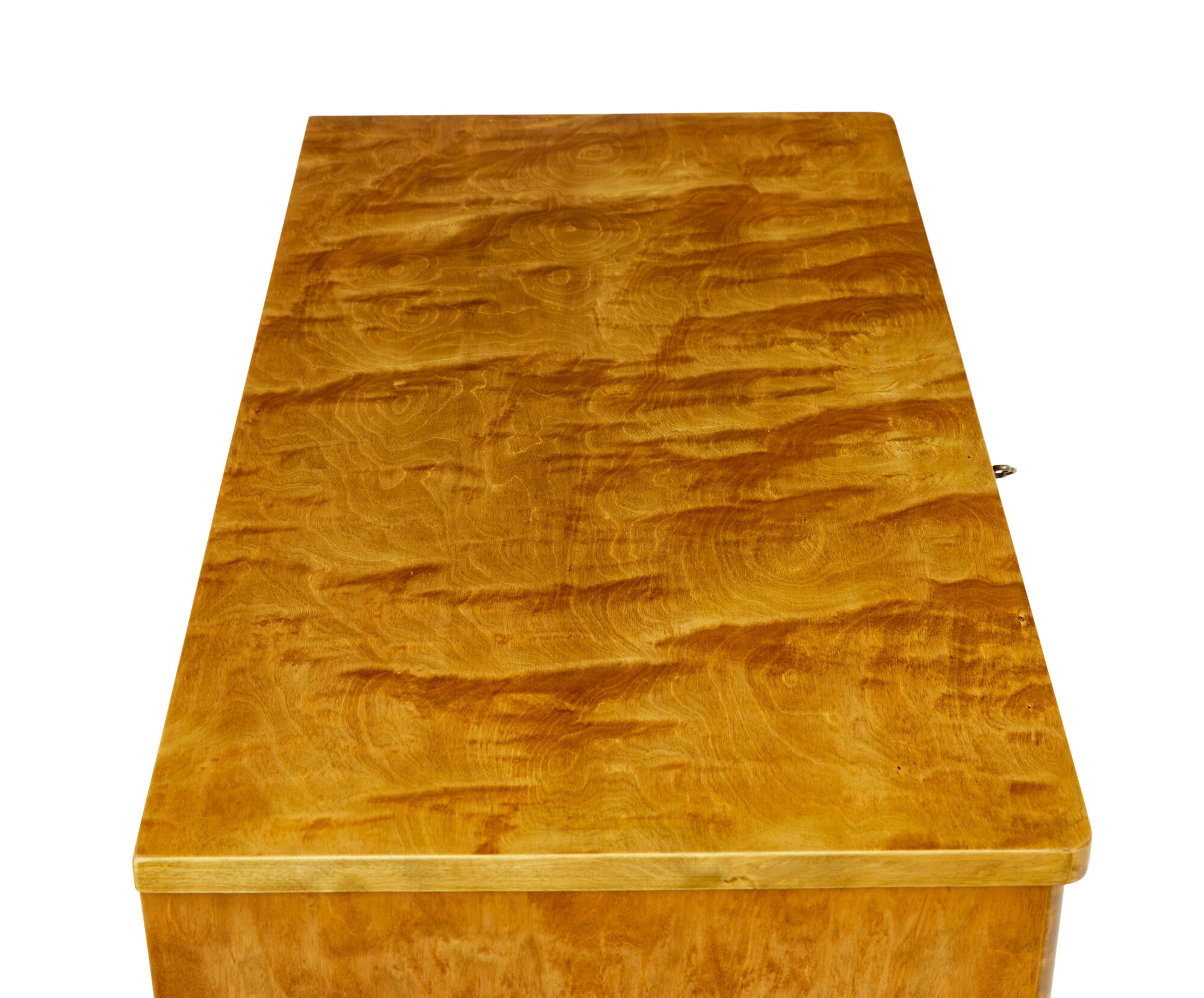 COMPLETELY VENEERED ALLOVER IN A STUNNING CUT OF BIRCH, WHICH GIVES IT A TIGER LIKE APPEARANCE. RECTANGULAR TOP WITH ROUNDED FRONT CORNERS, FITTED WITH 3 DRAWERS OF EQUAL PROPORTION, ORIGINAL BRASS HANDLES. TOP DRAWER WITH WORKING LOCK AND KEY. MOULDED EDGE ABOVE THE FOUR TAPERING FEET.