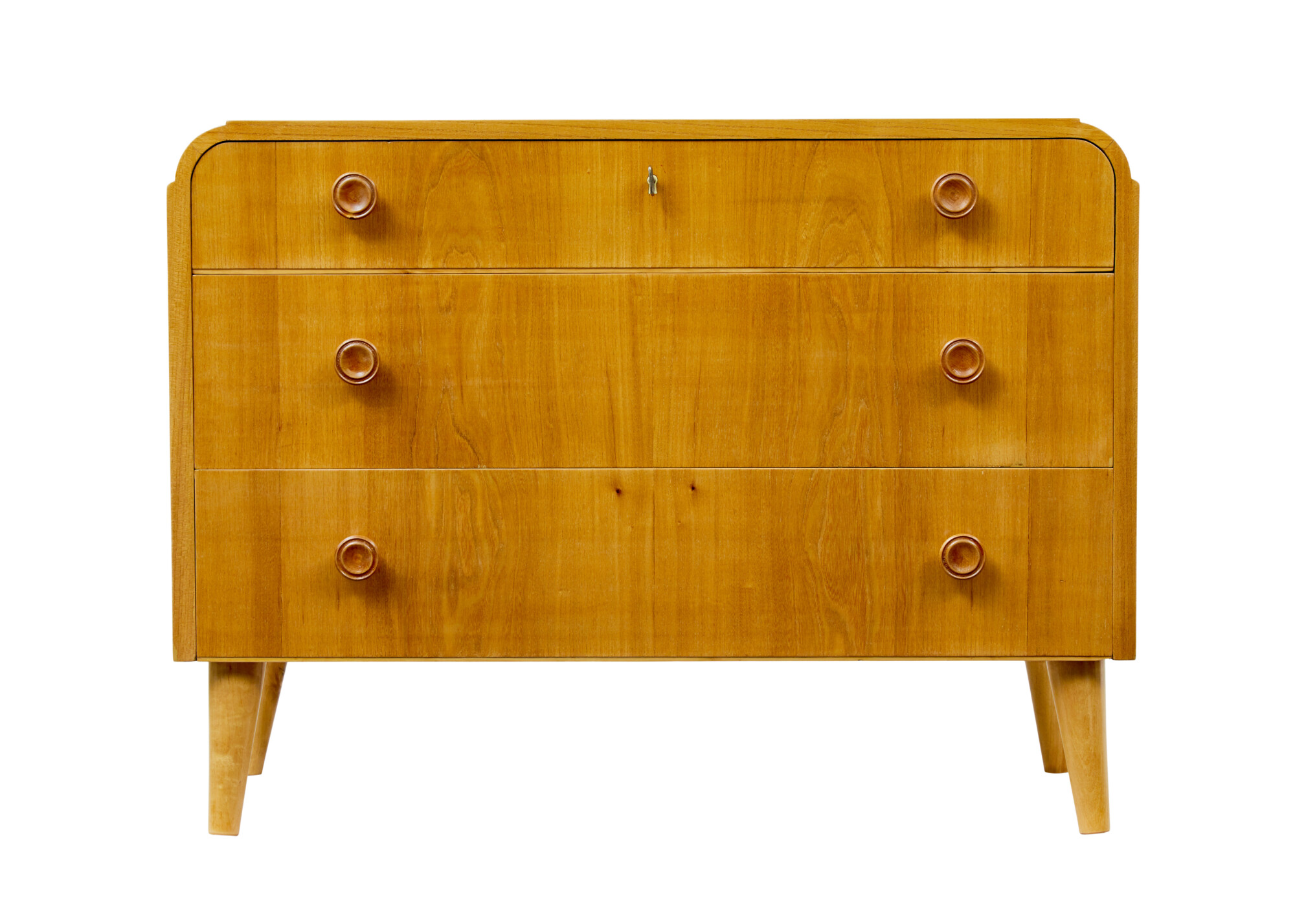 VENEERED IN A STRIKING ELM HAVING IT’S GOLDEN GLOW RETAINED.  TOP WITH SHAPED ENDS AND A VERY SLIGHT BIRCH MOULDING.  FITTED WITH 3 GRADUATING DRAWERS EACH FITTED WITH TURNED KNOBS IN THE SAME WOOD.  STANDING ON 4 TAPERED LEGS.  IDEAL CHEST OF DRAWERS FOR MULTIPLE ROOMS AROUND THE HOME.
