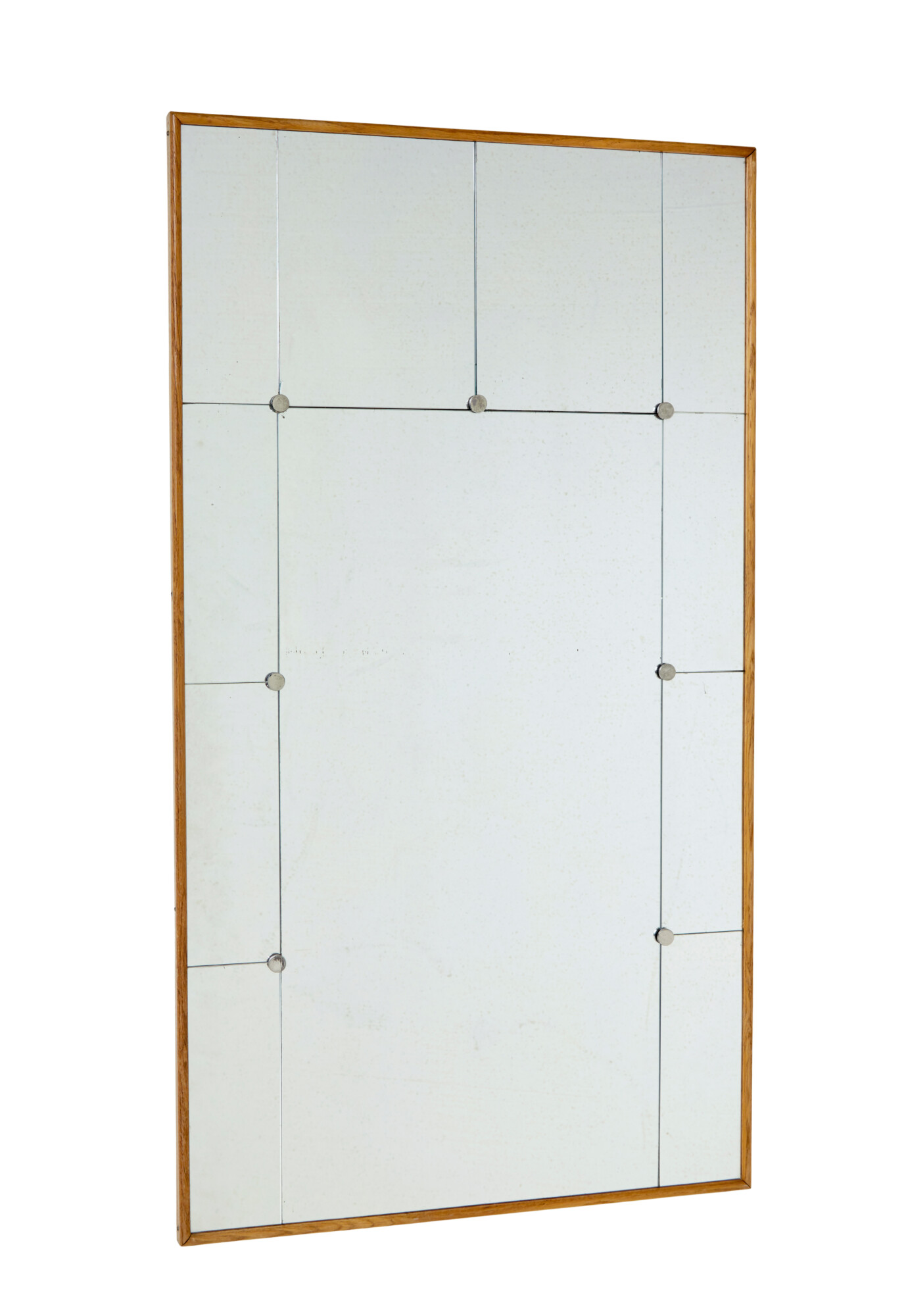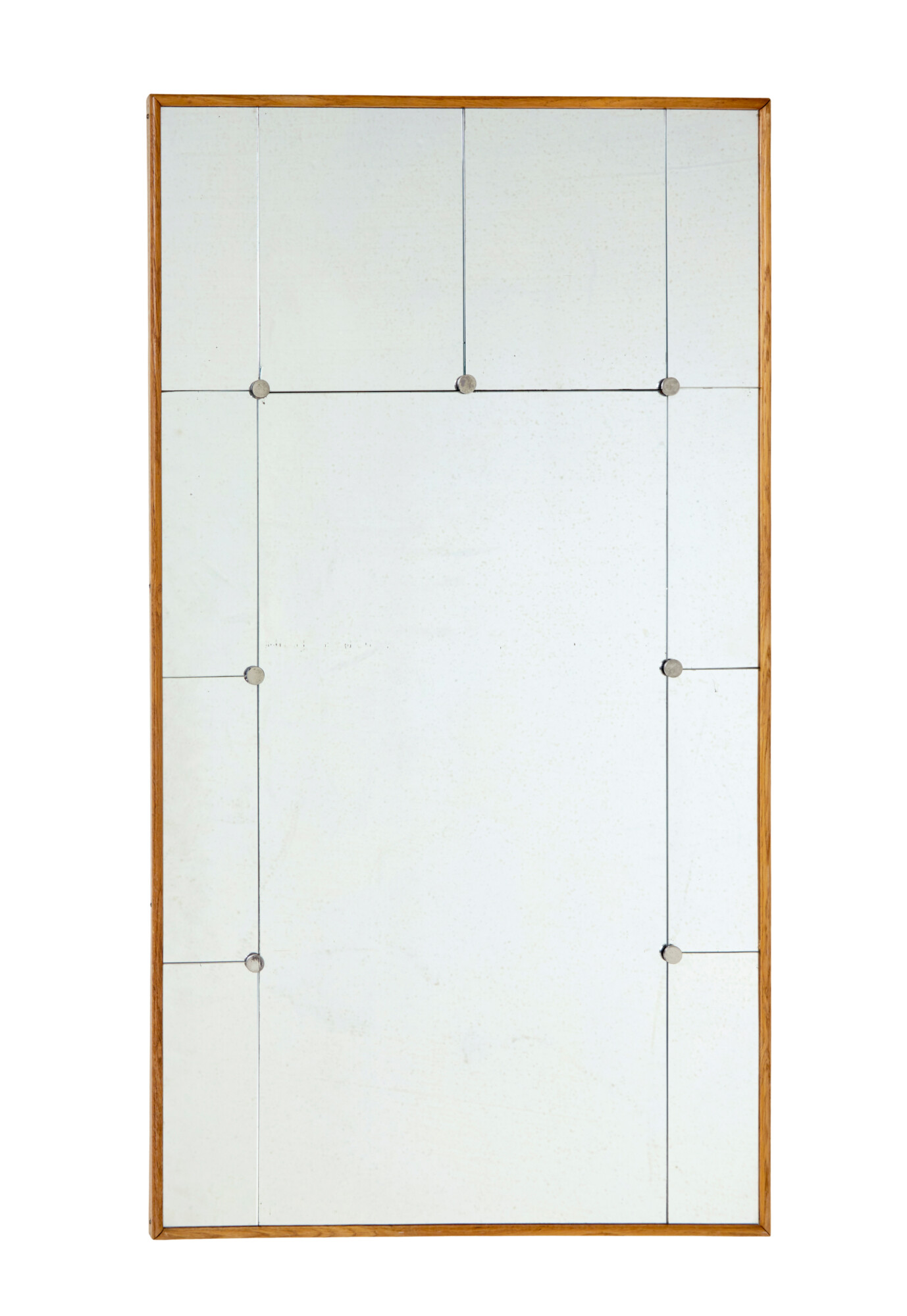 THIS MIRROR HAS A LOWER MAIN BODY OF MIRROR SURROUNDED ON THE SIDES AND TOP OF HAND CUT PANELS ALL HELD IN PLACE BY FLAT CHROMED SCREW IN STUDS. PRESENTED IN A SOLID BEECH FRAME.