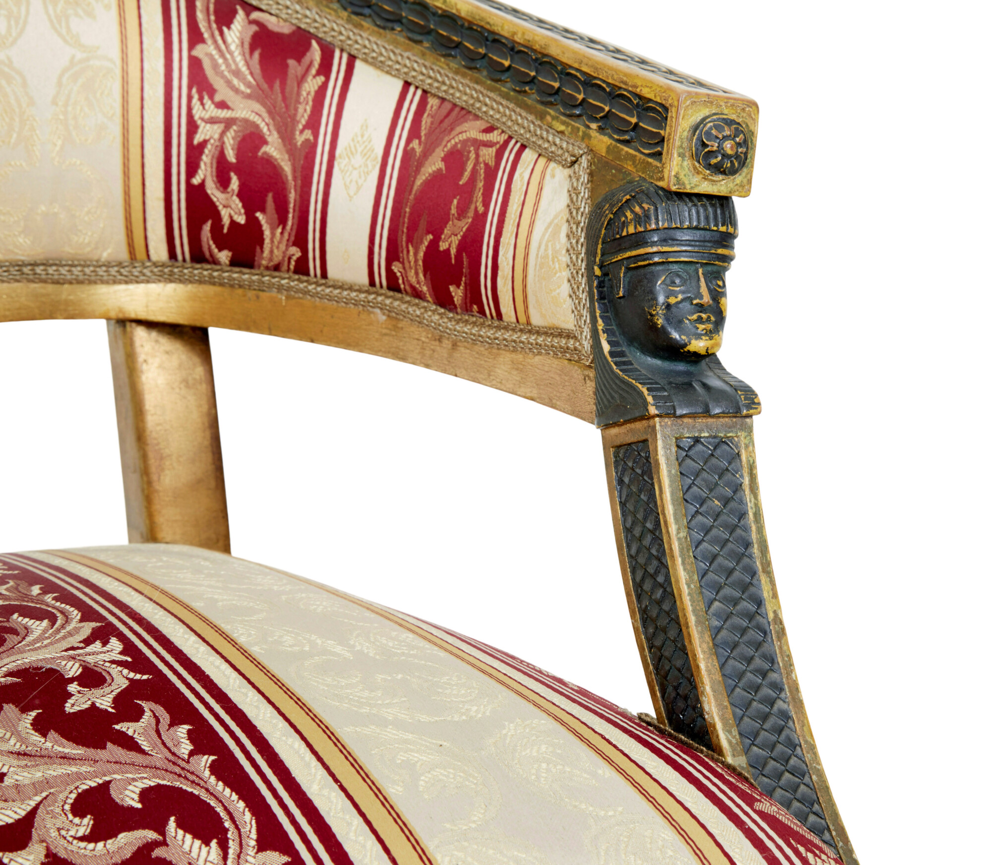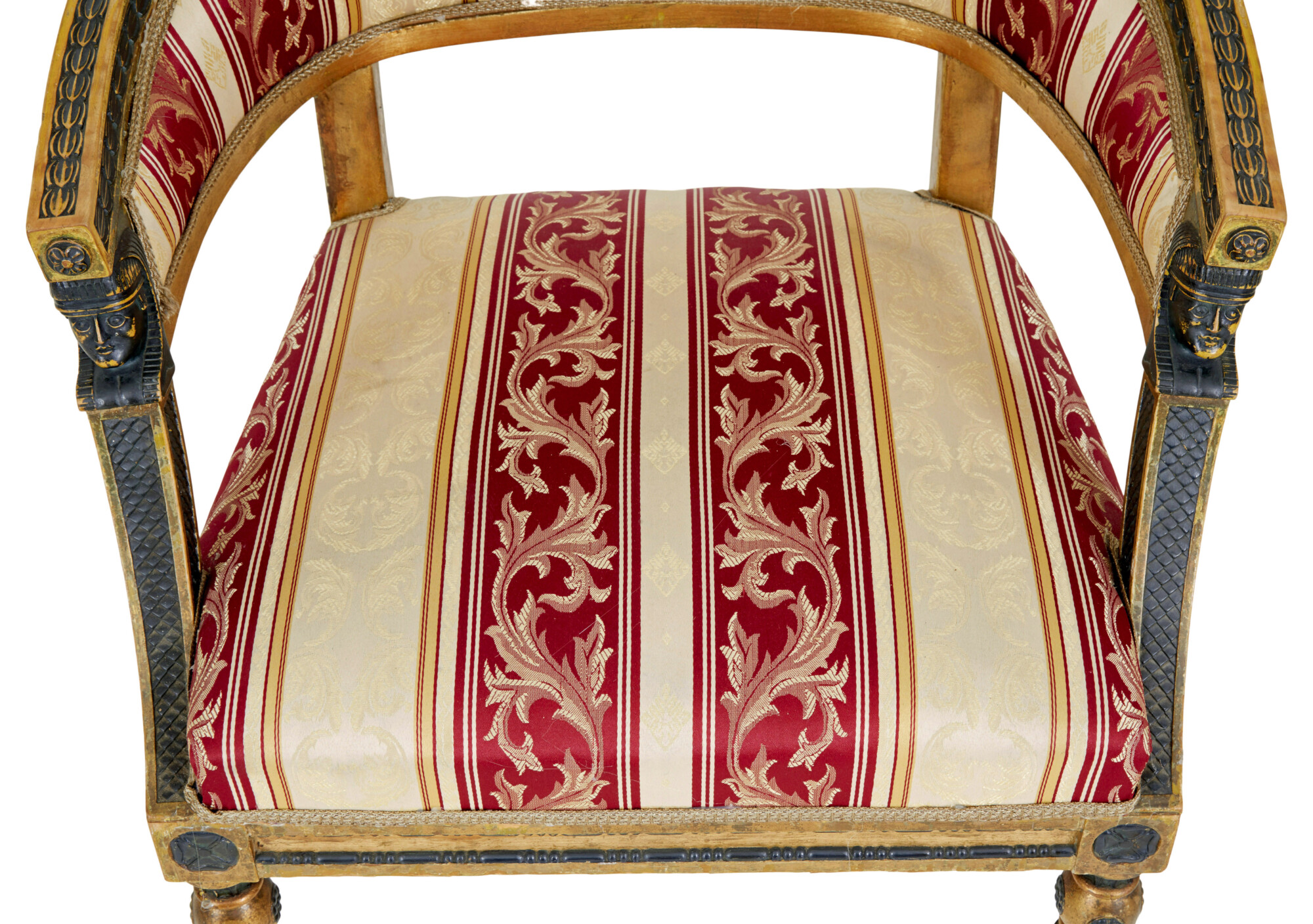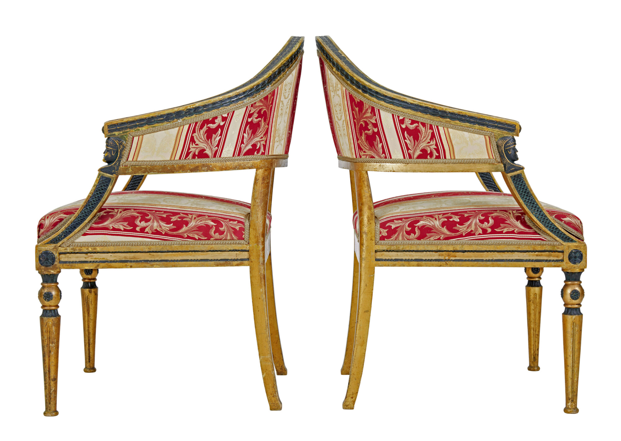 PAIR OF FINE QUALITY SHAPED BACK GILT ARMCHAIRS. UNUSUAL SHAPED BACK WITH EBONISED LEAF DETAILING CONTRASTING WITH THE GILT. EGYPTIAN REVIVAL MOUNTS BELOW THE ARMS. STANDING ON TAPERED LEGS. UPHOLSTERED IN LATER SILK MATERIAL.