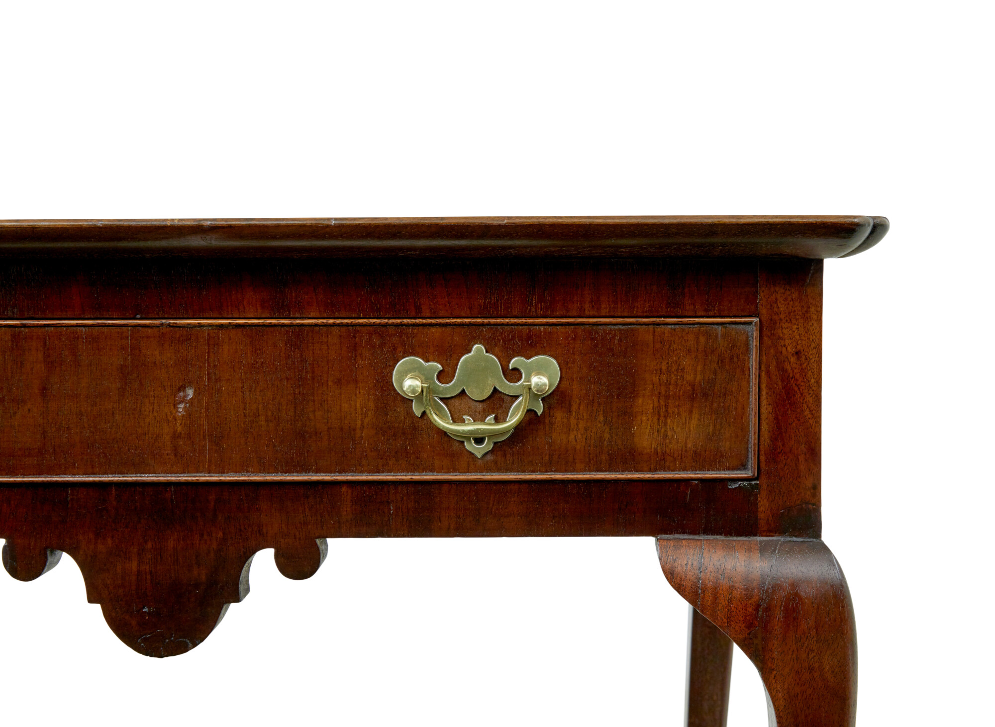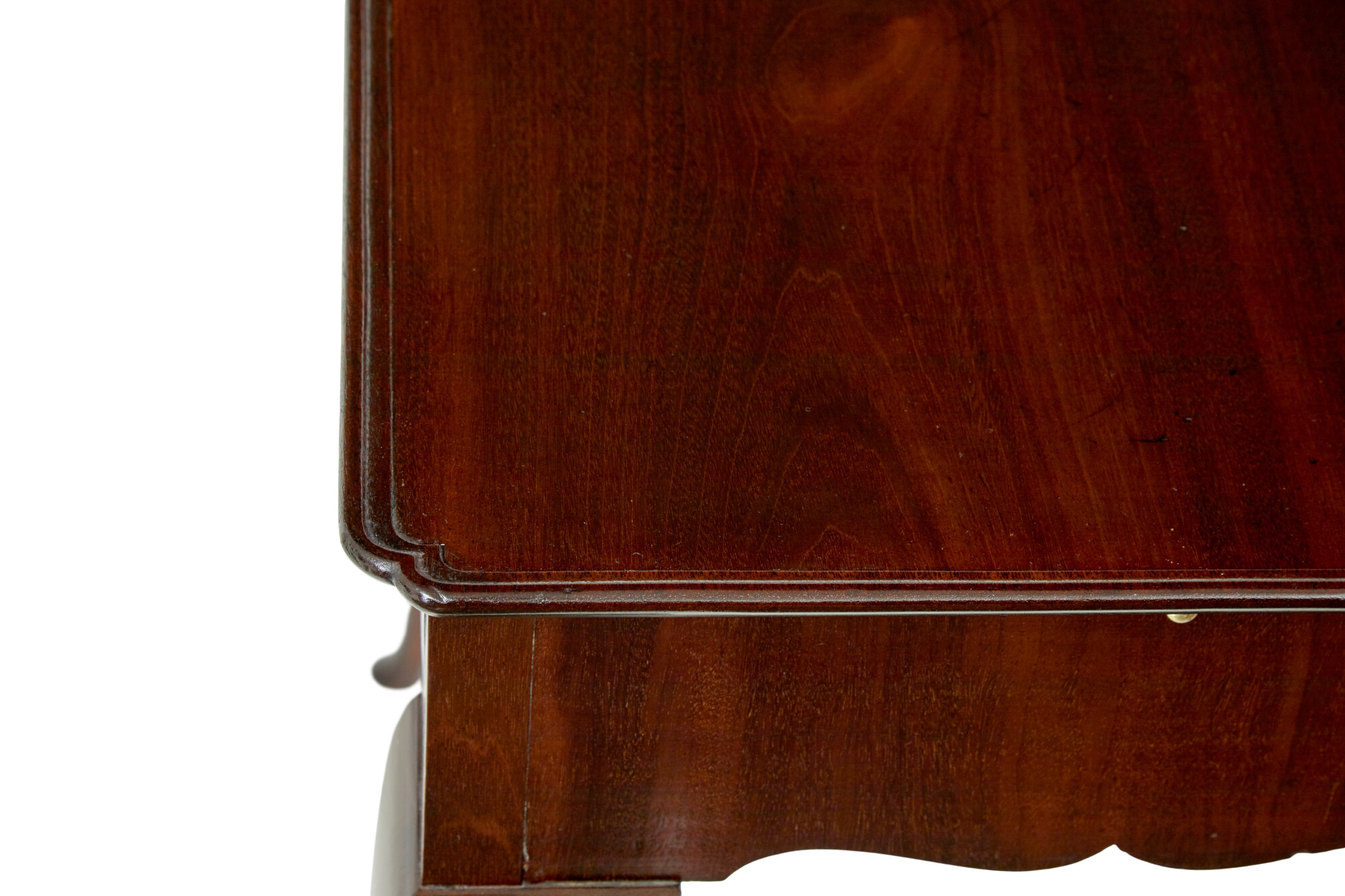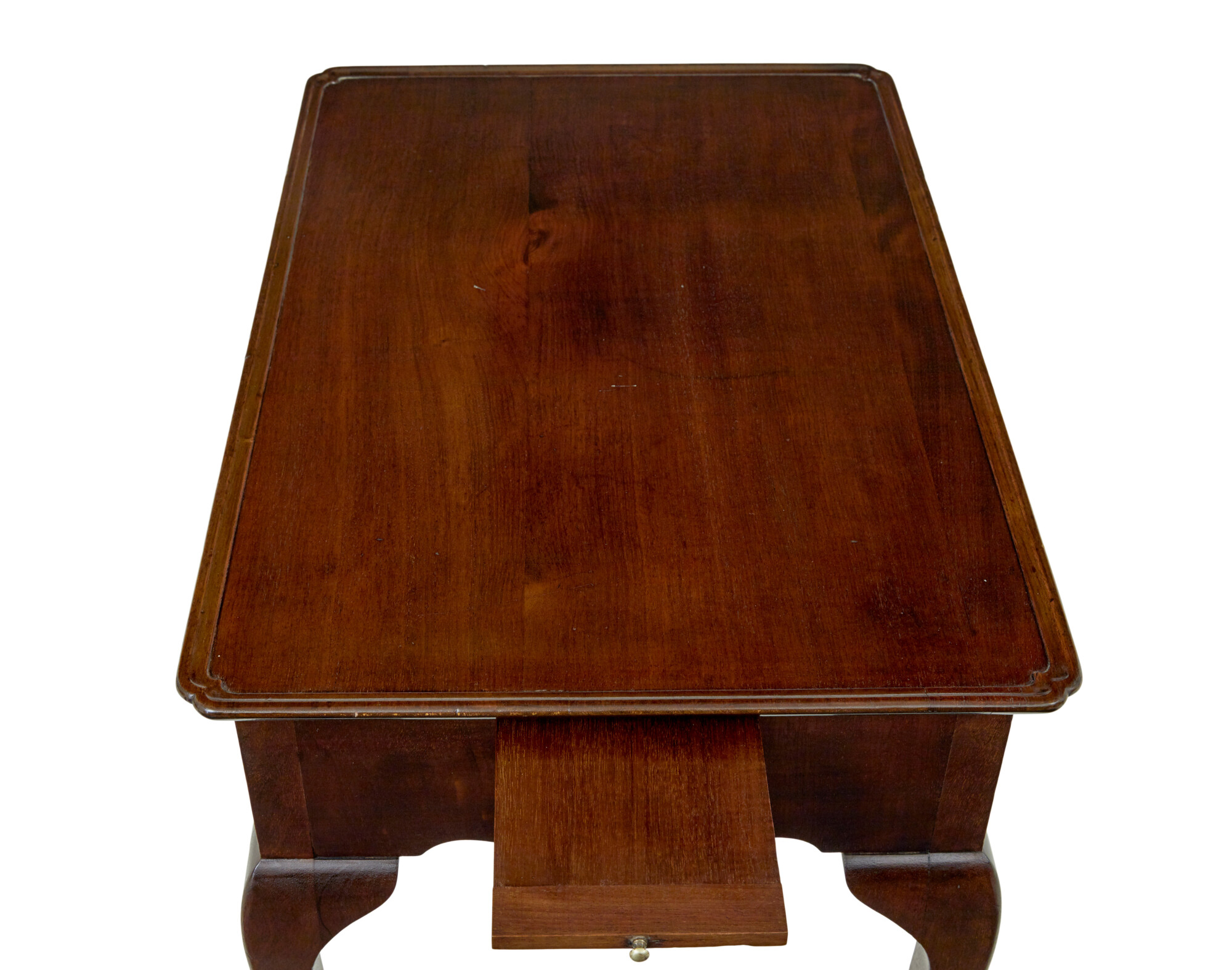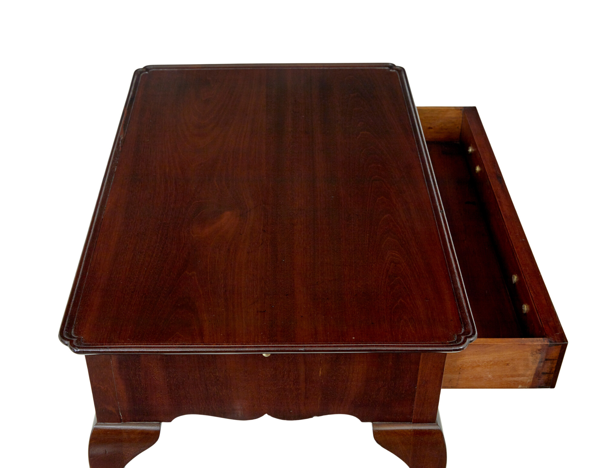 RECTANGULAR DISH TOP WITH A SINGLE DRAWER BELOW, FITTED WITH ORNATE BRASS HANDLES. ADDITIONAL FEATURE OF HAVING A SMALL CANDLE/BRUSHING SLIDE EACH SIDE. SHAPED FRIEZE TO FRONT AND SIDES. RAISED ON CABRIOLE LEGS AND A SMALL SHAPED FOOT.