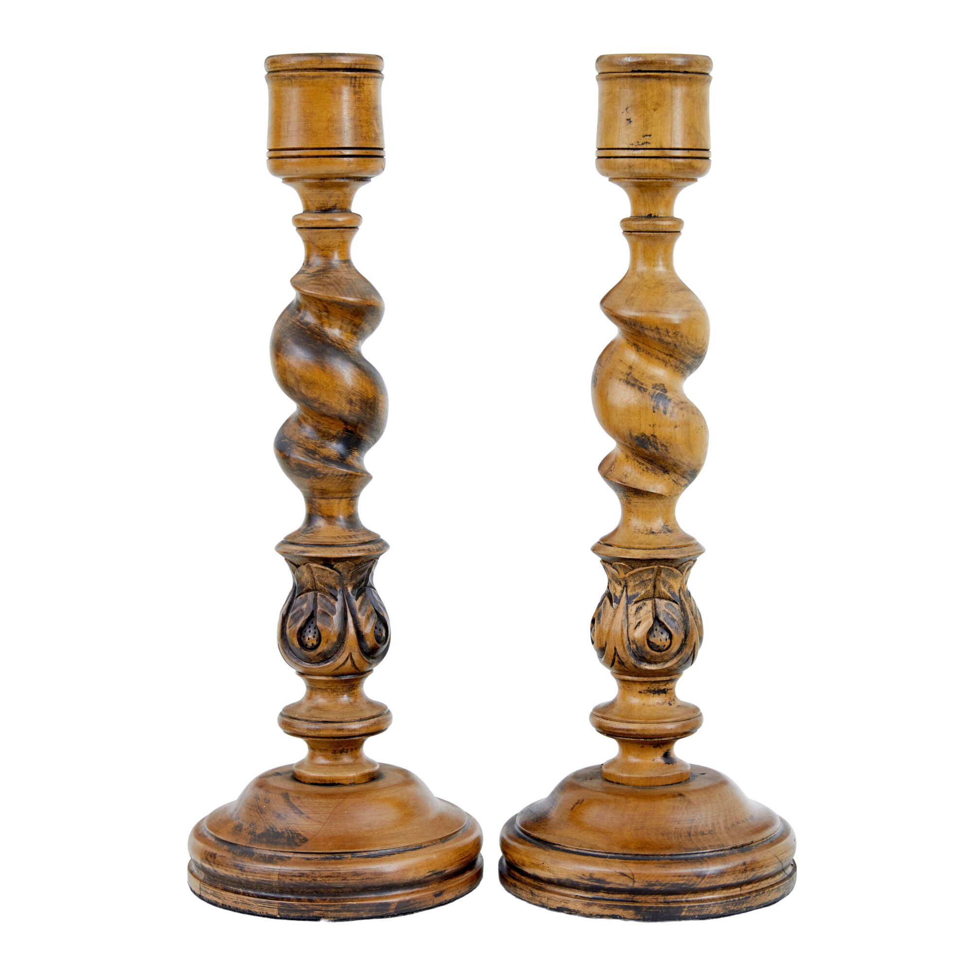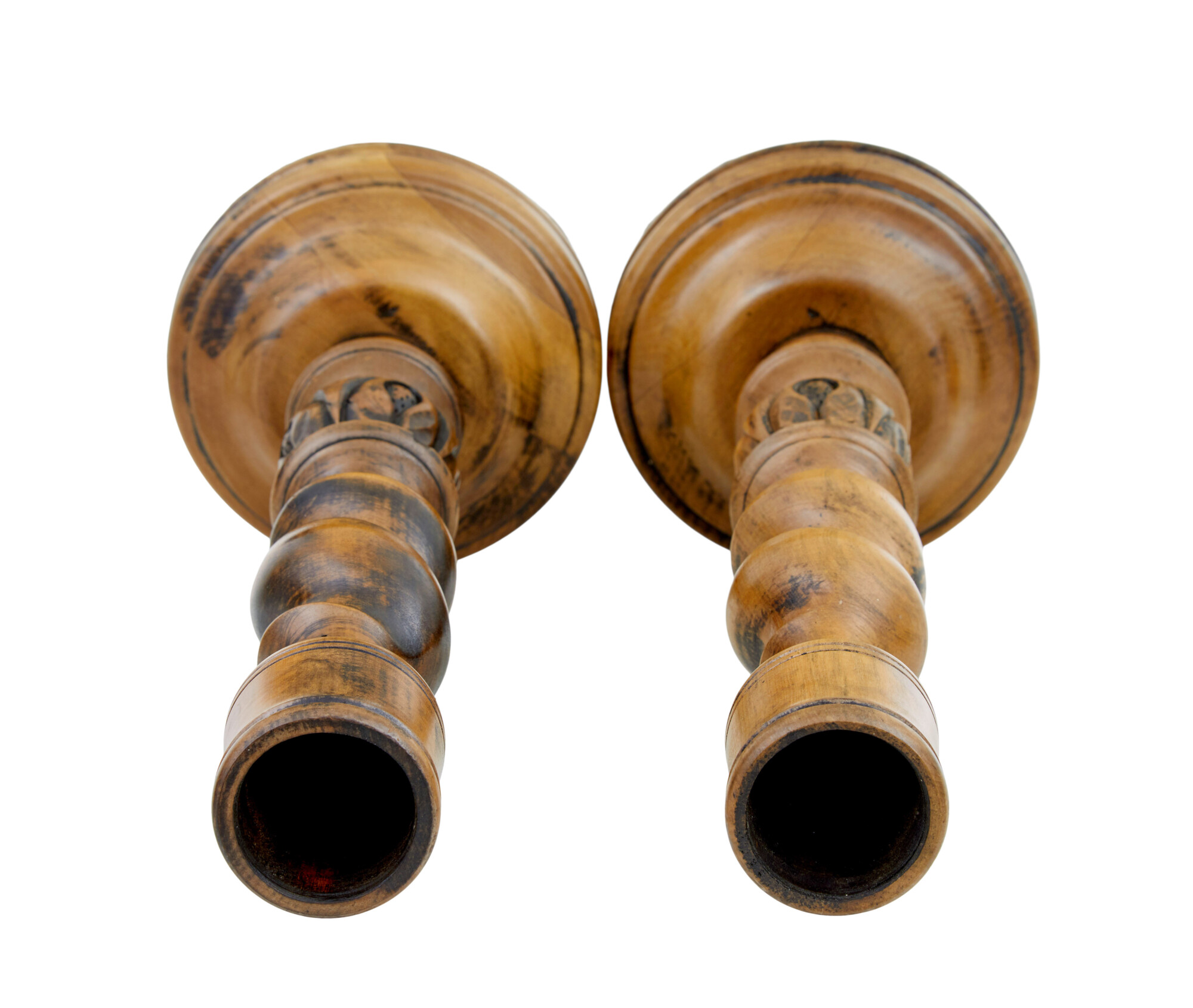 GOOD QUALITY PAIR OF HAND CARVED CANDLESTICKS MADE FROM BEECH, VERY MUCH IN THE GOTHIC TASTE.