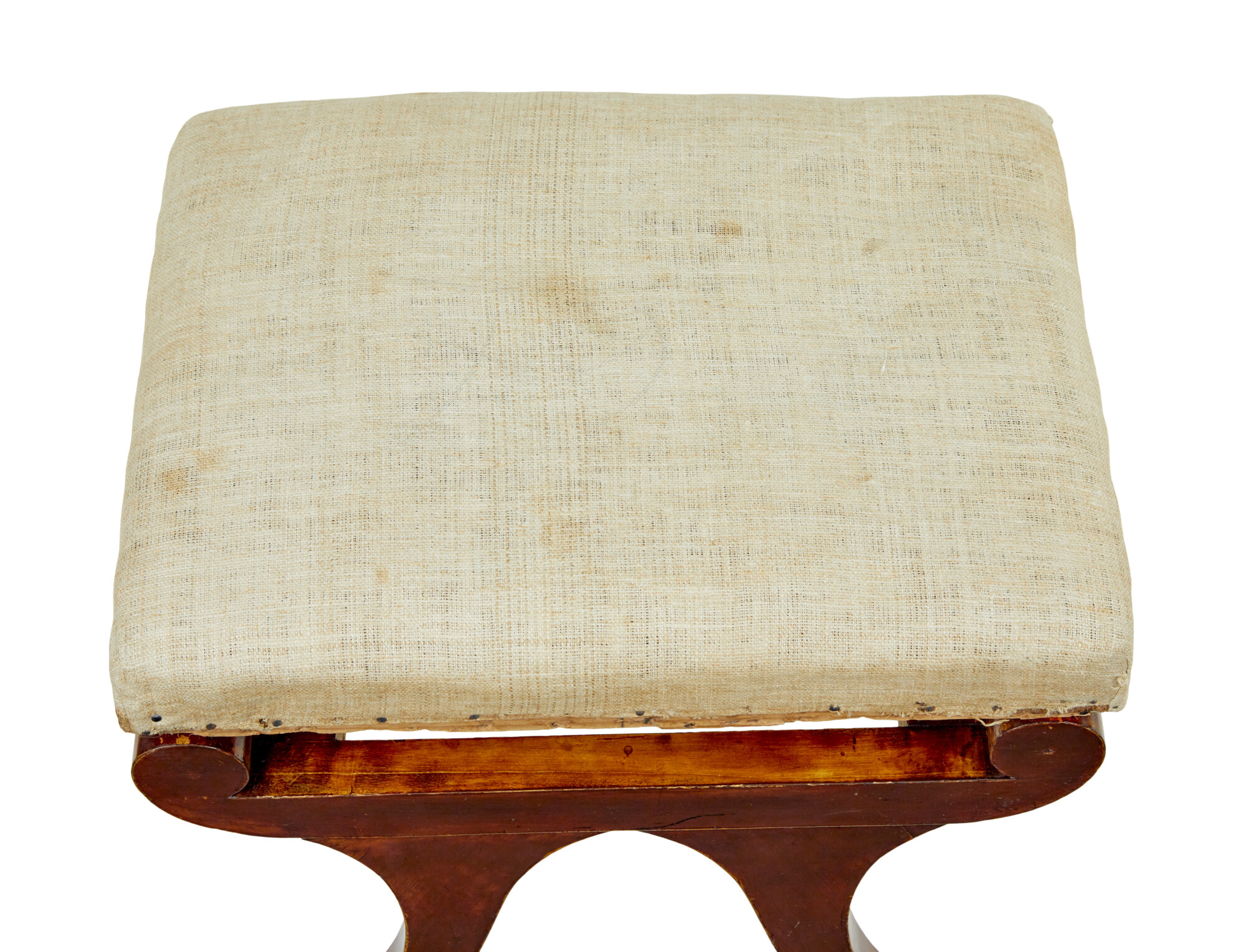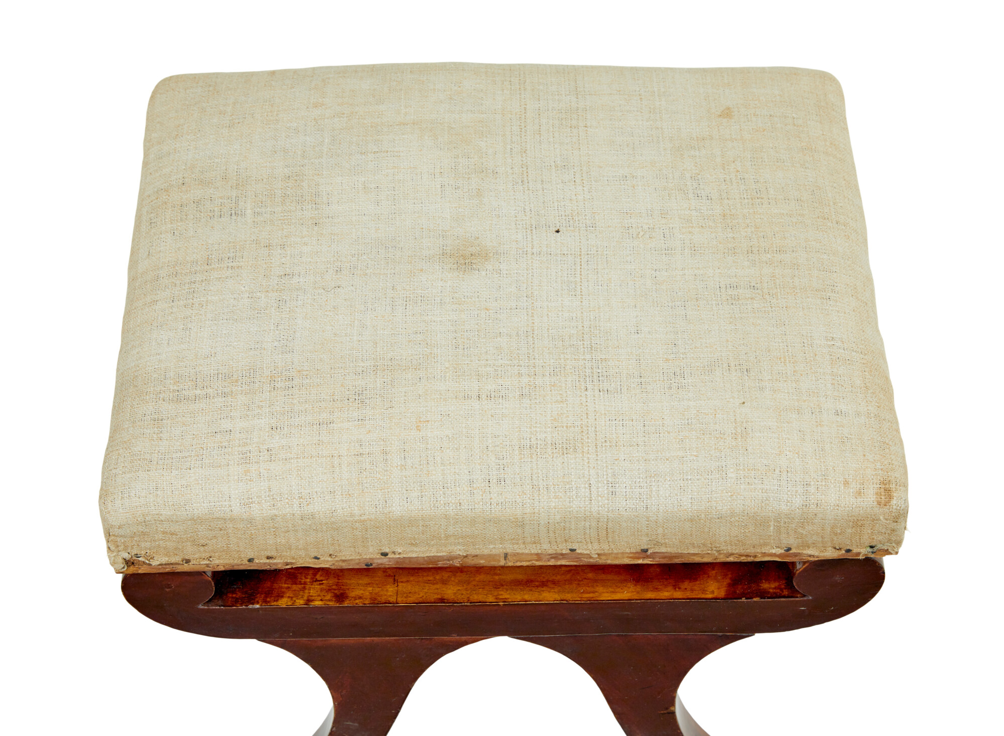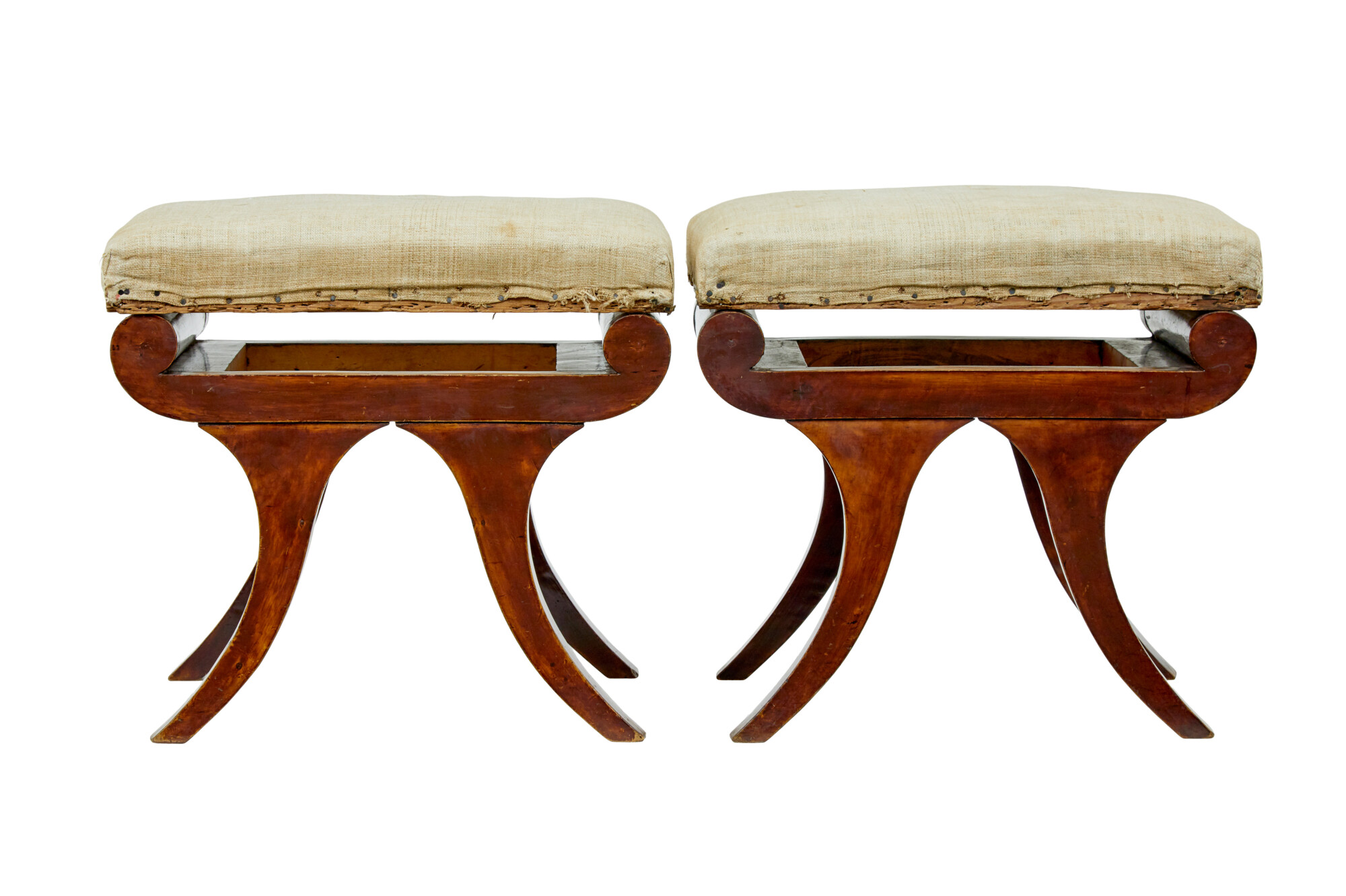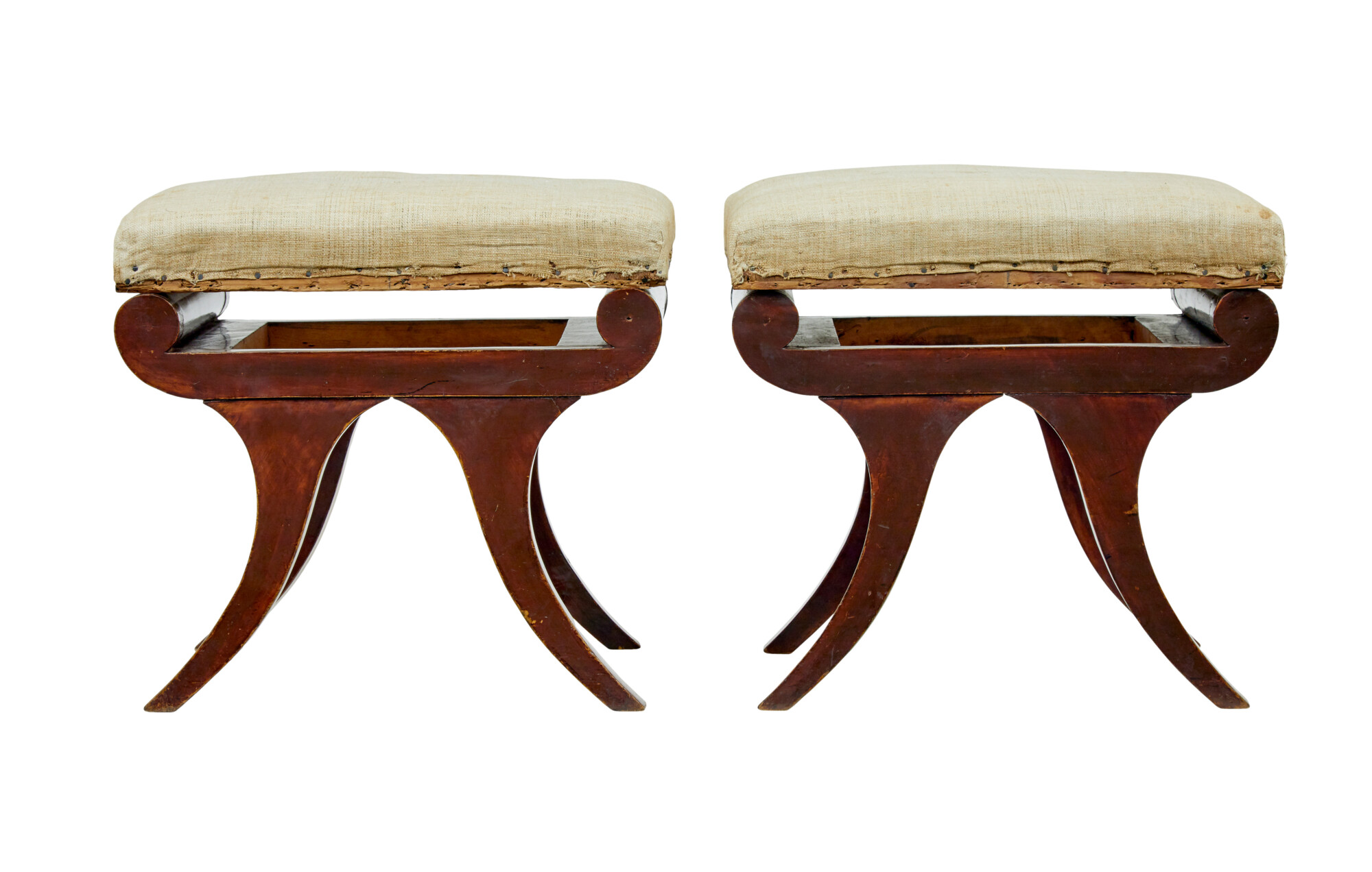 CURULE LIKE SHAPED SCROLLED LEGS, TRADITIONALLY UPHOLSTERED SEATS ARE COVERED IN AN OLD CALICO AND READY TO BE RE-COVERED. THESE SEATS SEAT ON A ROLL TOP SUPPORT ON THE FRAME AND ALLOWS YOU TO SEE UNDERNEATH.