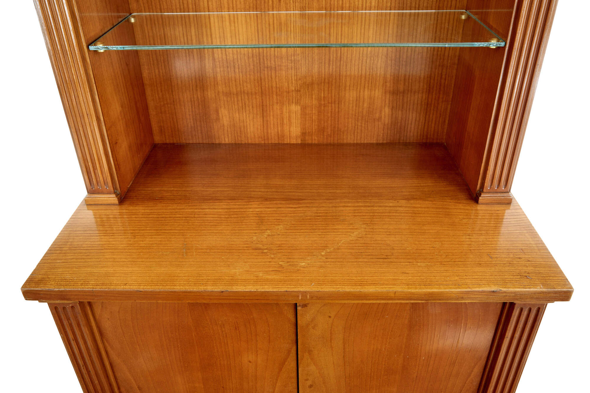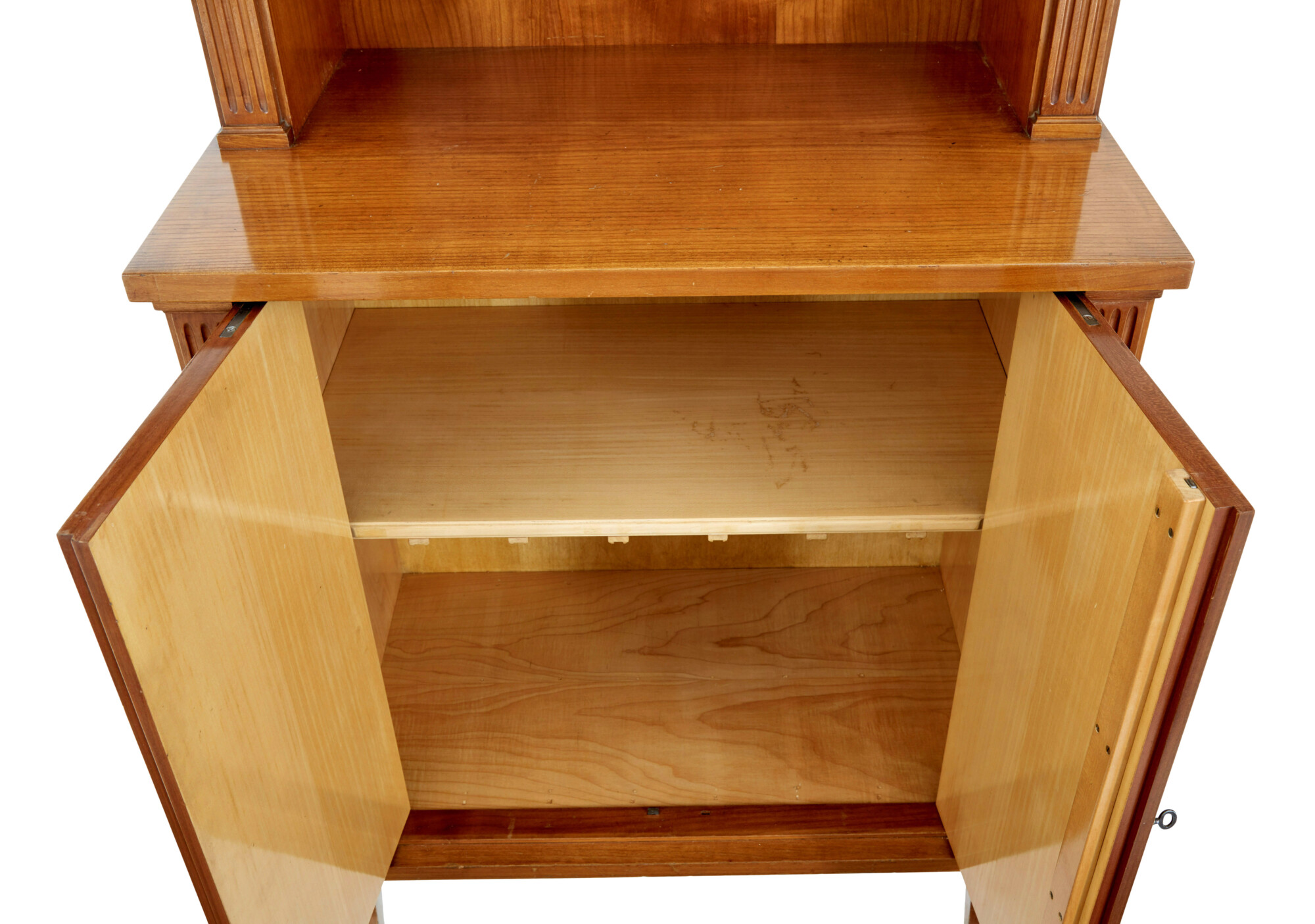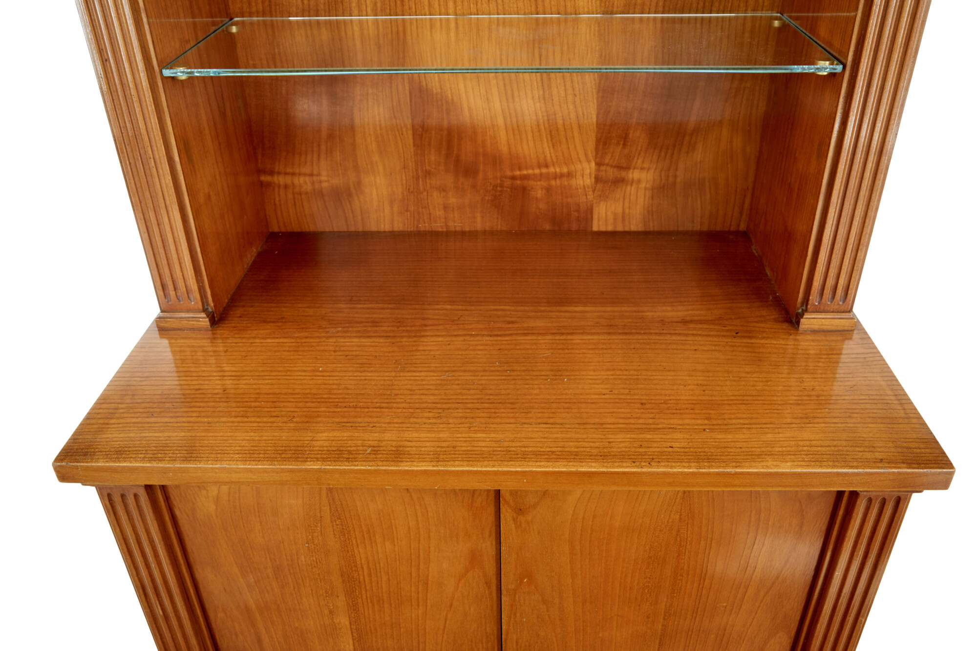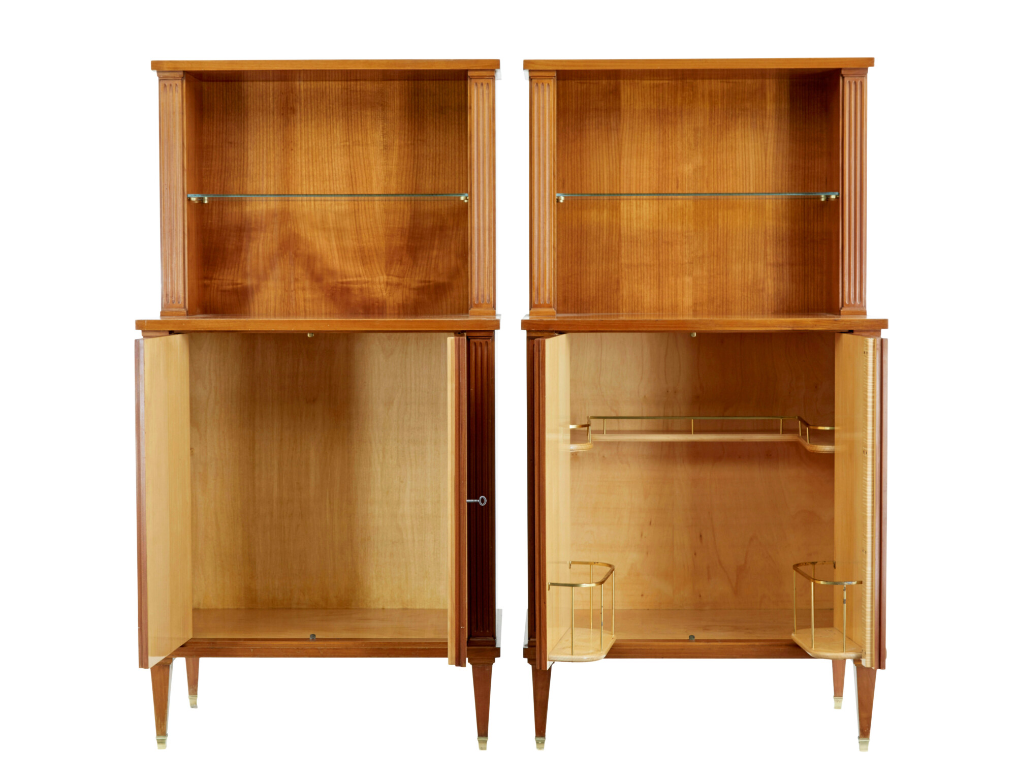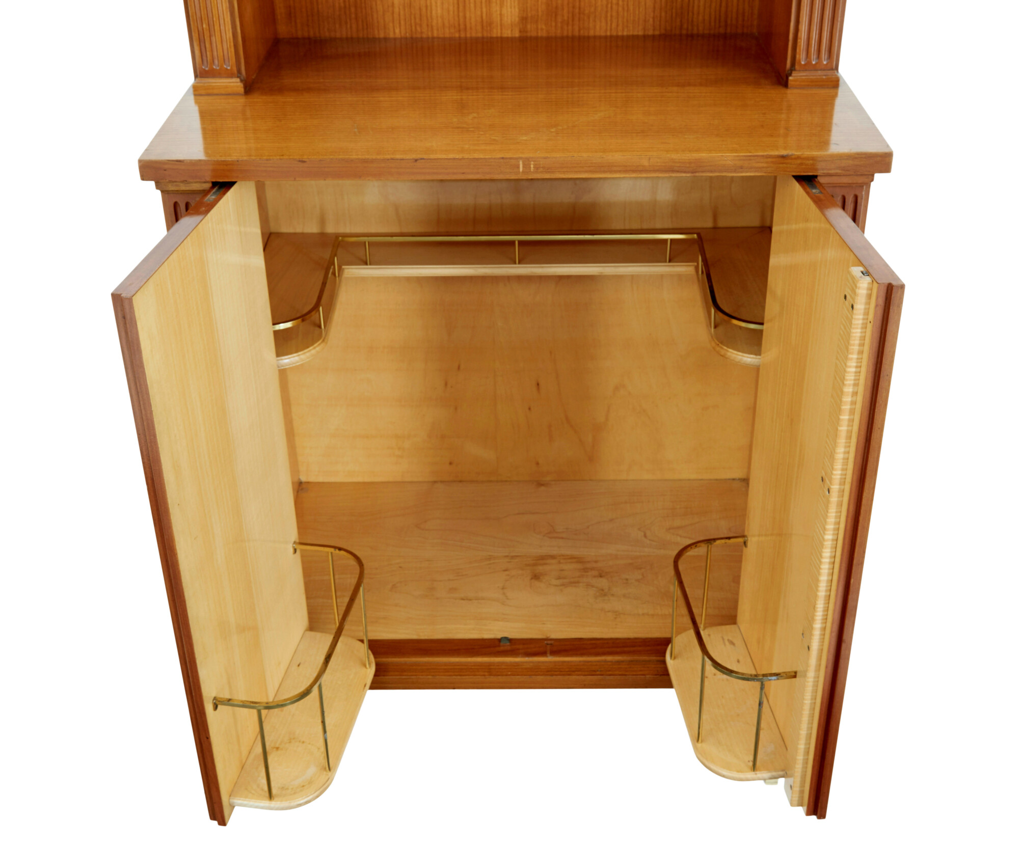 EACH MADE IN 1 PIECE, BOTH FEATURE AND OPEN APERTURE WITH A SINGLE GLASS SHELF HELD IN PLACE BY BRASS BRACKETS. THESE SHELVES HAVE JUST BEEN REPLACED WITH TOUGHENED GLASS AND POLISHED EDGES. BELOW THE TOP SURFACE EACH CABINET HAS DOUBLE DOORS THAT OPEN TO REVEAL DIFFERENT INTERIORS. 1 CONTAINING A SINGLE SHELF WITH PARTITION POTENTIAL, AND THE OTHER WITH A SHAPED SHELF AND DOOR MOUNTED SHELVES WITH BRASS GALLERIES. LENDING ITSELF PERFECTLY TO A DRINKS BAR.