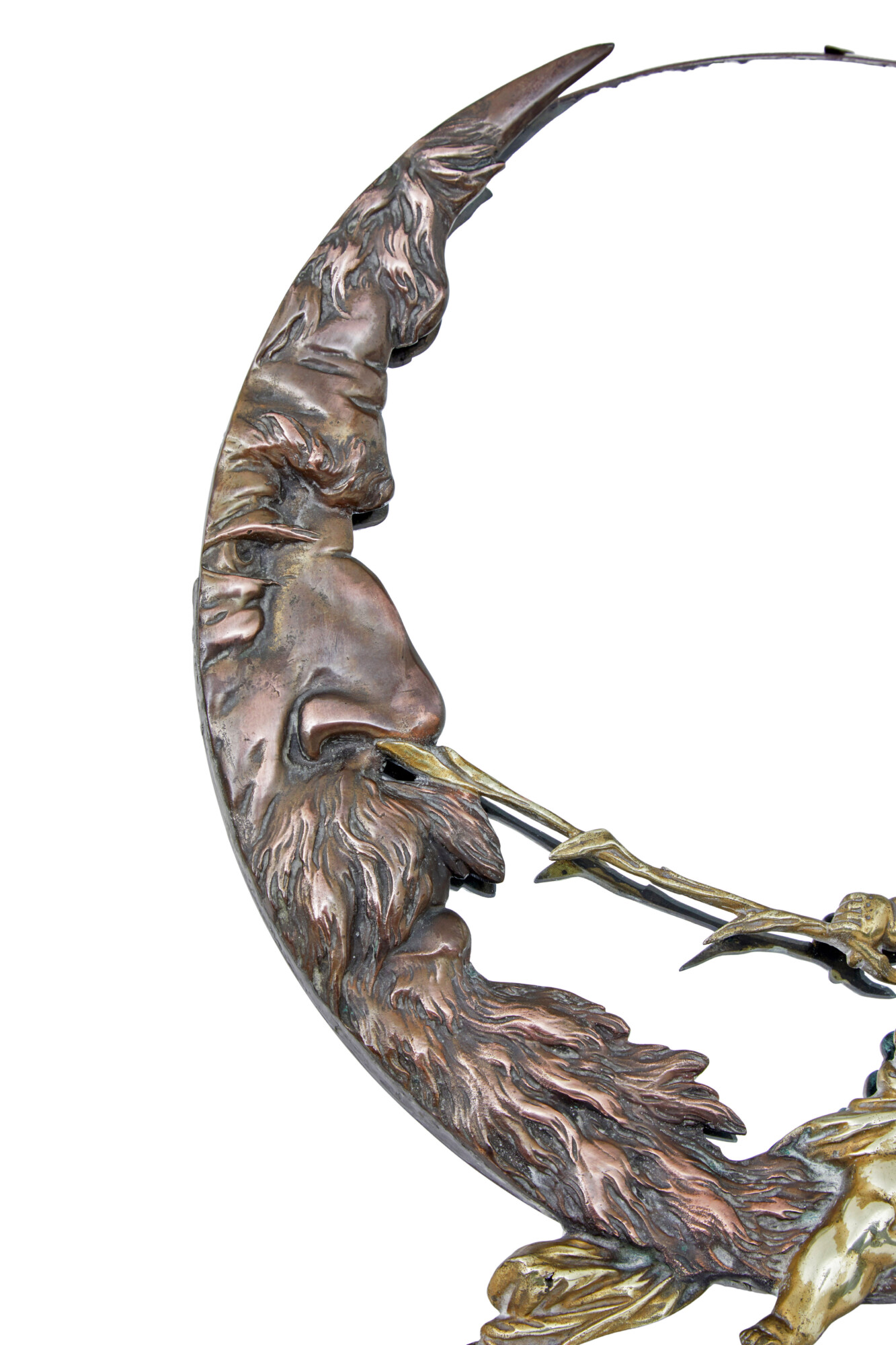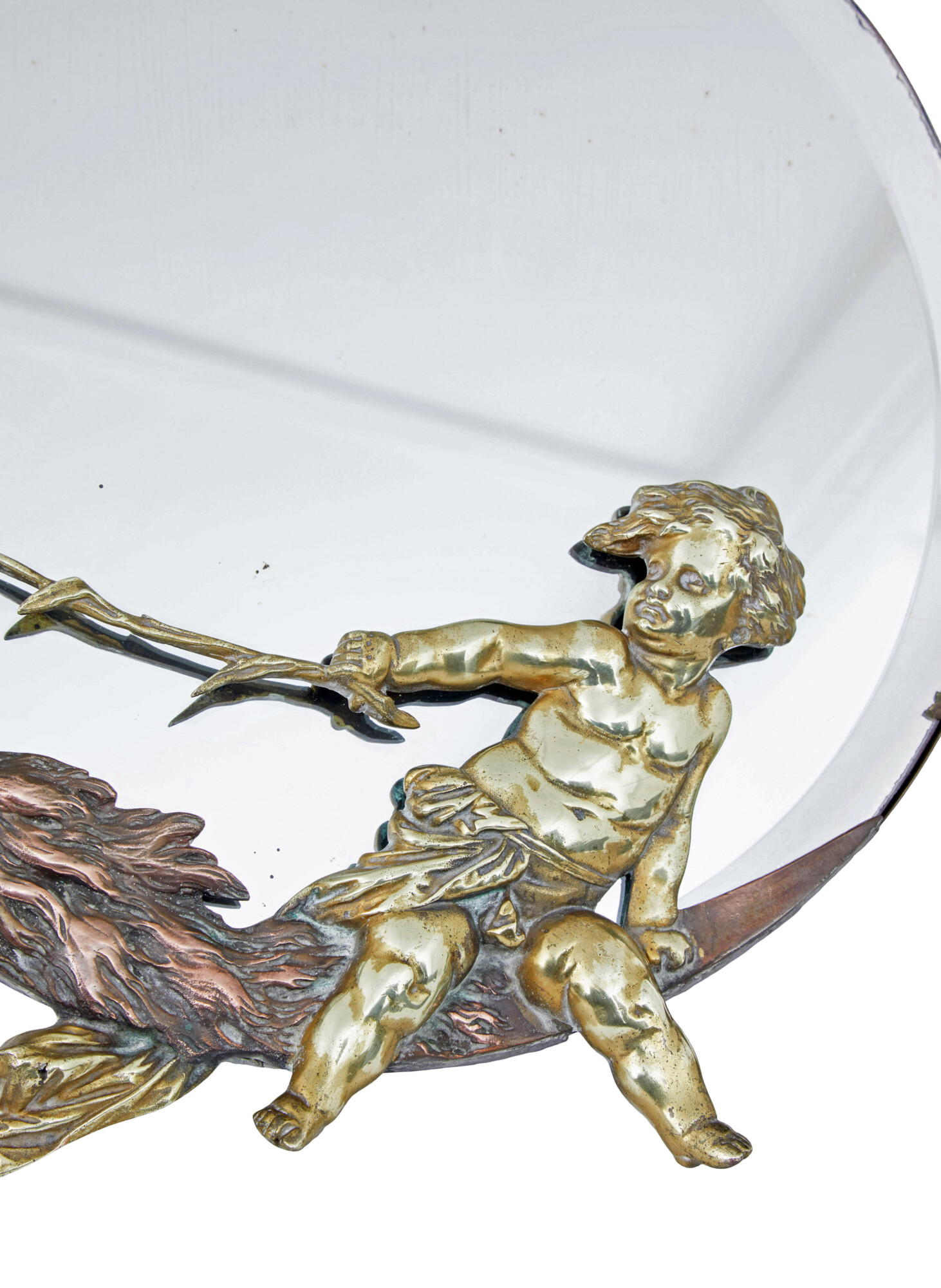 STUNNING ART DECO TABLE TOP MIRROR, DEPICTING A CHERUB TICKLING THE NOSE OF A CRESENT SHAPED MYTHICAL FACE. CIRCULAR MIRROR WITH BEVELLED EDGE.