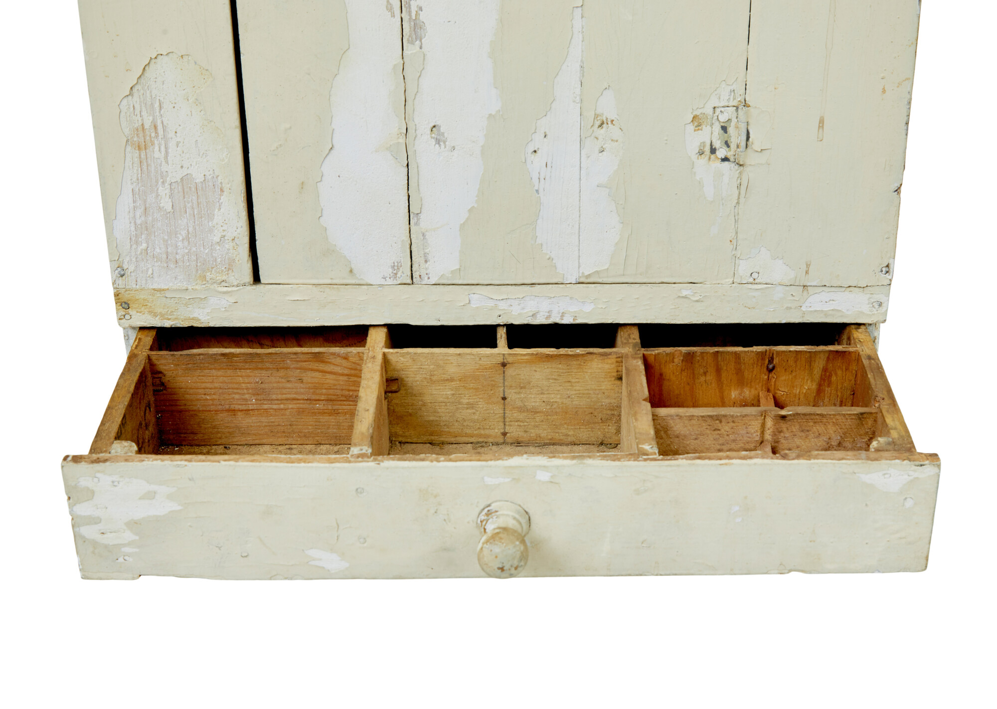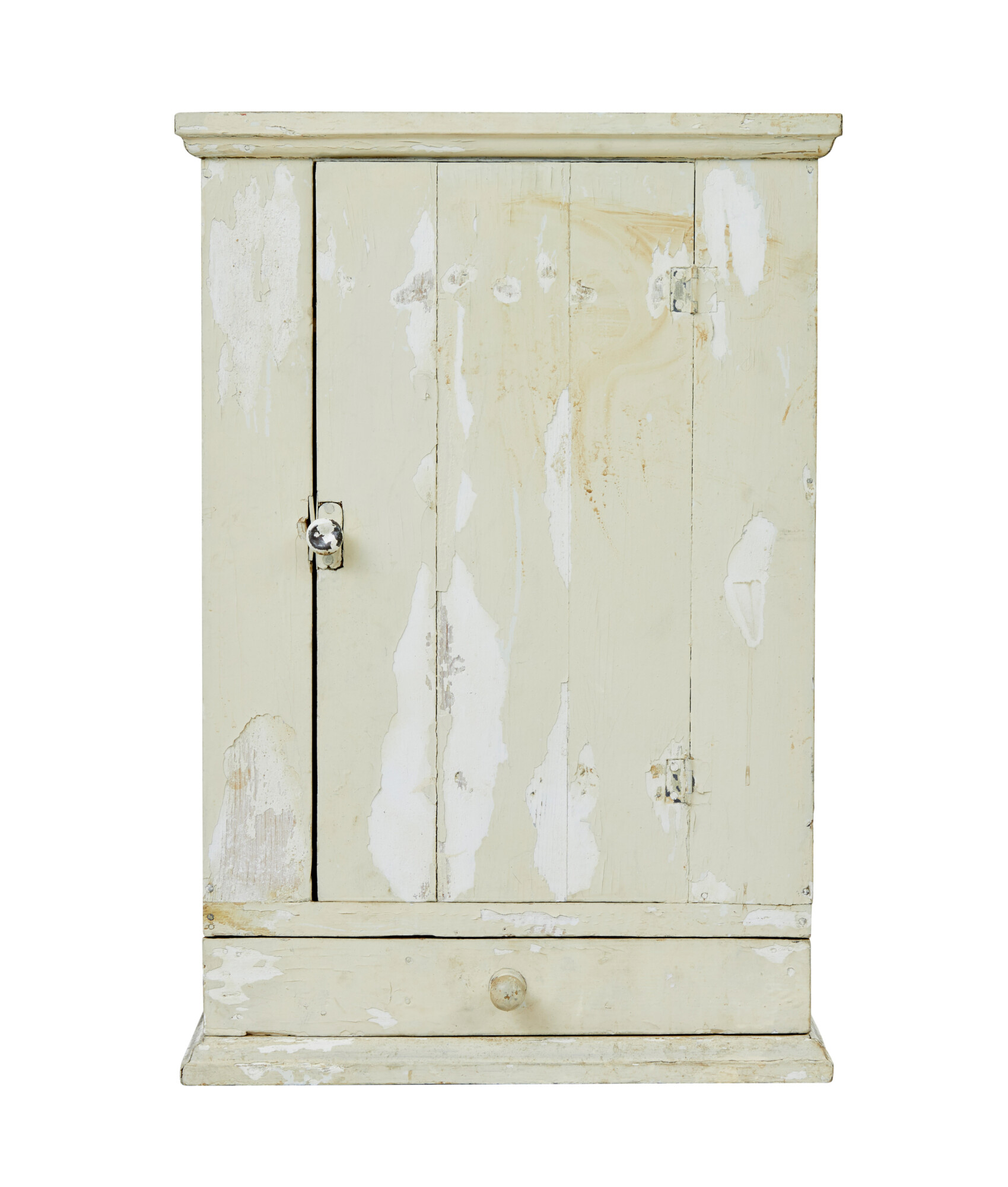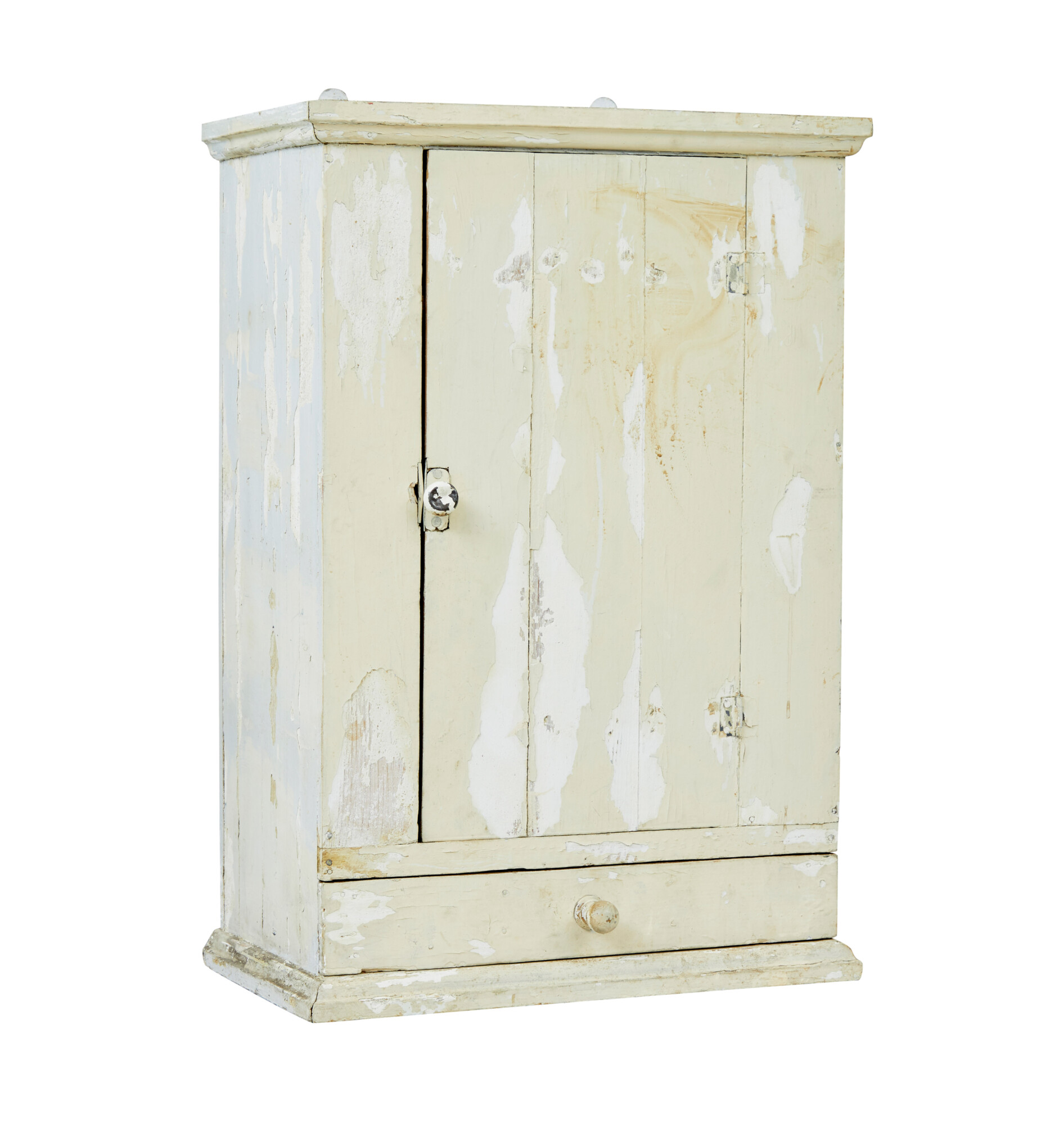 RUSTIC PAINTED SWEDISH WALL CUPBOARD MADE IN PINE. TOP COAT OF A CREAMY WHITE IS PEELING BACK TO REVEAL A WHITE BASE COLOUR UNDERNEATH. SINGLE DOOR OPENS TO REVEAL 2 FIXED SHELVES AND FURTHER STORAGE BELOW, A FURTHER DRAWER FITTED WITH PARTITIONS COMPLETES THE STORAGE POTENTIAL FOR THIS WALL MOUNTED CUPBOARD.