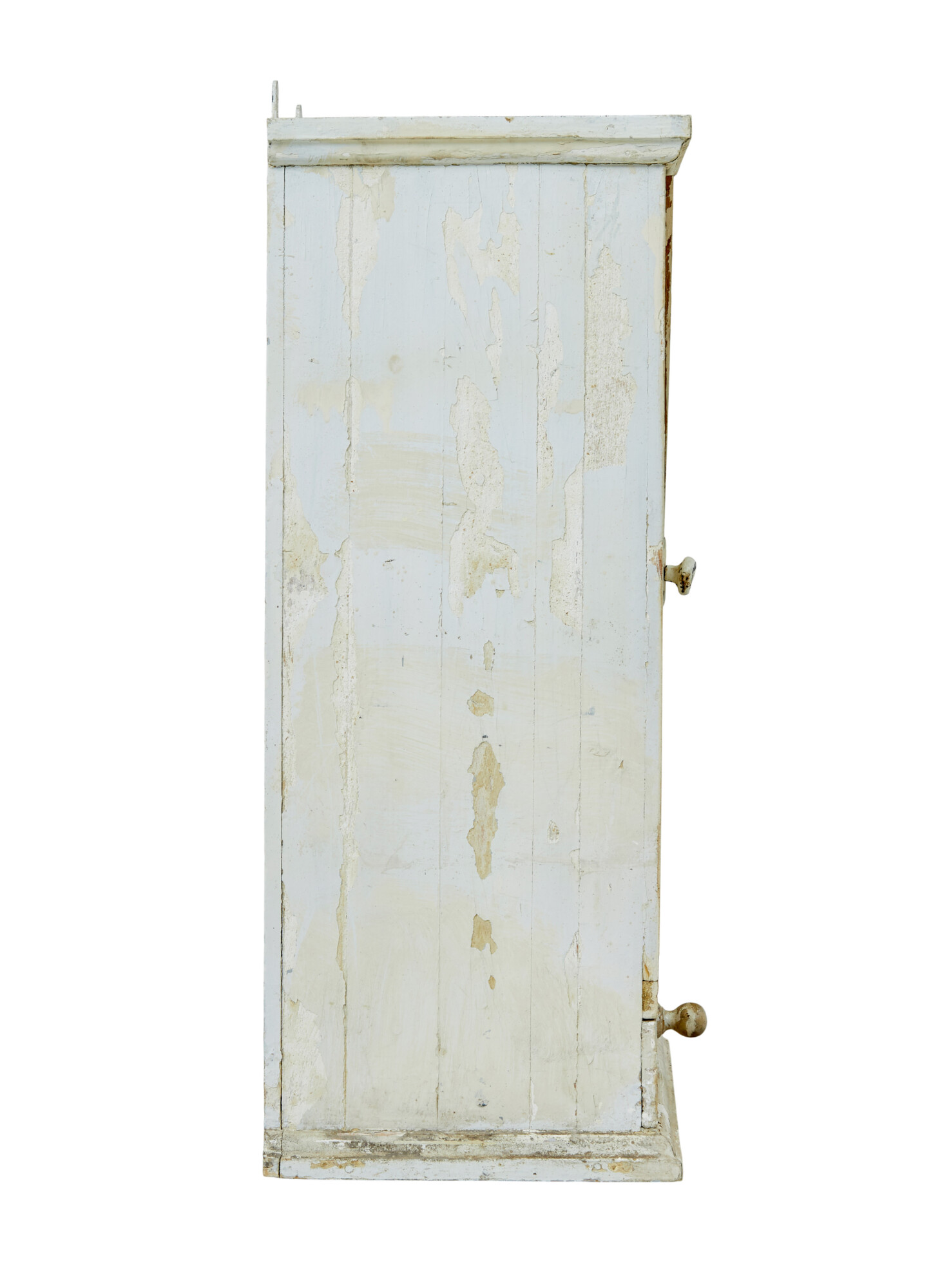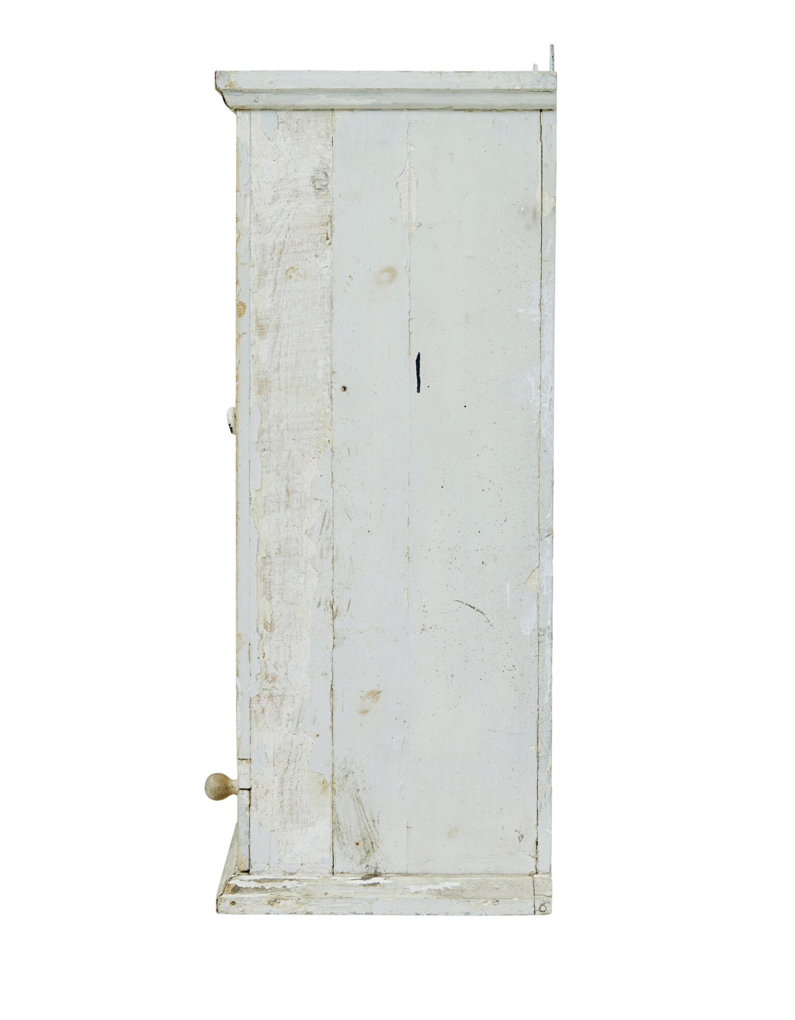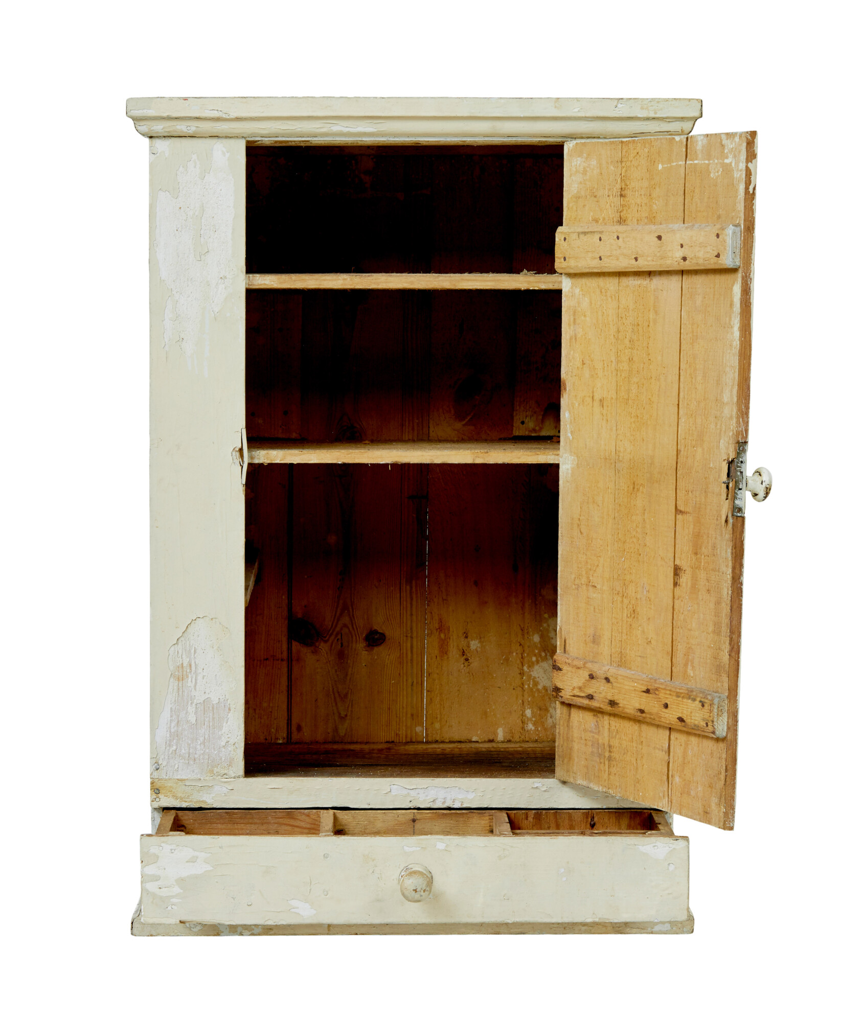 RUSTIC PAINTED SWEDISH WALL CUPBOARD MADE IN PINE. TOP COAT OF A CREAMY WHITE IS PEELING BACK TO REVEAL A WHITE BASE COLOUR UNDERNEATH. SINGLE DOOR OPENS TO REVEAL 2 FIXED SHELVES AND FURTHER STORAGE BELOW, A FURTHER DRAWER FITTED WITH PARTITIONS COMPLETES THE STORAGE POTENTIAL FOR THIS WALL MOUNTED CUPBOARD.