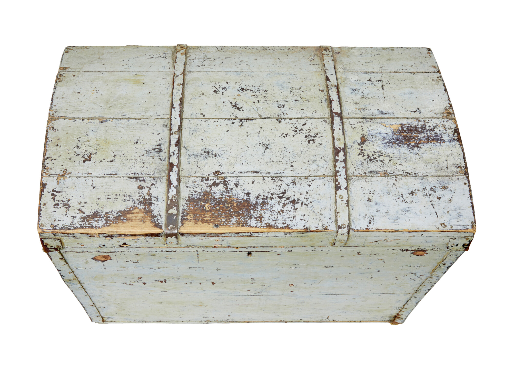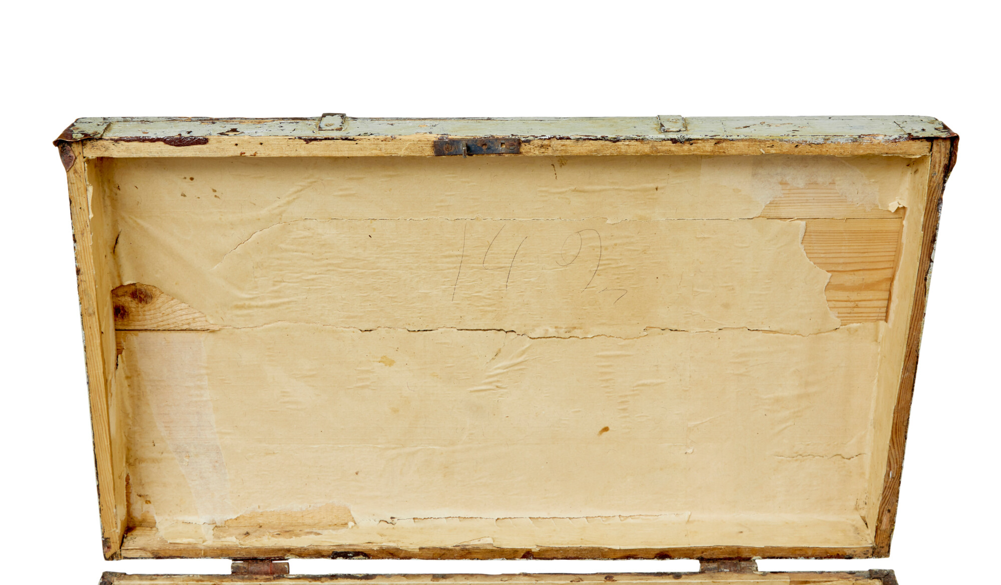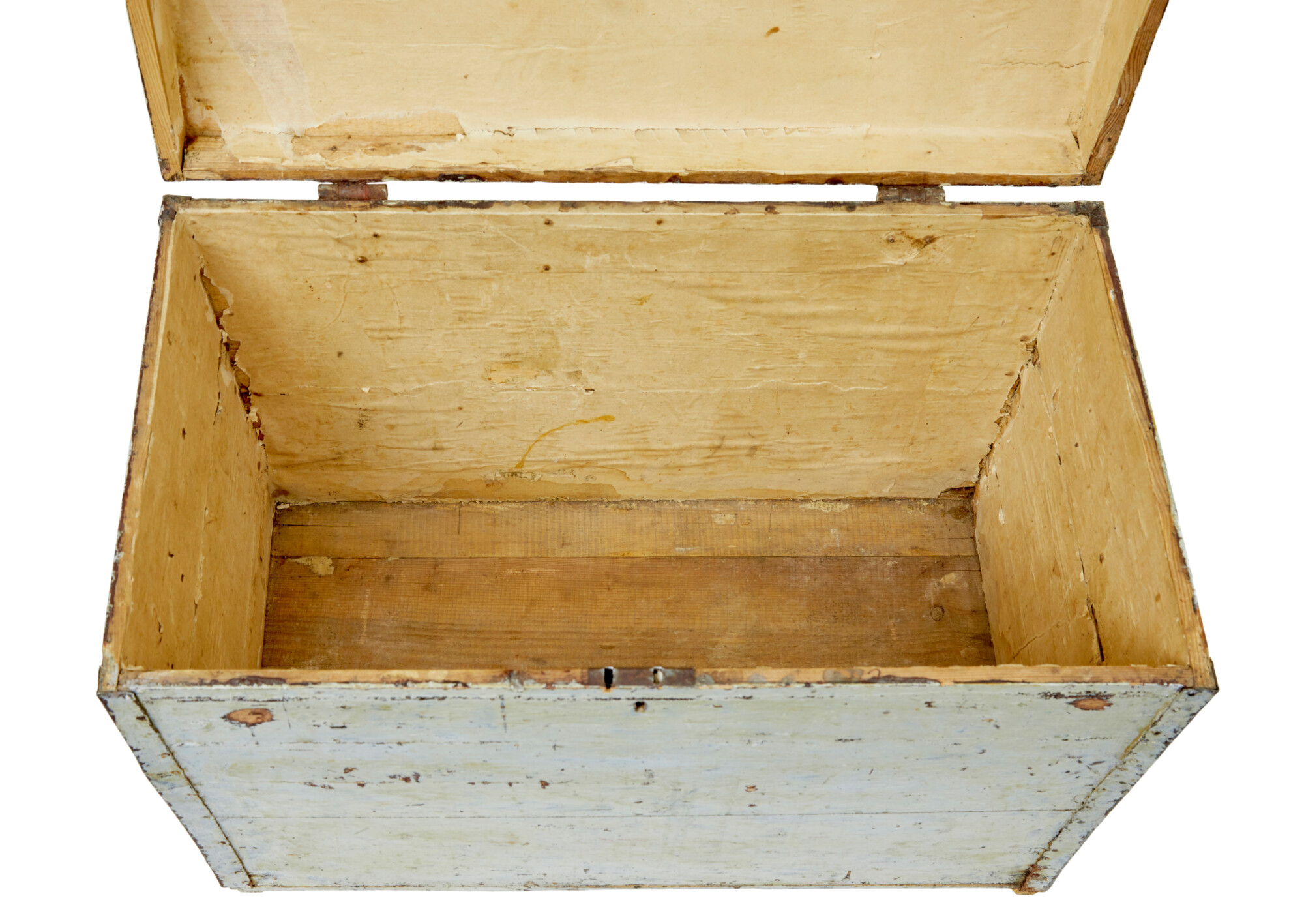 MADE FROM PINE AND PRESENTED IN ORIGINAL PAINT AND CARRYING HANDLES TO EACH SIDE. THE SLIGHT DOMED LID OPENS AND HOLDS ITSELF IN PLACE. TRACES OF ORIGINAL PAPER LINING TO THE INTERIOR. NO KEY AND LOCK NO LONGER WORKING.