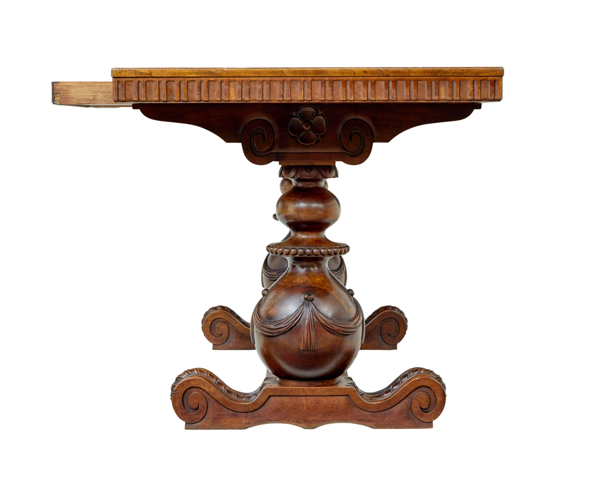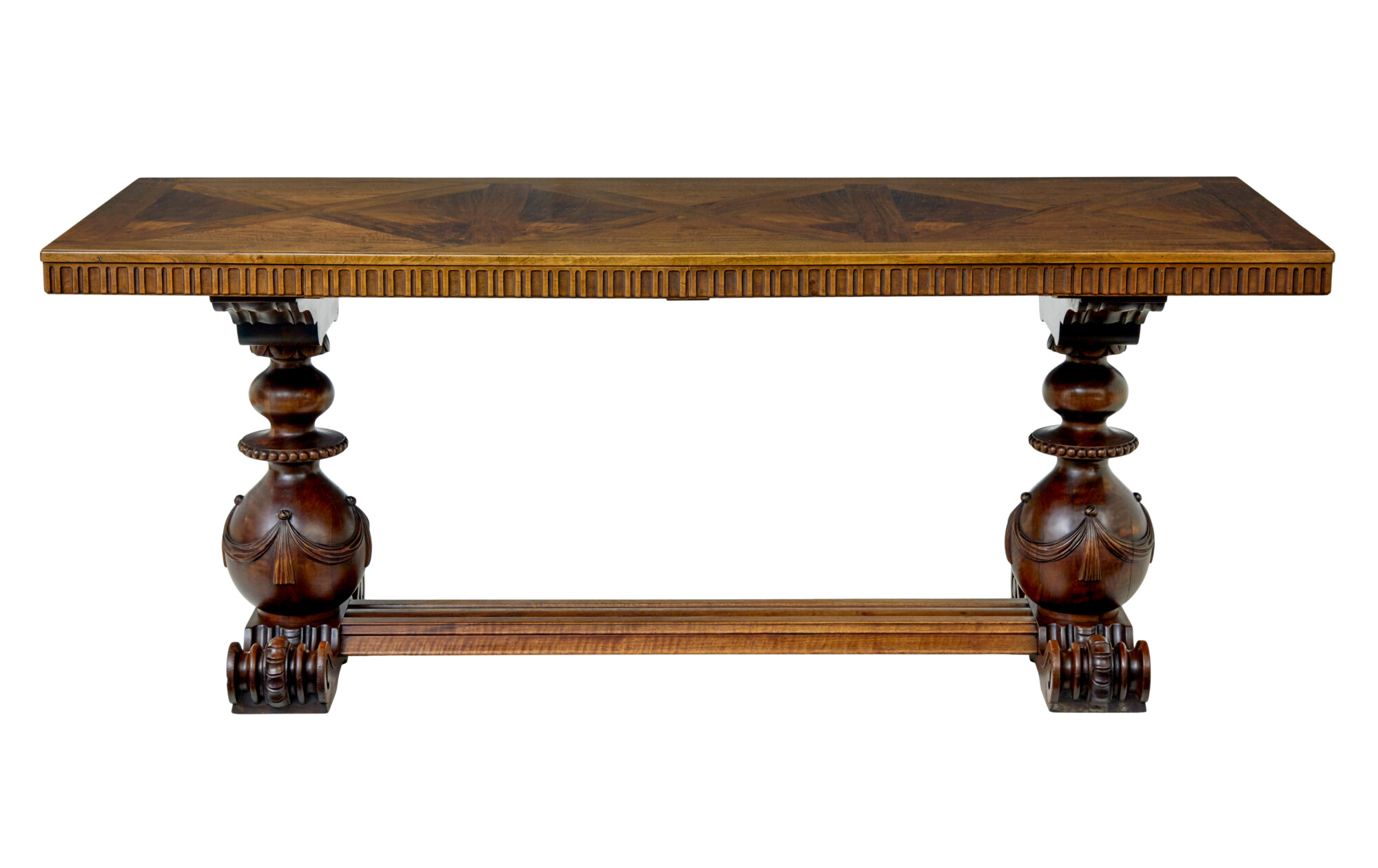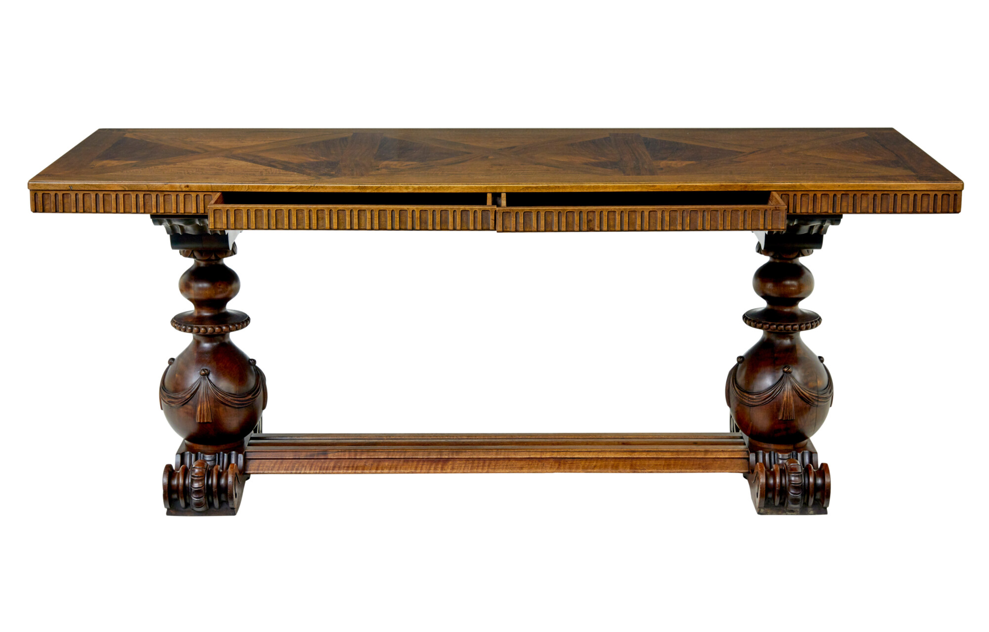 RECTANGULAR TOP WITH A 3 PART SEGMENTED DESIGN TO THE TOP ENCASED IN A WALNUT BORDER.  FLUTED APRON WHICH HOUSES THE 2 CONCEALED SHALLOW DRAWERS, WHICH HAVE SMALL BOLTS FOR LOCKING.  RAISED ON A PAIR OF PAIR OF CARVED AND TURNED SUPPORTS, APPLIED SWAGS TO THE BULBOUS ELEMENT THAT LINKS DOWN TO THE HEAVILY CARVED SCROLLING FEET.  SUPPORTS UNITED BY A CARVED FLOOR LEVEL STRETCHER.