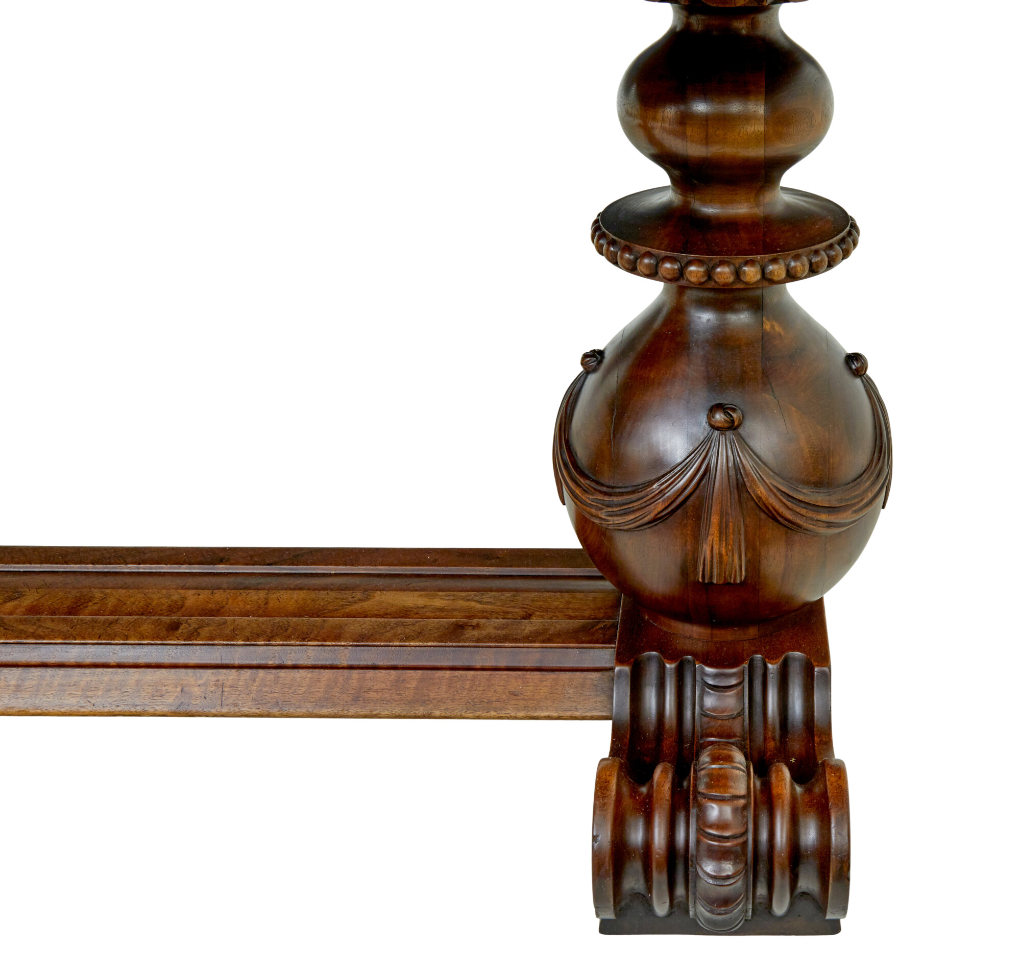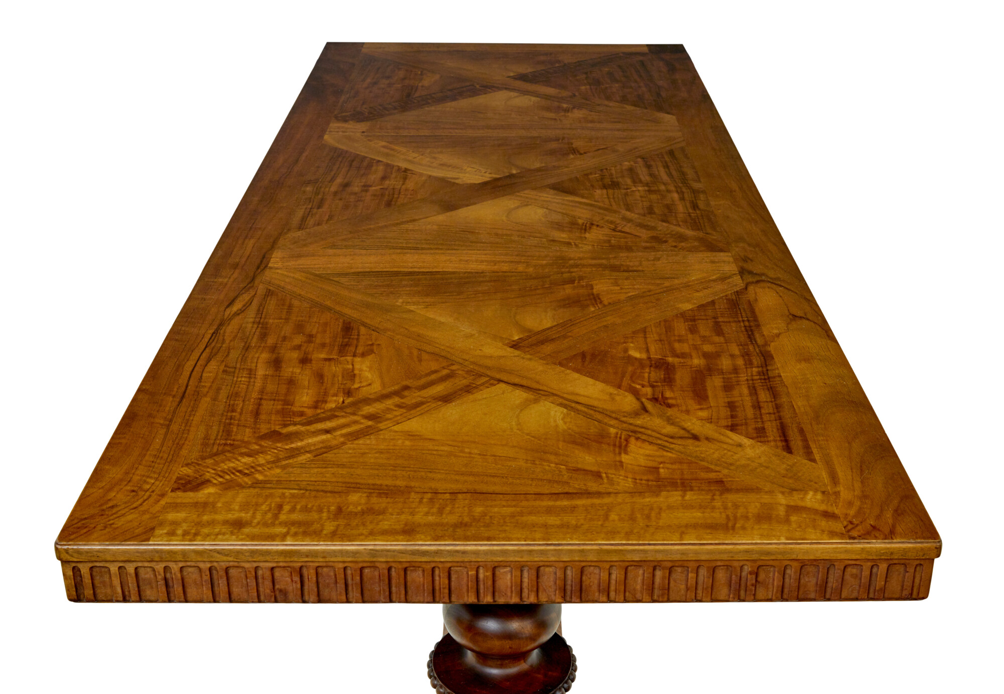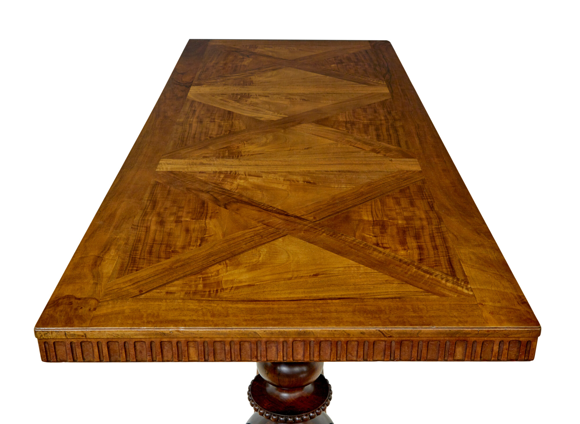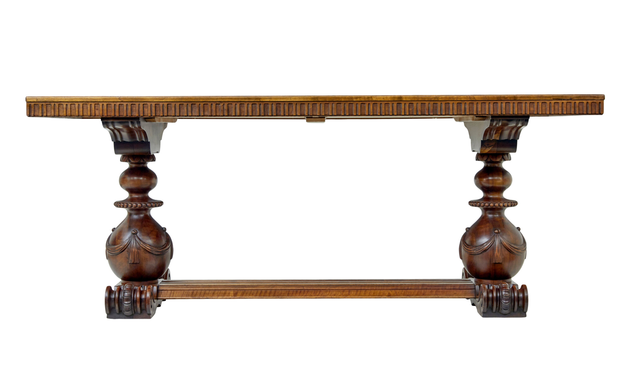 RECTANGULAR TOP WITH A 3 PART SEGMENTED DESIGN TO THE TOP ENCASED IN A WALNUT BORDER.  FLUTED APRON WHICH HOUSES THE 2 CONCEALED SHALLOW DRAWERS, WHICH HAVE SMALL BOLTS FOR LOCKING.  RAISED ON A PAIR OF PAIR OF CARVED AND TURNED SUPPORTS, APPLIED SWAGS TO THE BULBOUS ELEMENT THAT LINKS DOWN TO THE HEAVILY CARVED SCROLLING FEET.  SUPPORTS UNITED BY A CARVED FLOOR LEVEL STRETCHER.