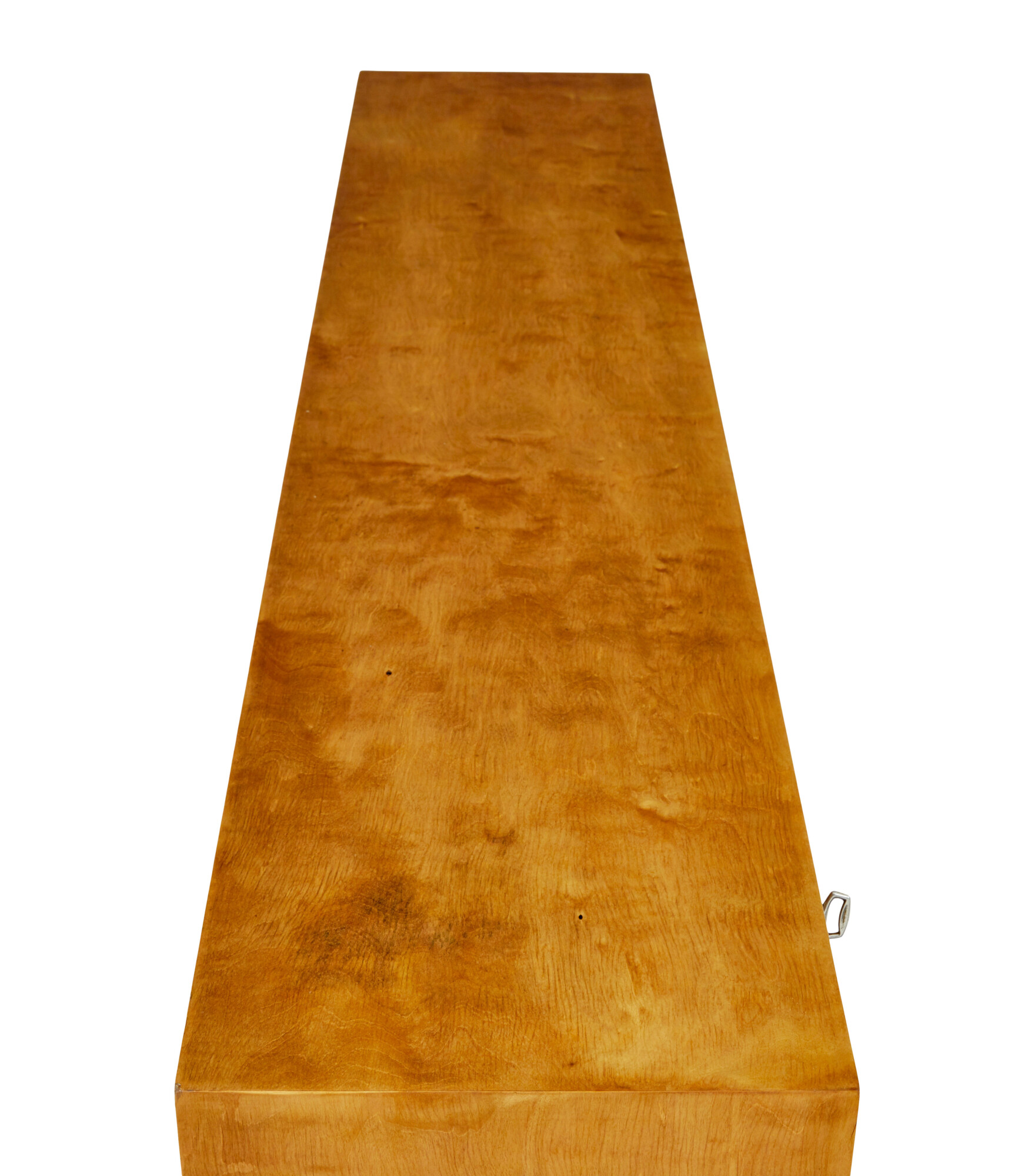BIRCH MAIN BODY WITH ELM DOOR AND DRAWER FRONTS. RECTANGULAR SHAPE WITH 3 DRAWERS DIRECTLY BELOW THE TOP SURFACE, WITH A SINGLE DOOR CUPBOARD CONTAINING A SINGLE SHELF. MAIN STORAGE FOR BOOKS OR DECORATIVE ITEMS, CONTAINS A SINGLE ADJUSTABLE SHELF. STANDING ON 4 FLUTED SHAPED FEET.