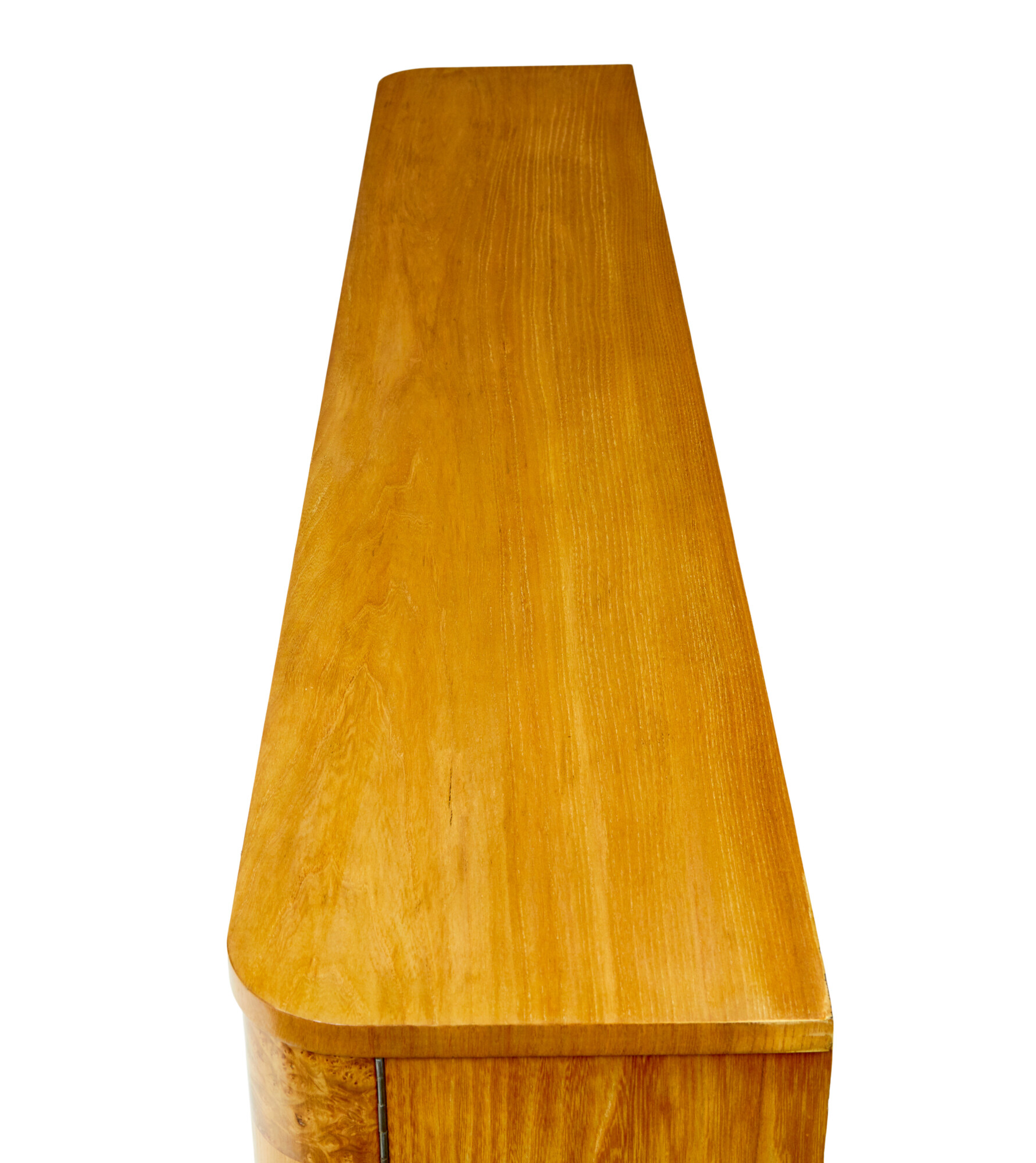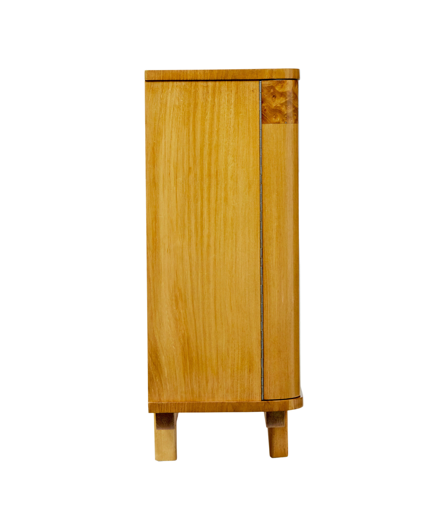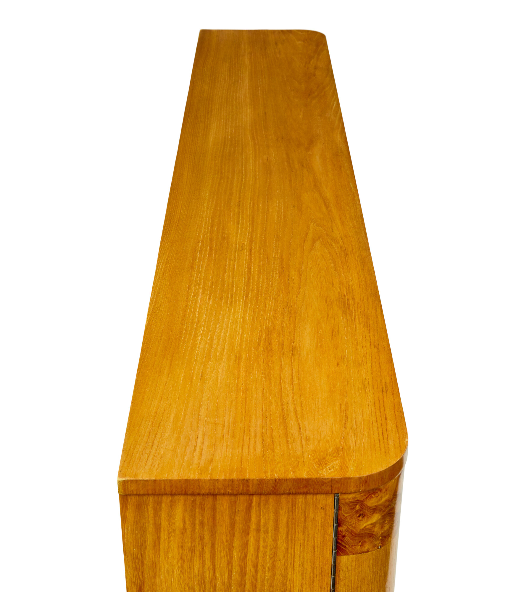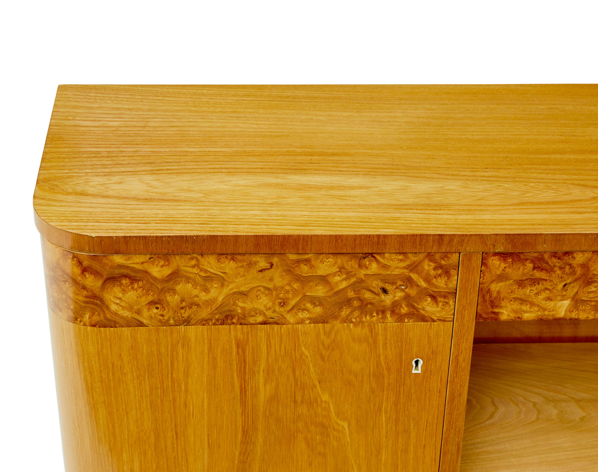 RECTANGULAR SHAPED WITH ROUNDED FRONT EDGES. VENEERED IN ELM COMPLETED WITH STRIKING DRAWERS WHICH ARE VENEERED IN A BURR. 2 CENTRAL PARTIALLY CONCEALED DRAWERS BELOW THE TOP SURFACE, BOOK STORAGE BELOW WITH A SINGLE ADJUSTABLE SHELF, FLANKED EITHER SIDE BY A SINGLE DOOR CUPBOARD. EACH CUPBOARD OPENS TO REVEAL A SINGLE FIXED POSITION SHELF. ALL RAISED ON AN ELM SUB FRAME AND 4 LEGS.