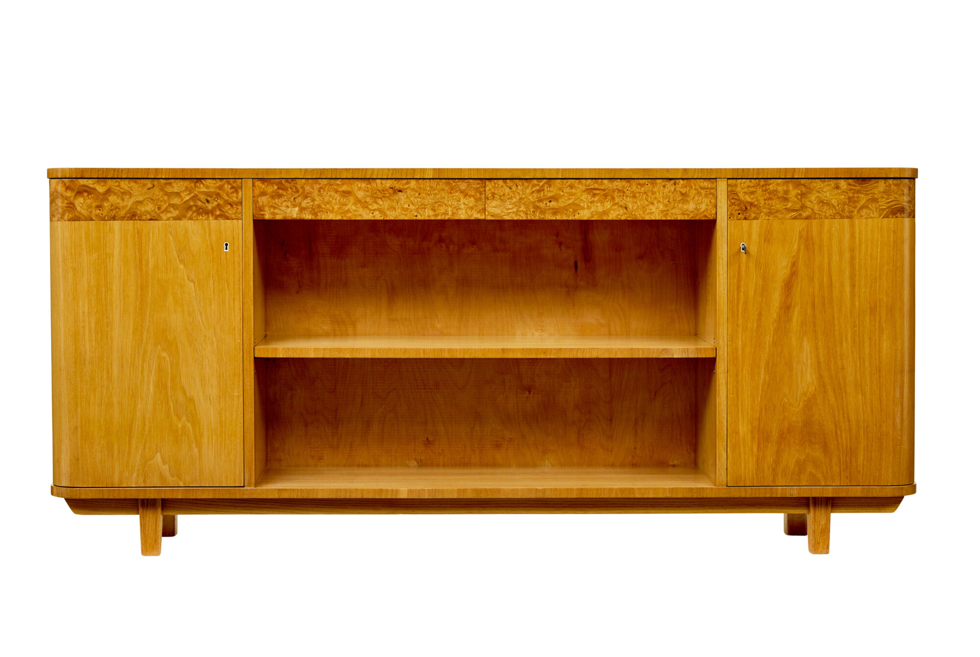 SCANDINAVIAN MID CENTURY ELM AND BURR LOW OPEN BOOKCASE CIRCA 1950.