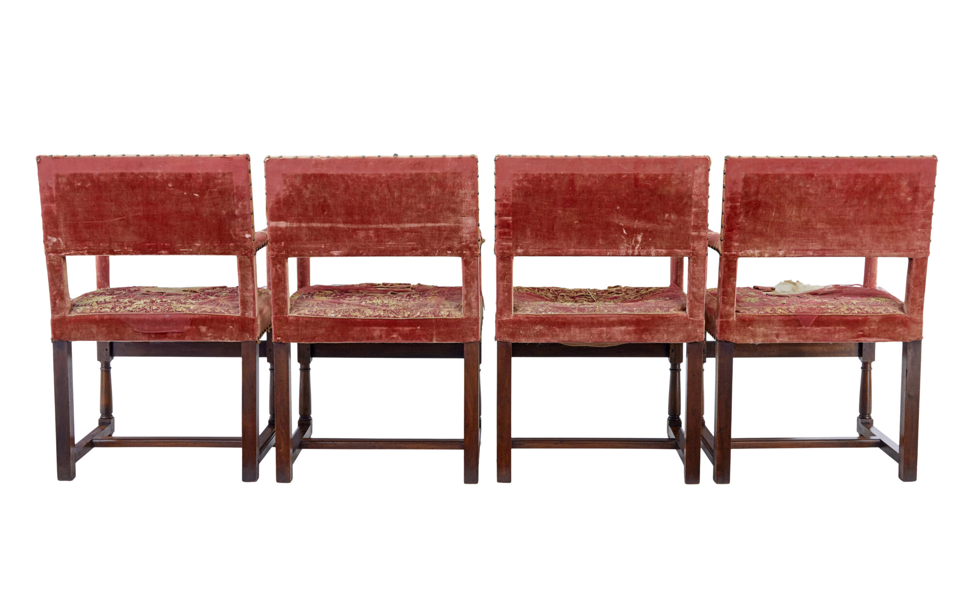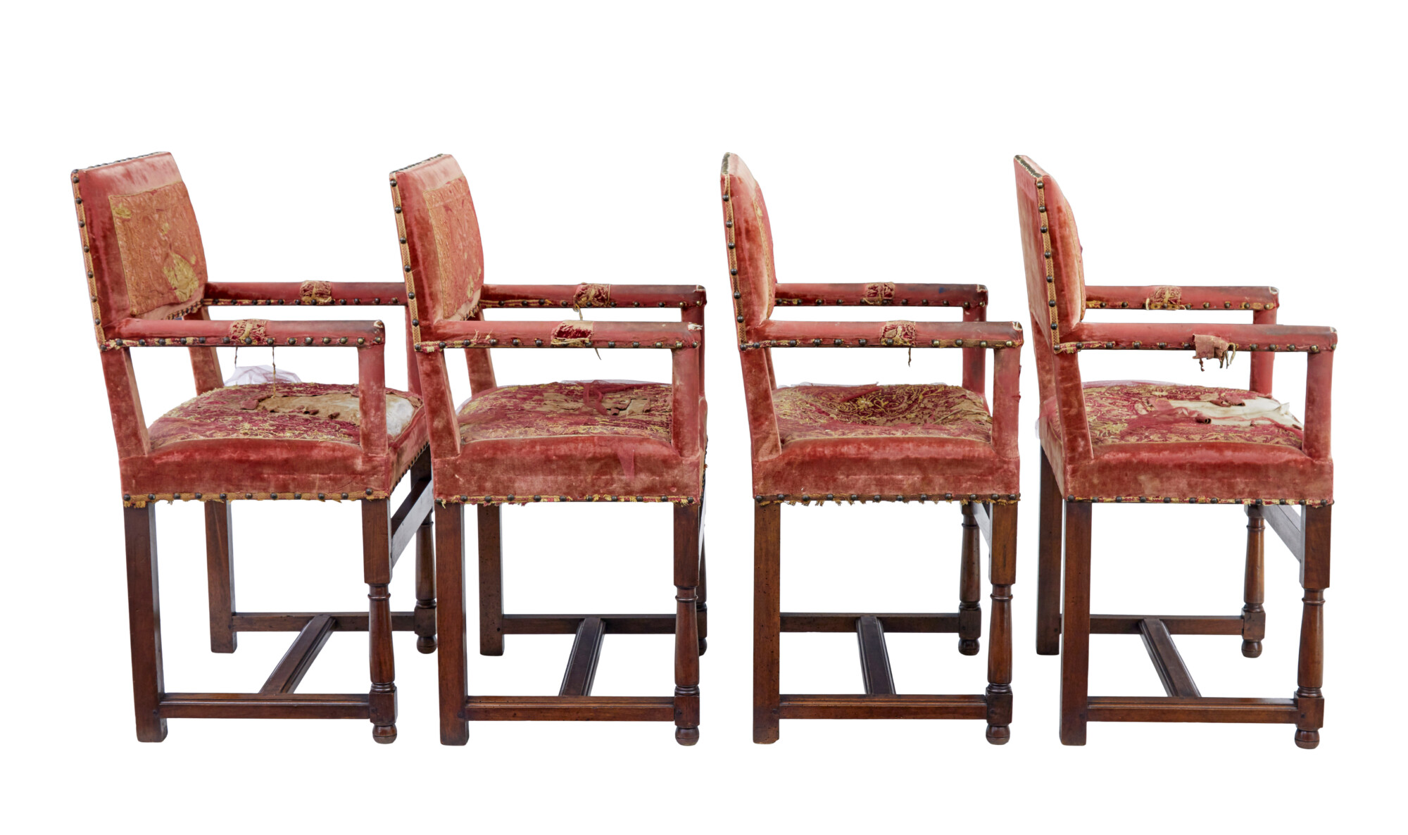 WE ARE PLEASED TO OFFER THIS RARE SET OF 4 CORONATION CHAIRS. STRAIGHT ARMS AND BACK, STANDING ON FRONT TURNED LEGS UNITED TO THE BACK LEGS BY STRETCHER. ALL MADE FROM SOLID WALNUT.