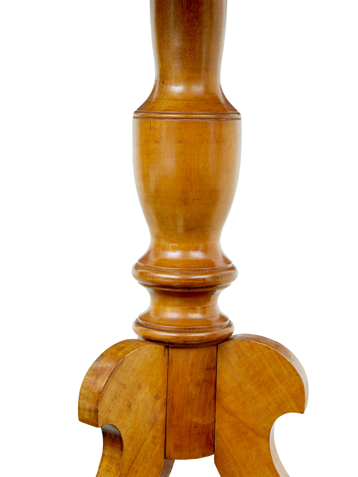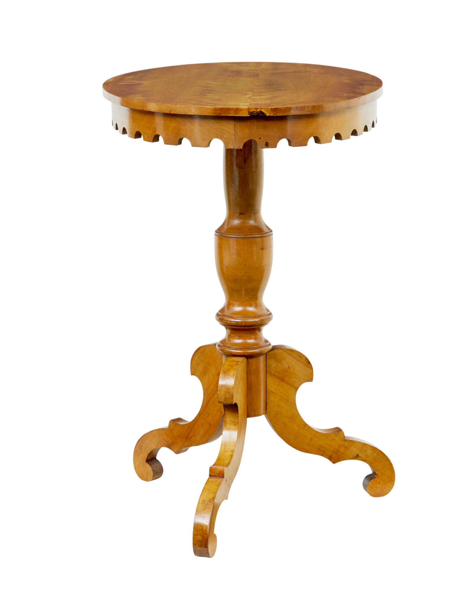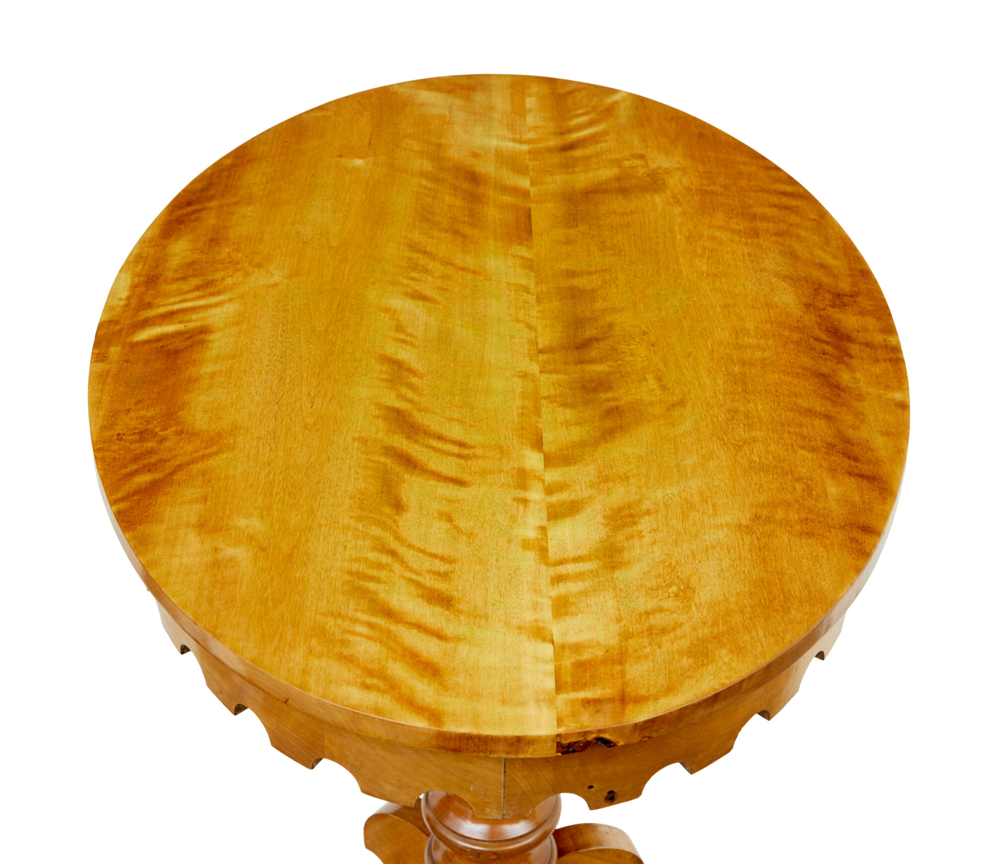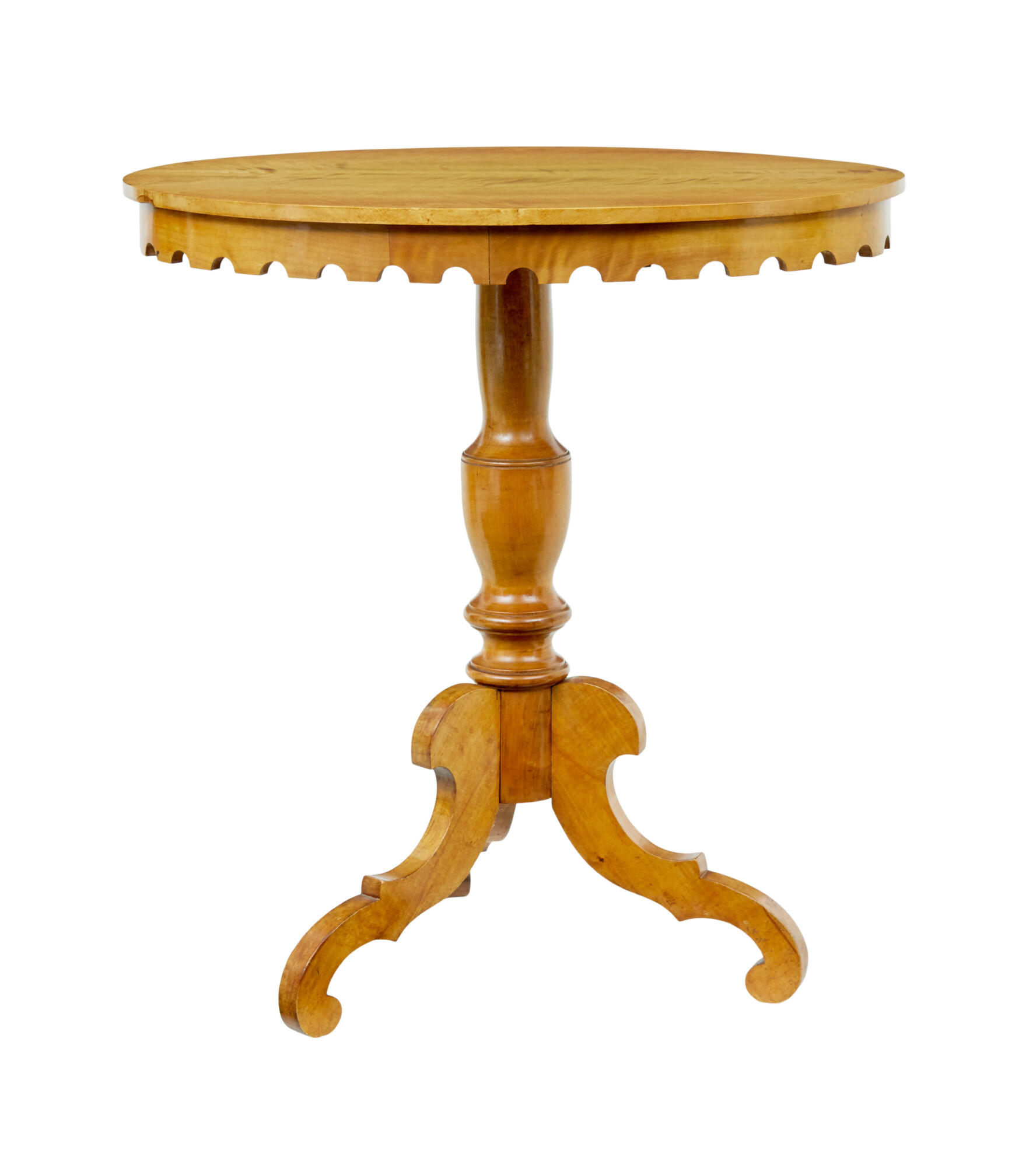 FLAME BIRCH TOP WHICH SLIGHTLY OVER HANGS THE SHAPED APRON. RAISED ON A TURNED BASE AND 3 DECORATIVE SCROLLED LEGS.