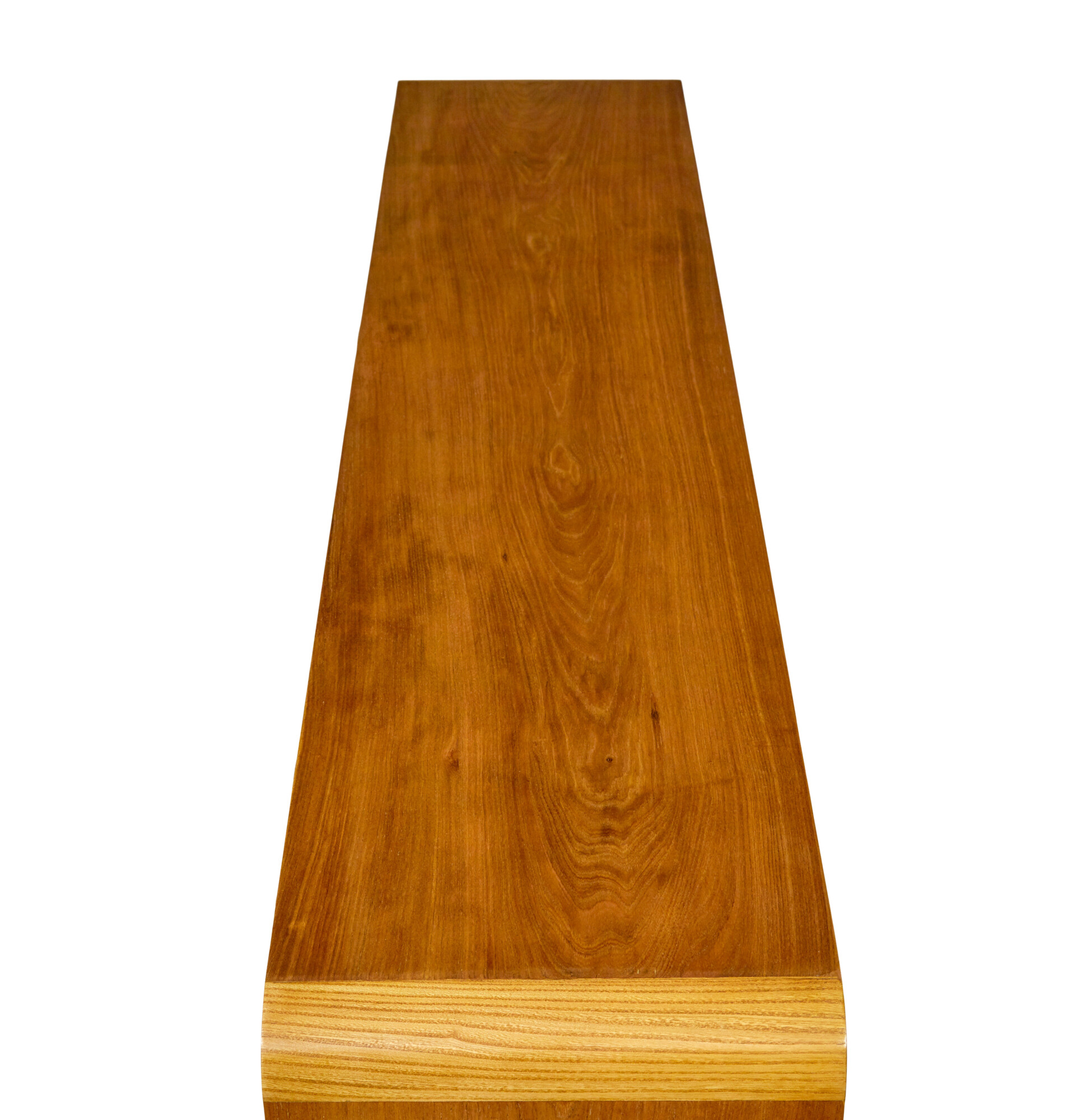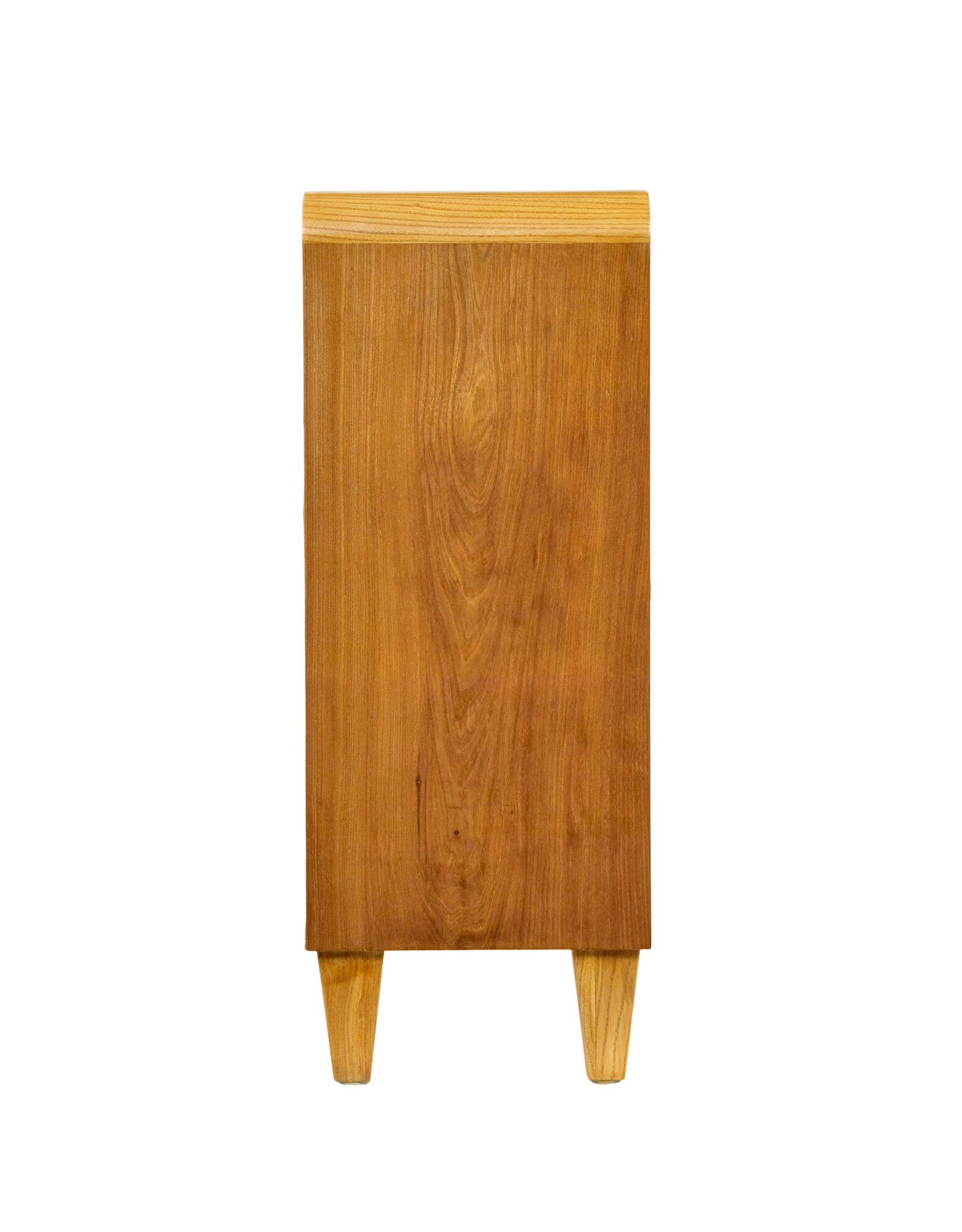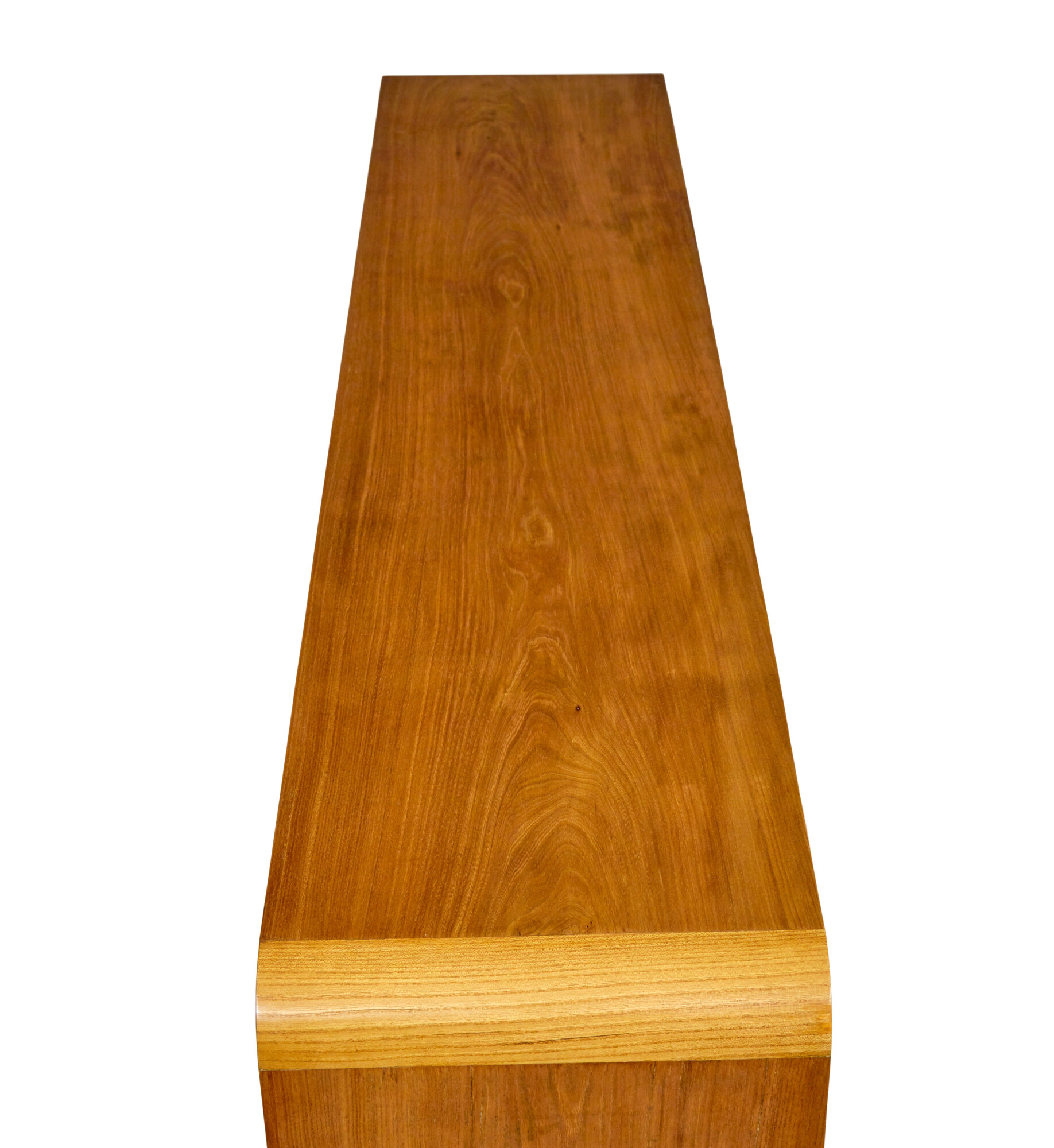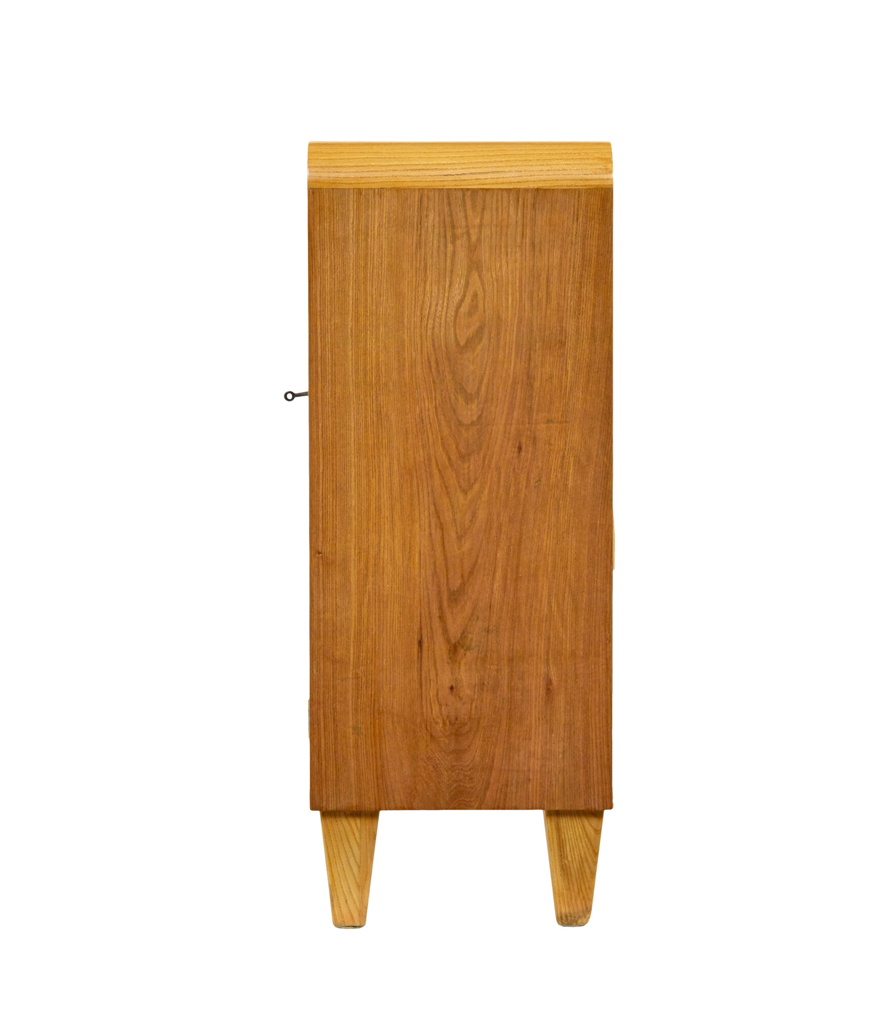 ELM VENEERED SIDES AND TOP WITH ROUNDED CORNERS. BELOW THE TOP SURFACE ARE 2 LOCKABLE DRAWERS AND A SINGLE DOOR CUPBOARD EACH VENEERED IN A GOLDEN BURR ELM.  CUPBOARD INTERIOR CONSISTS OF 2 ADJUSTABLE SHELVES.  MAIN APERTURE FOR BOOK OR DECORATIVE ITEMS COMES IN THE FORM OF A SINGLE ADJUSTABLE SHELF.  STANDING ON 4 TAPERED LEGS.