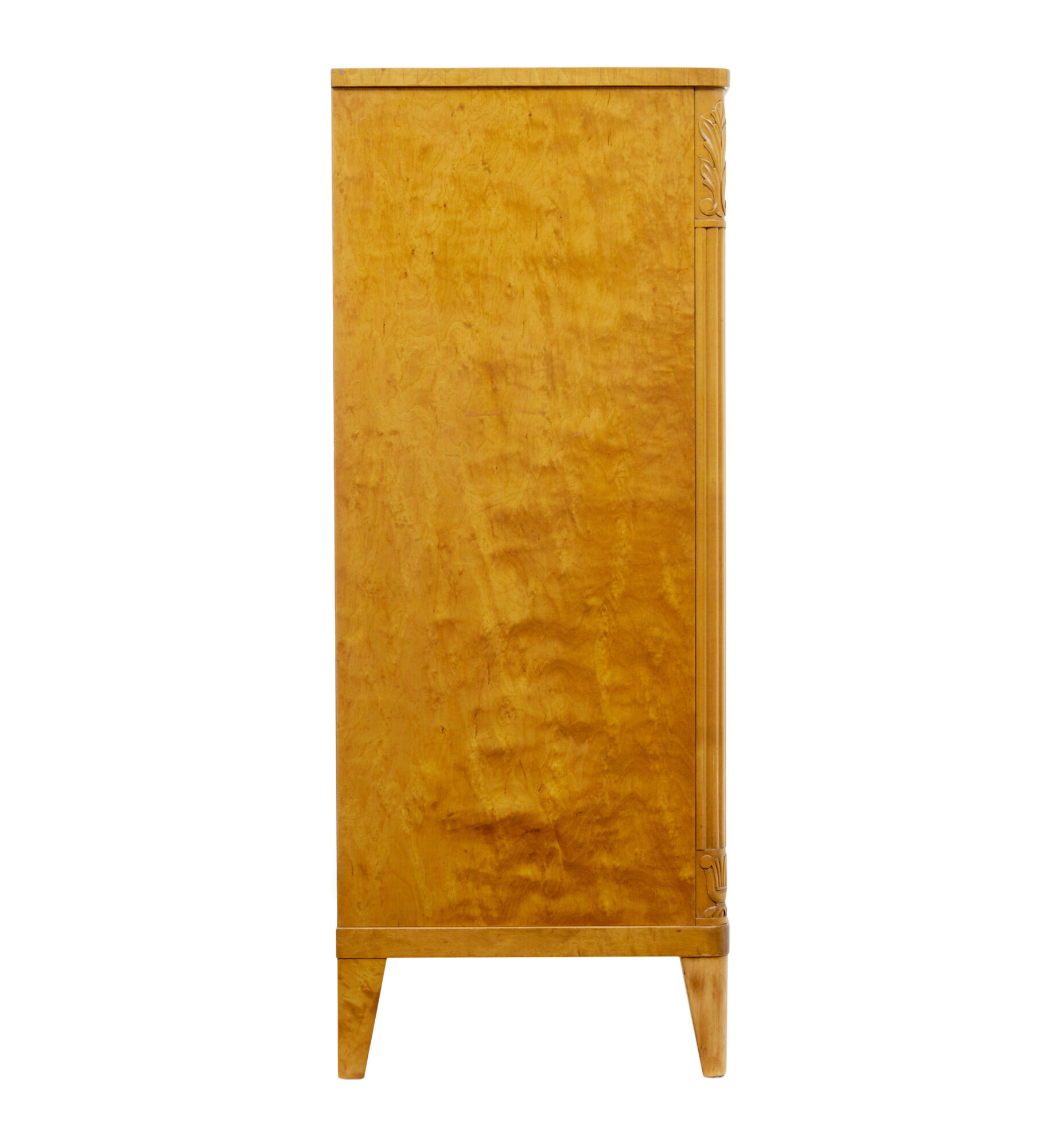 CARVED DETAILING TO FRONT EDGES, LEADING DOWN TO THE TAPERED LEGS. WORKING LOCKS AND KEY.