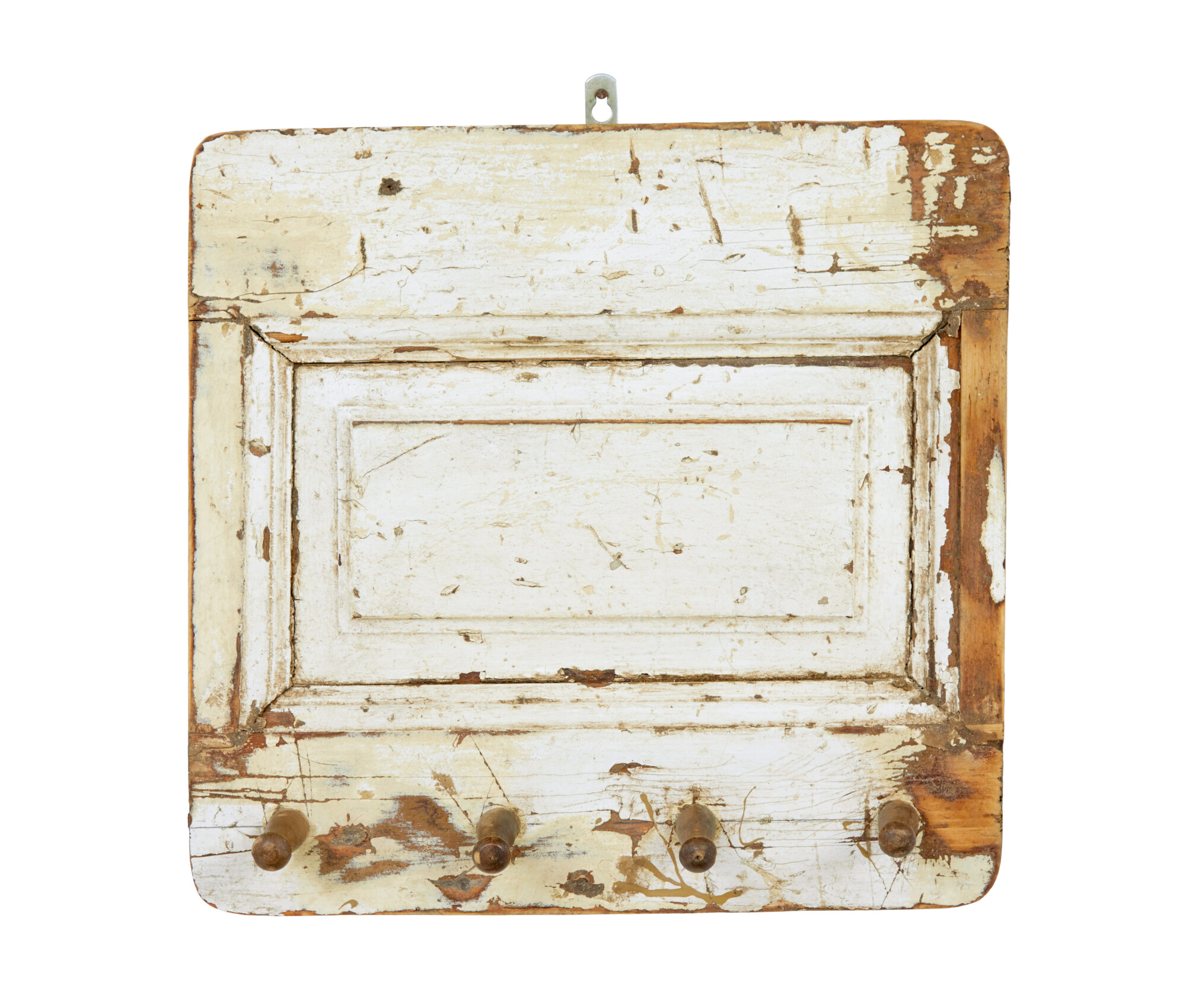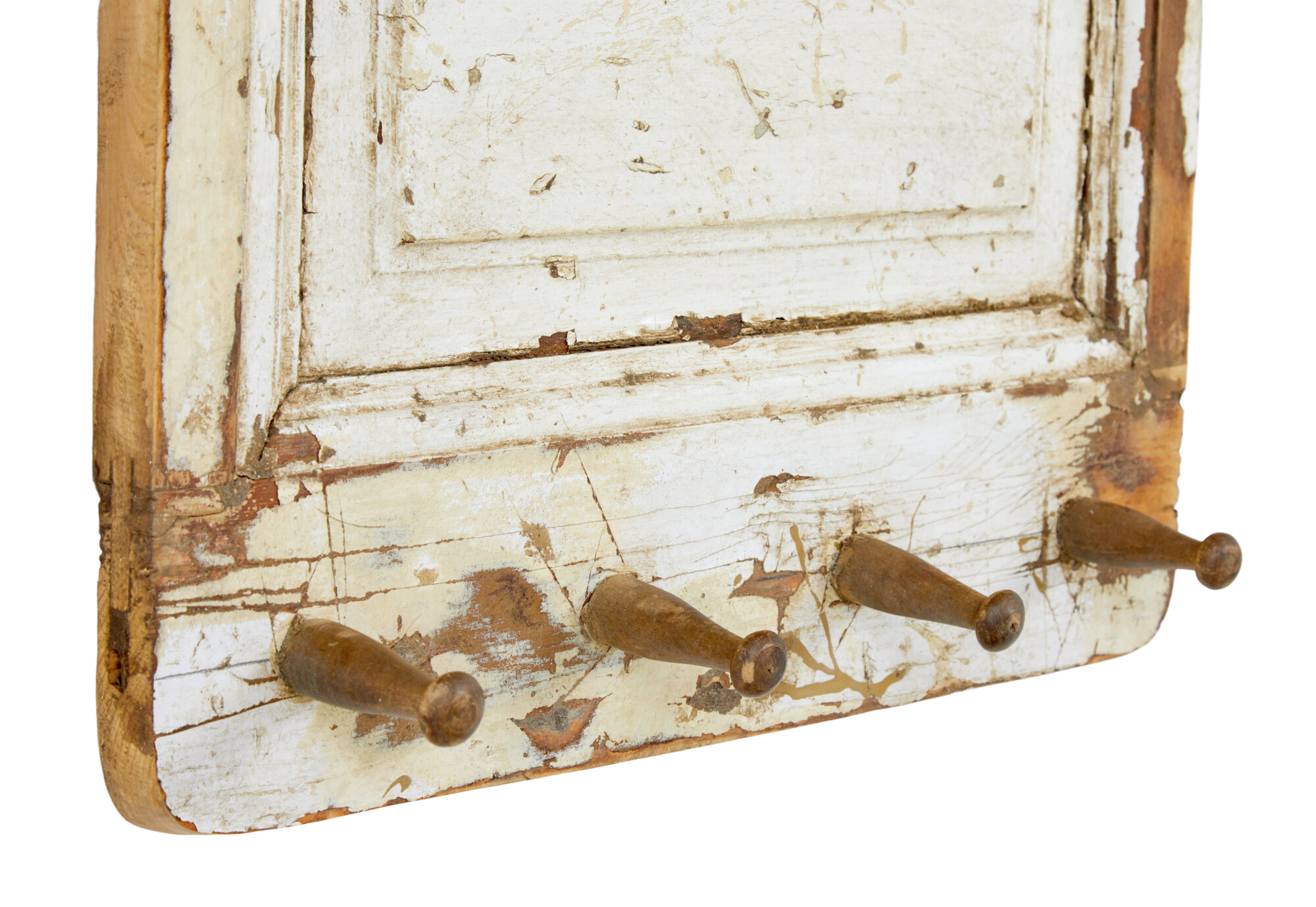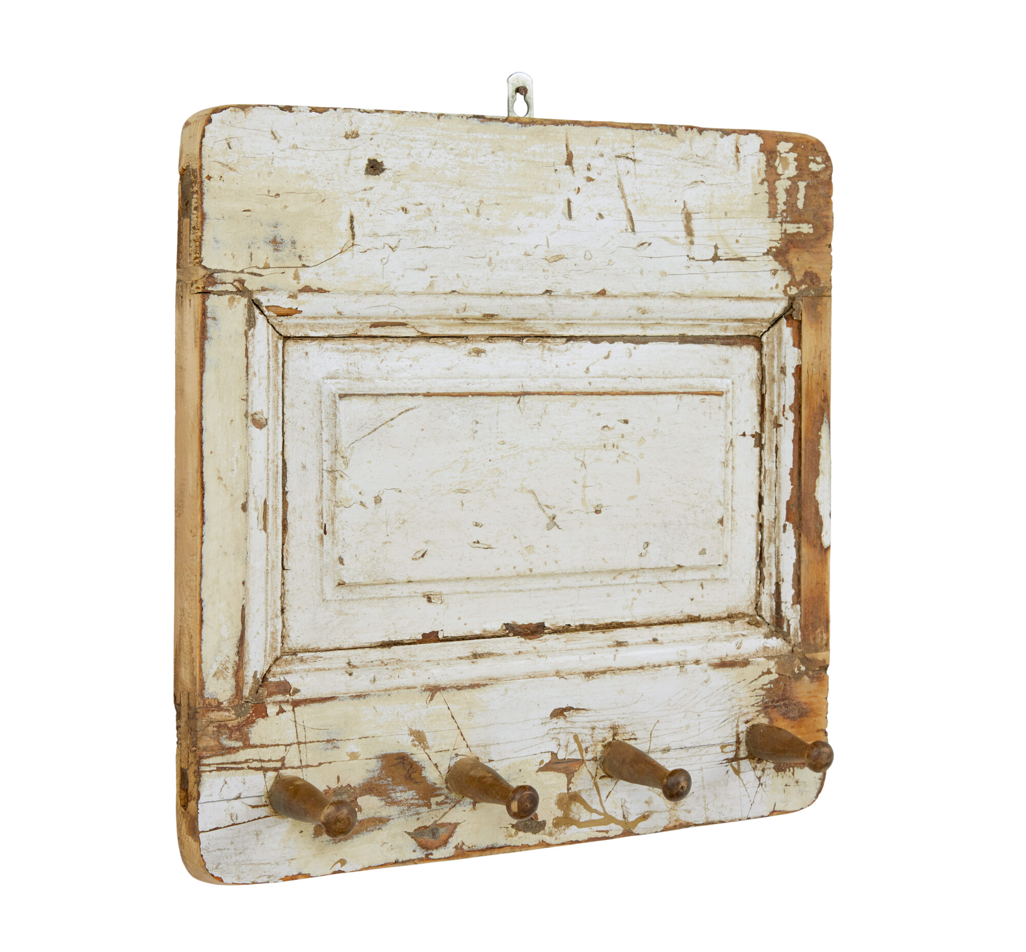 HERE WE PRESENT A 19TH CENTURY SWEDISH PAINTED PANEL THAT HAS BEEN ADAPTED IN THE MID 20TH CENTURY INTO A HANGING COAT PEG RAIL. USING PERIOD PEGS.