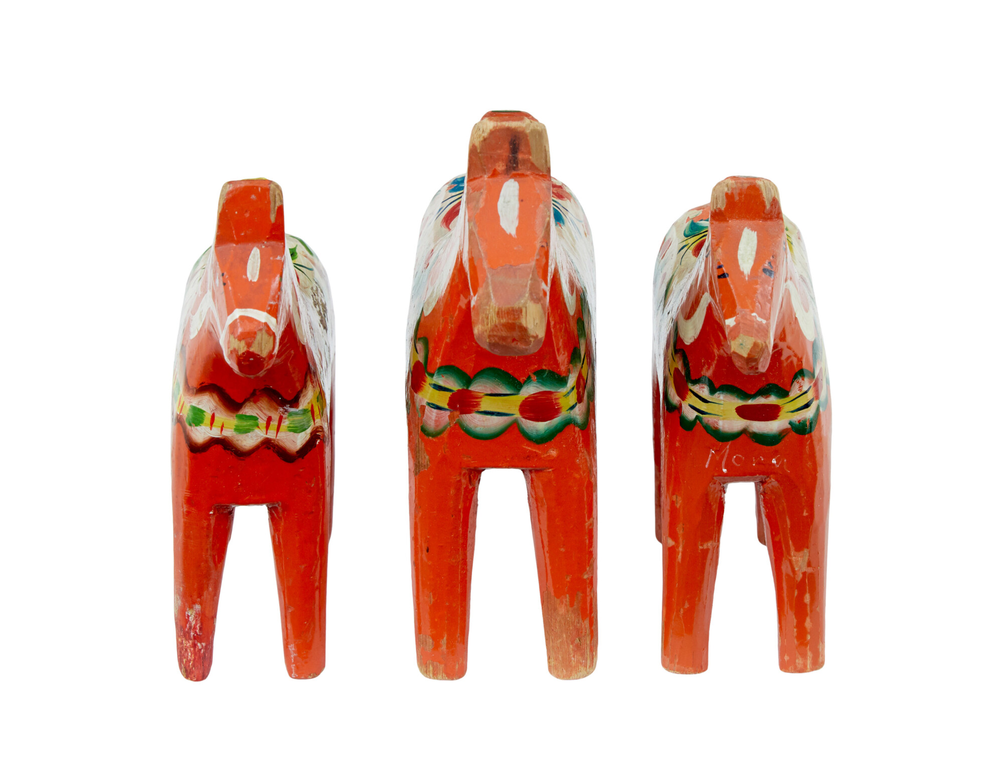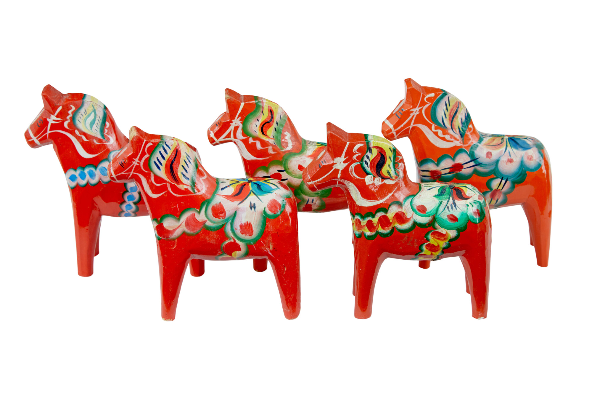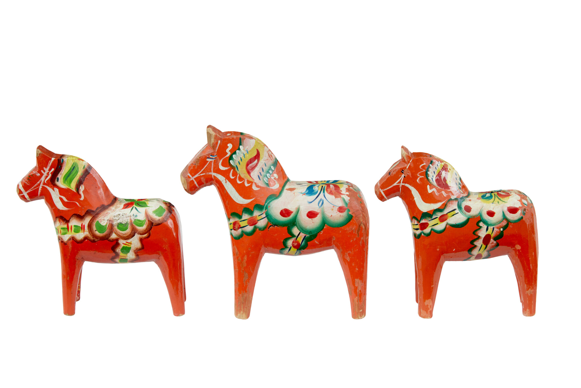 THE TRADITION OF PAINTING THESE HORSES BEGUN IN THE DALARNA REGION OF SWEDEN IN THE 17TH CENTURY. TYPICAL BASE RED WITH FLORAL KURBIT PATTERNS, INITIALLY MADE AS A CHILDREN’S TOY THE SOON BECAME PART OF SWEDISH FOLK ART.