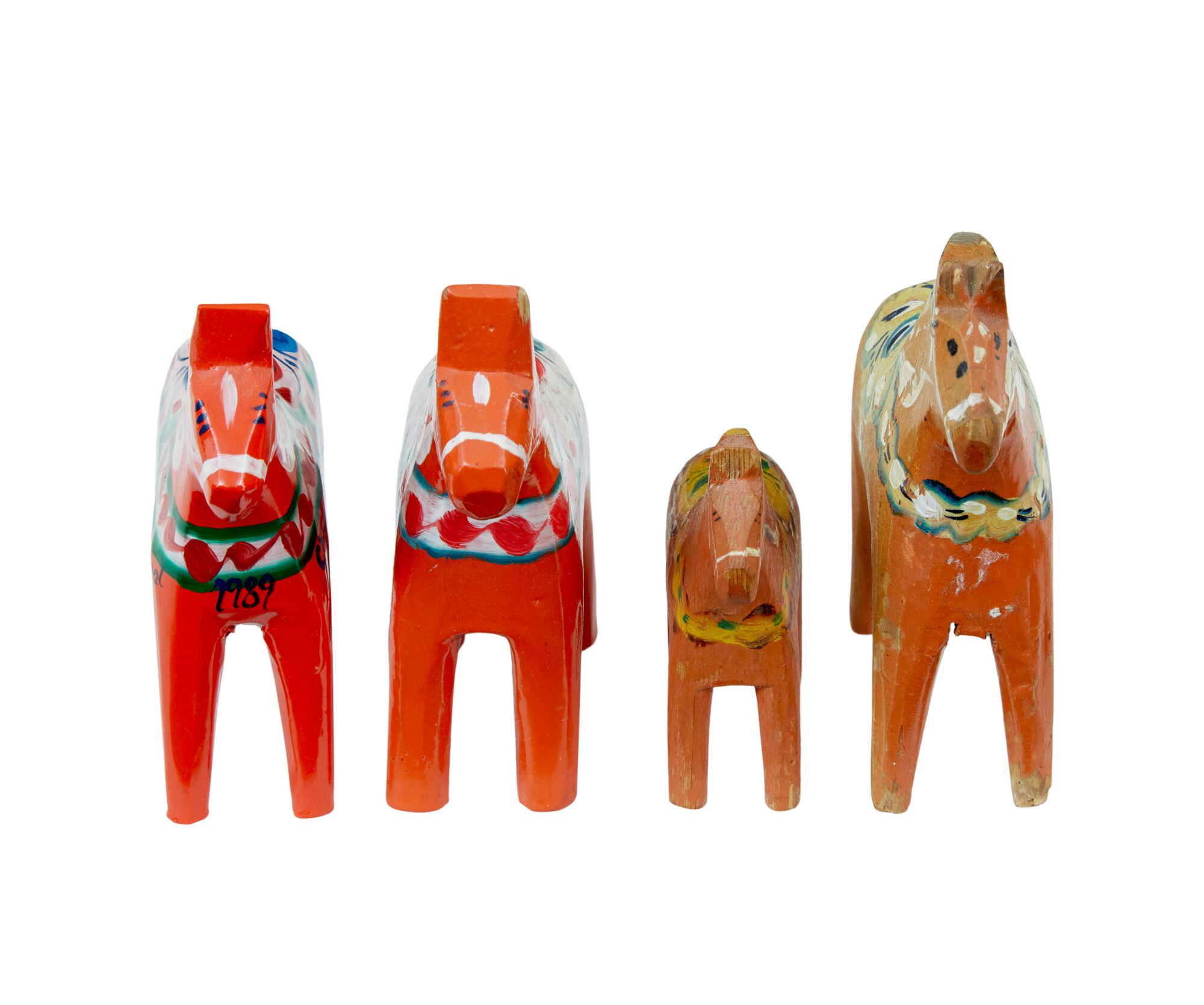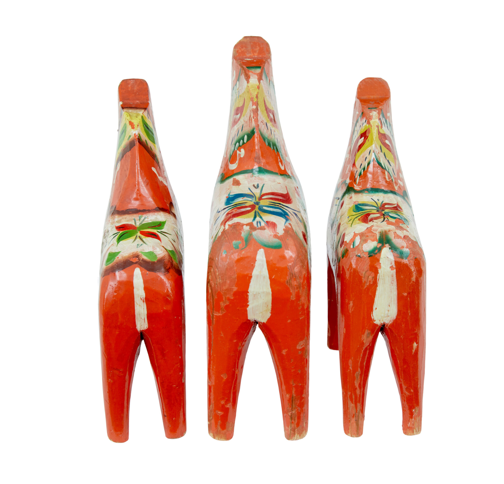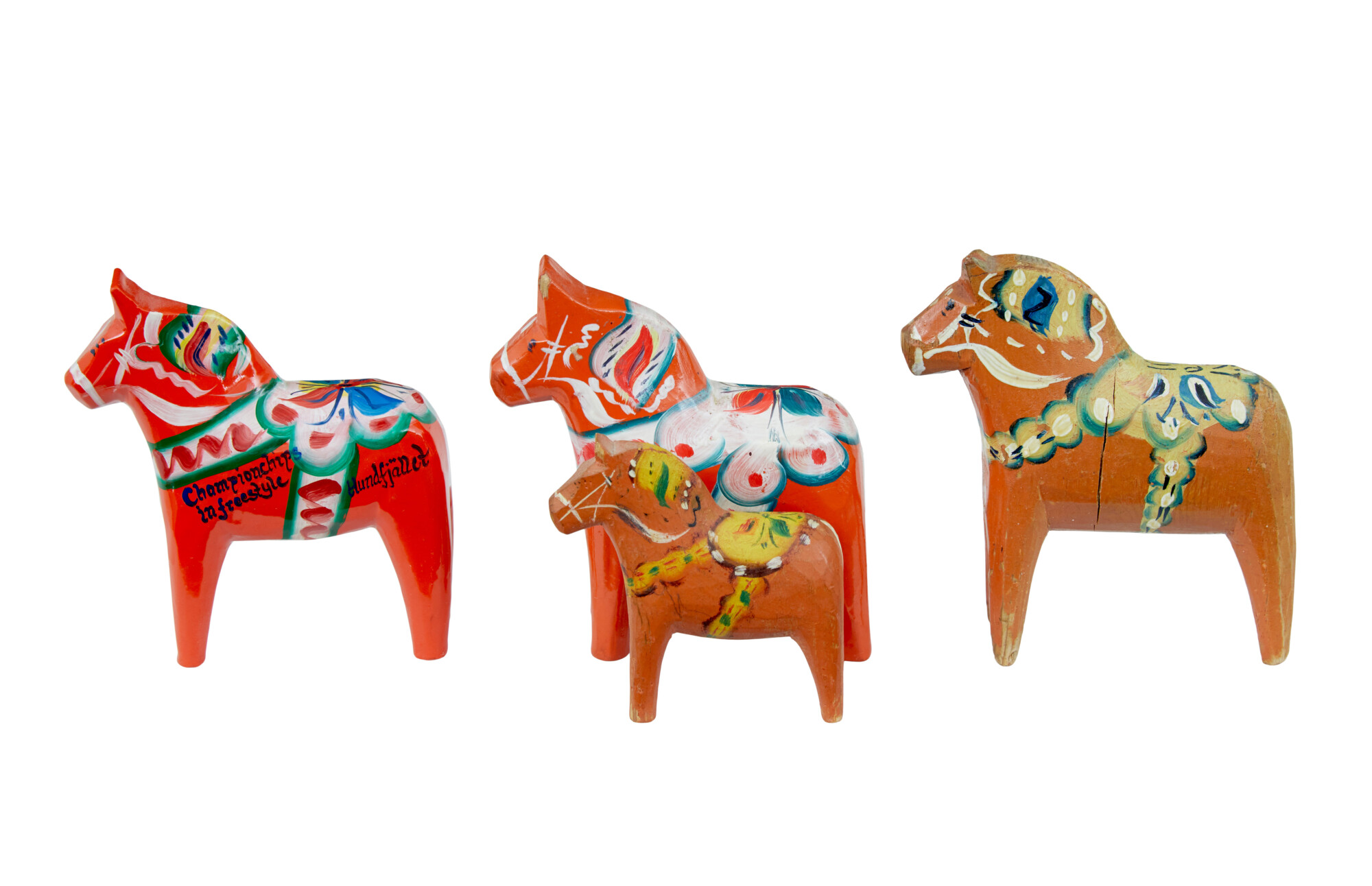 THE TRADITION OF PAINTING THESE HORSES BEGUN IN THE DALARNA REGION OF SWEDEN IN THE 17TH CENTURY. TYPICAL BASE RED WITH FLORAL KURBIT PATTERNS, INITIALLY MADE AS A CHILDREN’S TOY THE SOON BECAME PART OF SWEDISH FOLK ART.